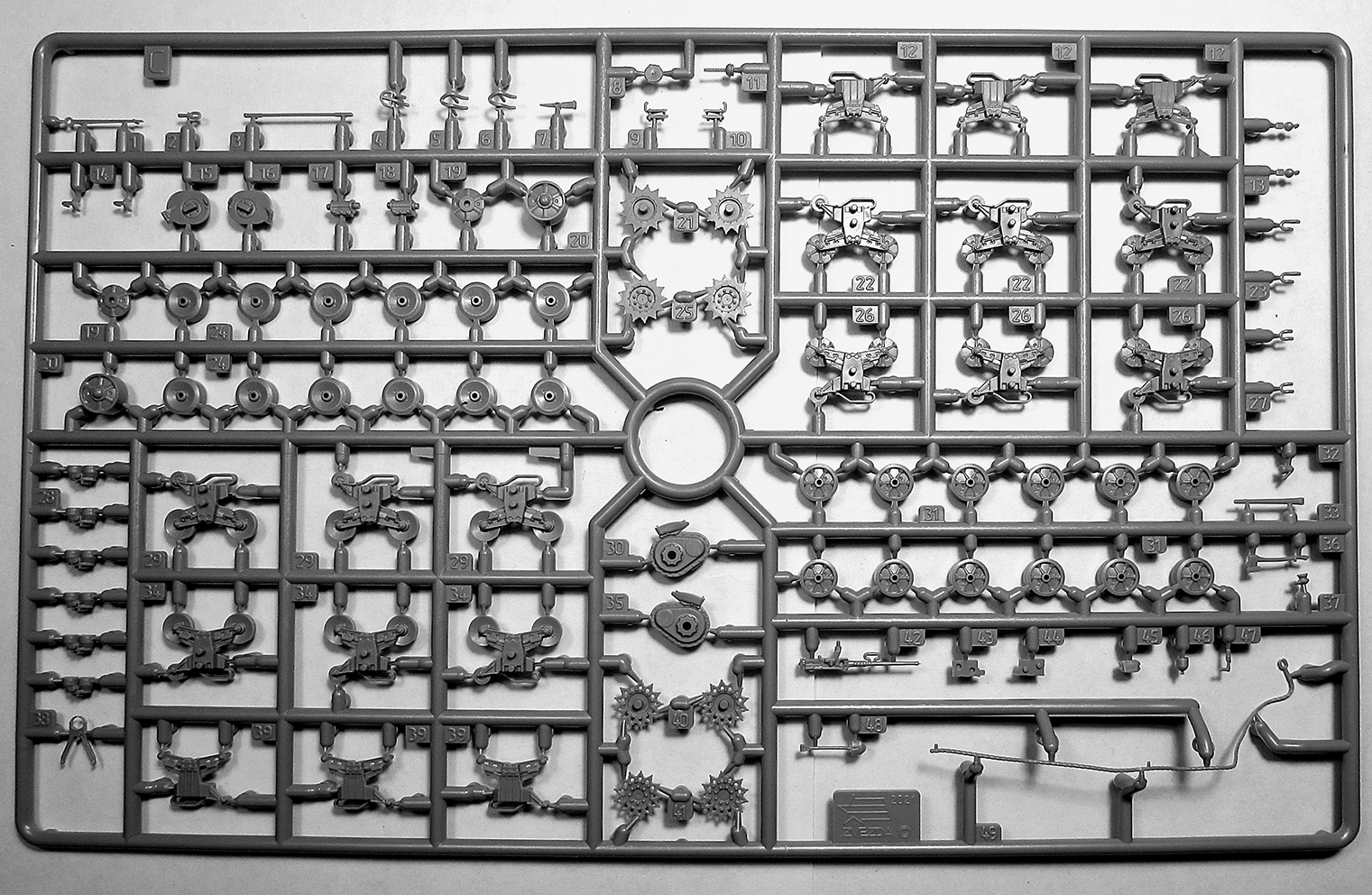 В наборе даны- декаль, инструкция, схема окраски на четыре варианта и три пластиковых литника- серого и чёрного цвета (гусеницы). Отдельно дана ванночка корпуса. Облоя не заметил. Детали ажурные и хорошо проработанны.