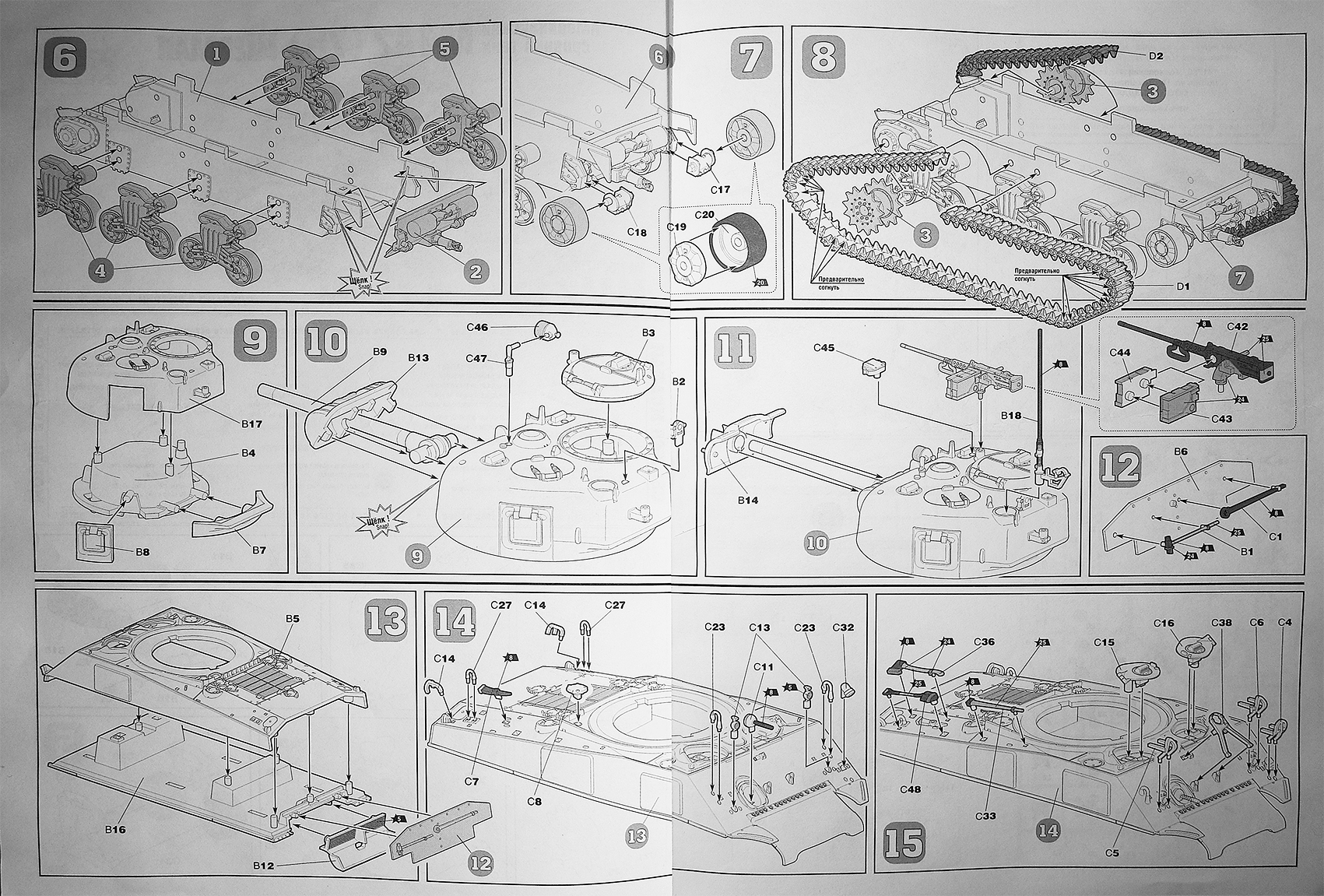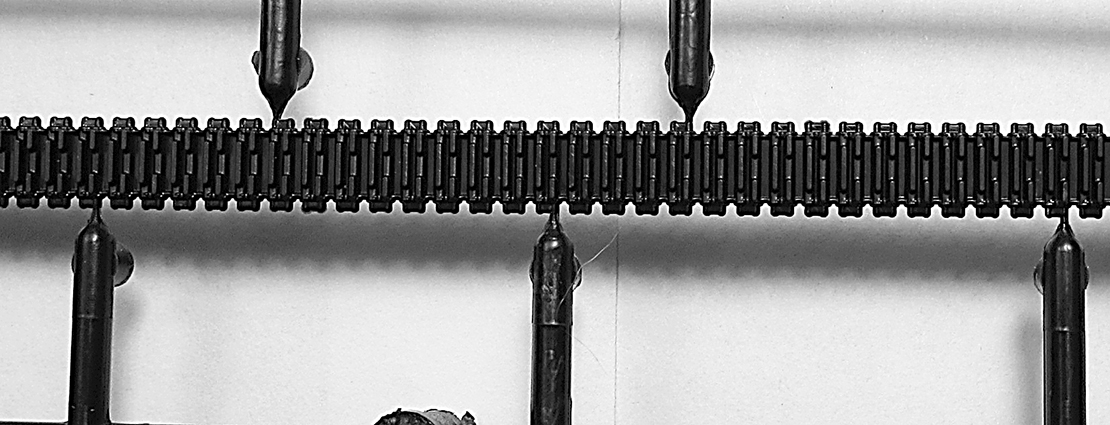 Гусеницы – хорошо пролиты, узор чёткий. Также, мне понравился новый подход Звезды- крепить их, благодаря небольшим штифтам, к корпусу танка.