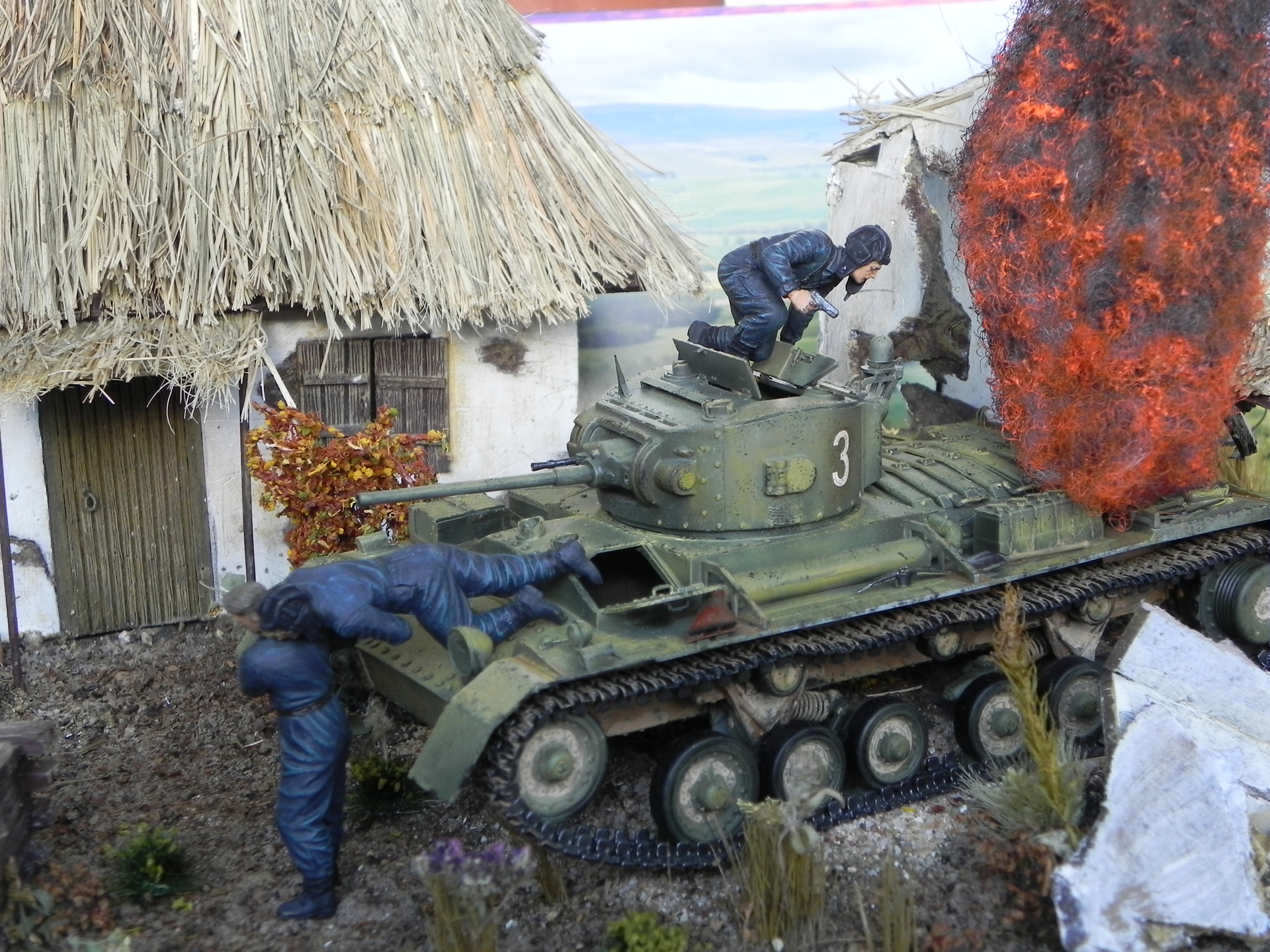 Всем привет. Закончил свою диораму. Танк от Miniart. Фигуры от Masterbox. Домик самодел. Окраска - акрил Vallejo плюс чуток пигментов.