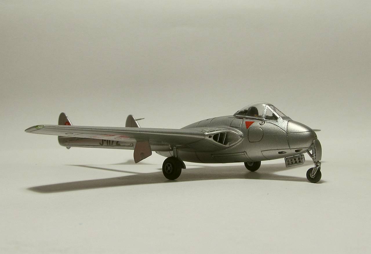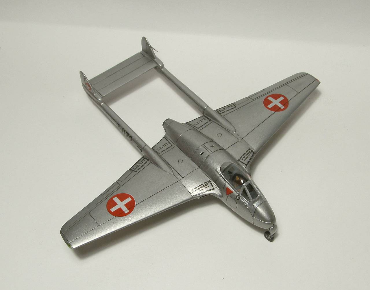 Набор, производства Бакинской фабрики игрушек в особом представлении не нуждается: без коробки и декали в жёстком, жутко шелестящем целлофановом пакете, дикий облой и утяжины - всё как мы любим. Волею случая, мне этого добра в конце 90-х досталось некоторое неприличное количество, так что и я и друзья-знакомые их тогда поклеили немало, но в виду уже помянутого недобрым словом качества наборов, особым изяществом эти модели не отличались. Где-то, примерно-наверно, в середине 00-х, я решил, что пора бы уже, однако, сделать "Вампир" как полагается, со всеми доступными мне тогда изысками. На тот момент, у меня это почти получилось, не хватило самой малости- декали. Модель встала на дальнюю полочку в ожидании деки, да так там и осталась. Давно собирался довести её до ума, в том числе и в рамках этого конкурса, ну и вот, наконец, решился. Как это выглядело перед началом работы и как она проходила можно посмотреть в соответствующей "сказке". План действий примерно был примерно такой: демонтировать шасси и фонарь, прошпаклевать утяжины (мне вот аж самому интересно, это я 15 лет назад так хреново шпаклевал, или шпаклёвка за годы усадку дала?), вышкурить по новой, поправить кривую и недорезанную расшивку, восстановить мелкую деталировку, ну и, соответственно, всё заново окрасить. Помимо перечисленного, были изготовлены БАНО, заменены колёса шасси (всё равно неправильные, но хоть издалека похожи), прорезаны отверстия гильзосборсов на "пузе" и некие овальные отверстия на "спине" самолёта. Так же выдавил новый фонарь взамен пожелтевшего старого; проточил вилку носового колеса (на фото всё равно не видно); само колесо, соответственно, пришлось ставить новое; перекрасил кокпит, добавил туда новую ручку управления с "бубликом" и спинку кресла с привязными ремнями. Окрашивал серебристой грунтовкой по пластику (автомобильная, некогда была сцежена из аэрозольного баллона). Декали, тоже раритетище от Эконики, если я ничего не путаю (урвал на "Я-моделисте" в разделе распродажа), но перевелись, на удивление, неплохо, хотя от подложки отделялись с некоторым трудом. Расшивку, по старой своей привычке, выделял, преимущественно, простым карандашом и, немного, жидким акрилом на "Фейри".