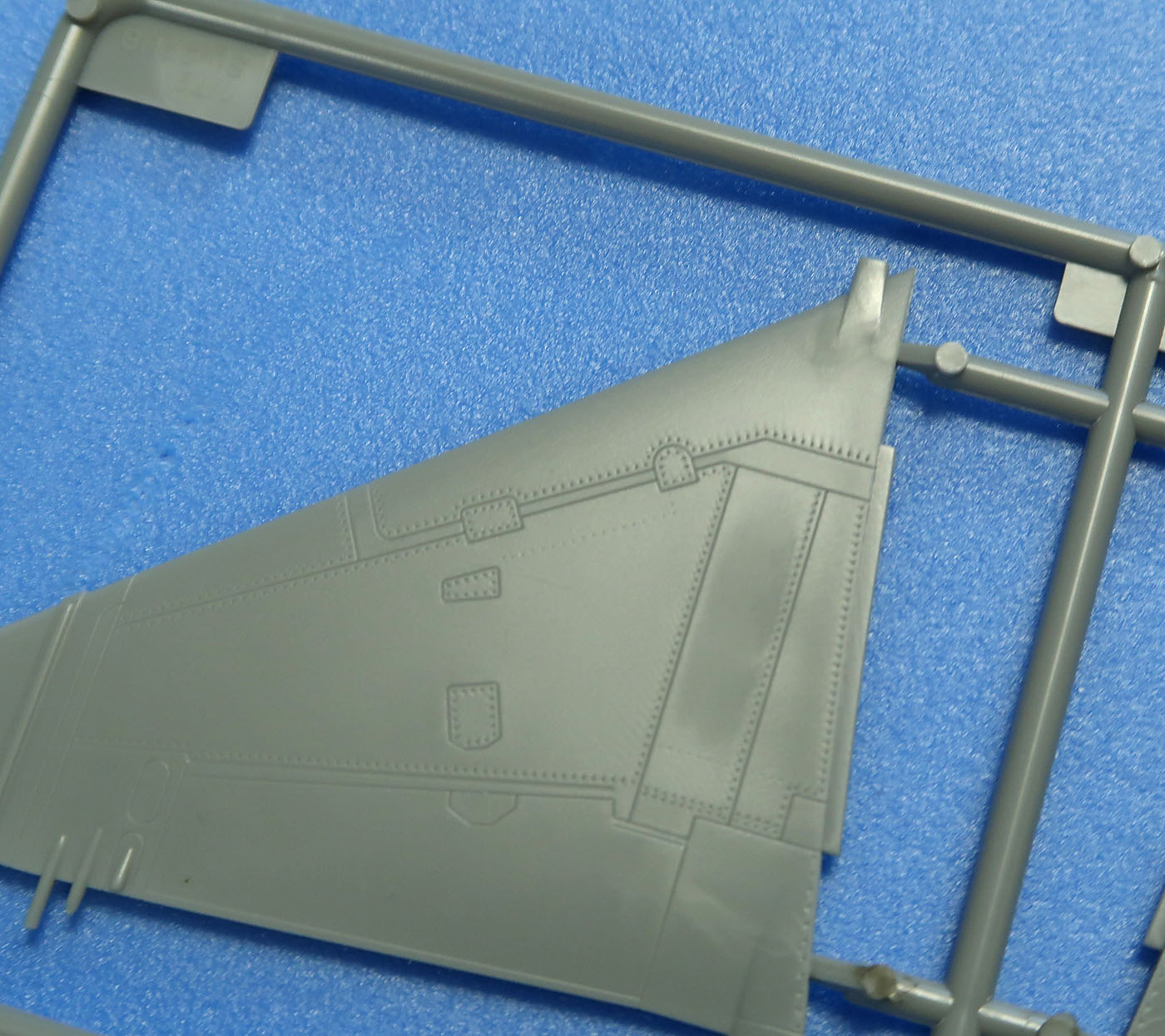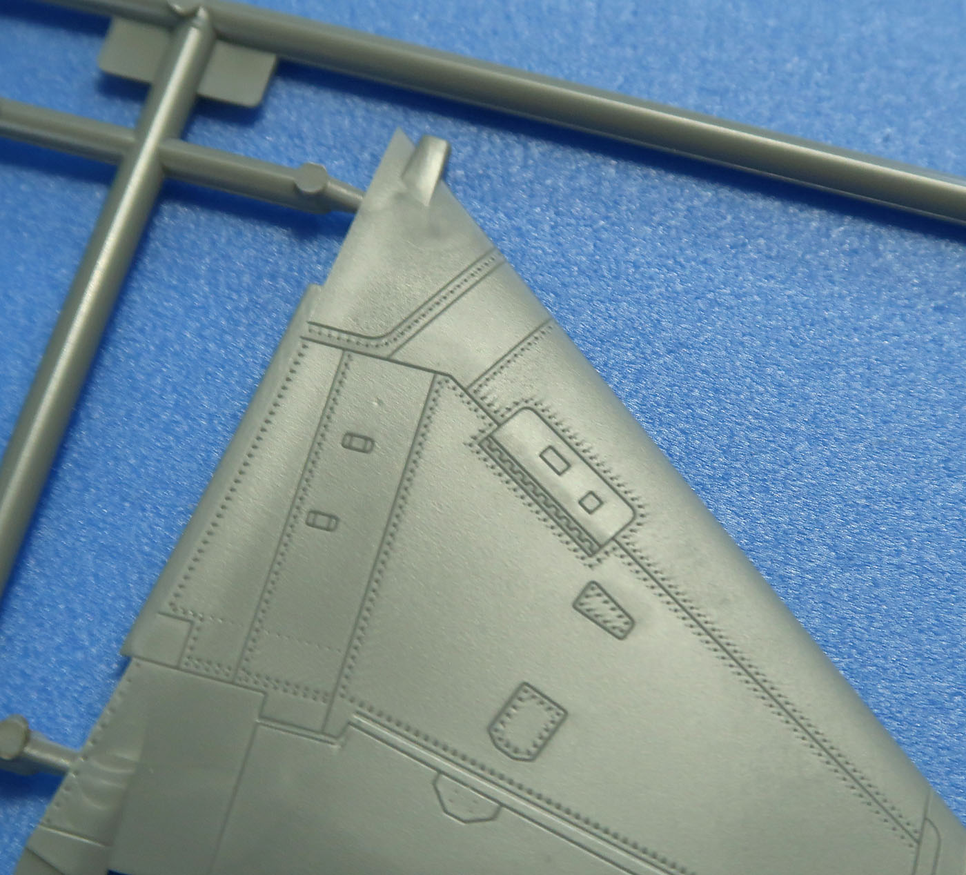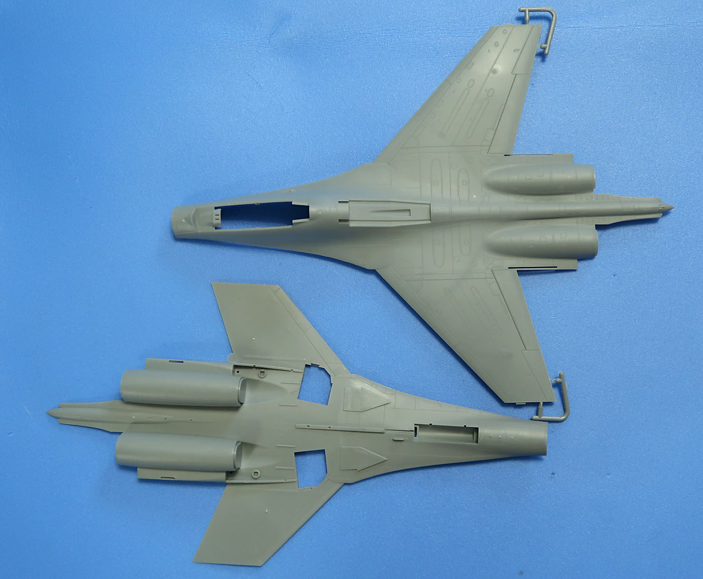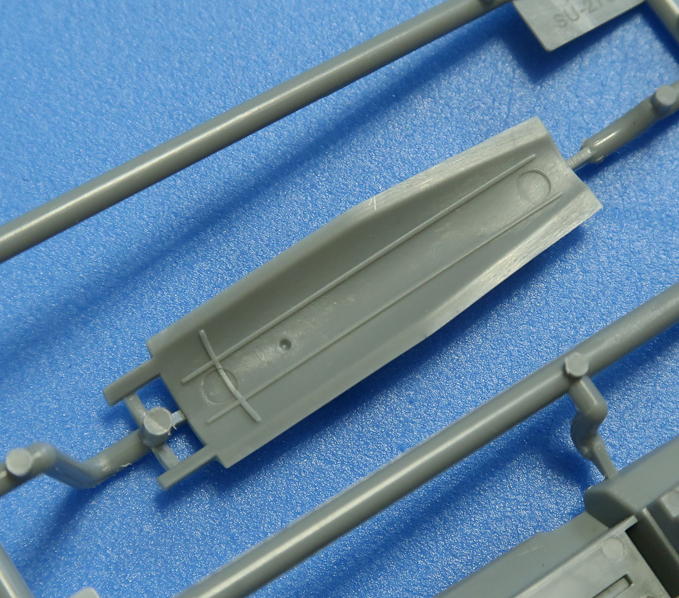 Расшивка глубже, чем у Звезды. Клепка есть в отличие от Звезды. Геометрия хуже. Пластик у Trumpeter мне нравится меньше, чем у Звезды. Он тверже, на нем сложнее перенарезать расшивку. Из-за унификаций пресс-форм Су-27СМ и УБ у Звезды, верхняя часть фюзеляж УБшки состоит из двух частей - лишний стык и место для обработки.