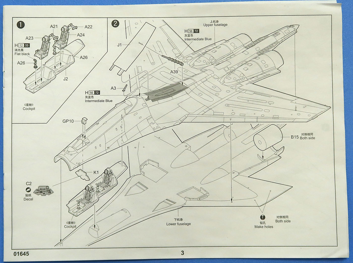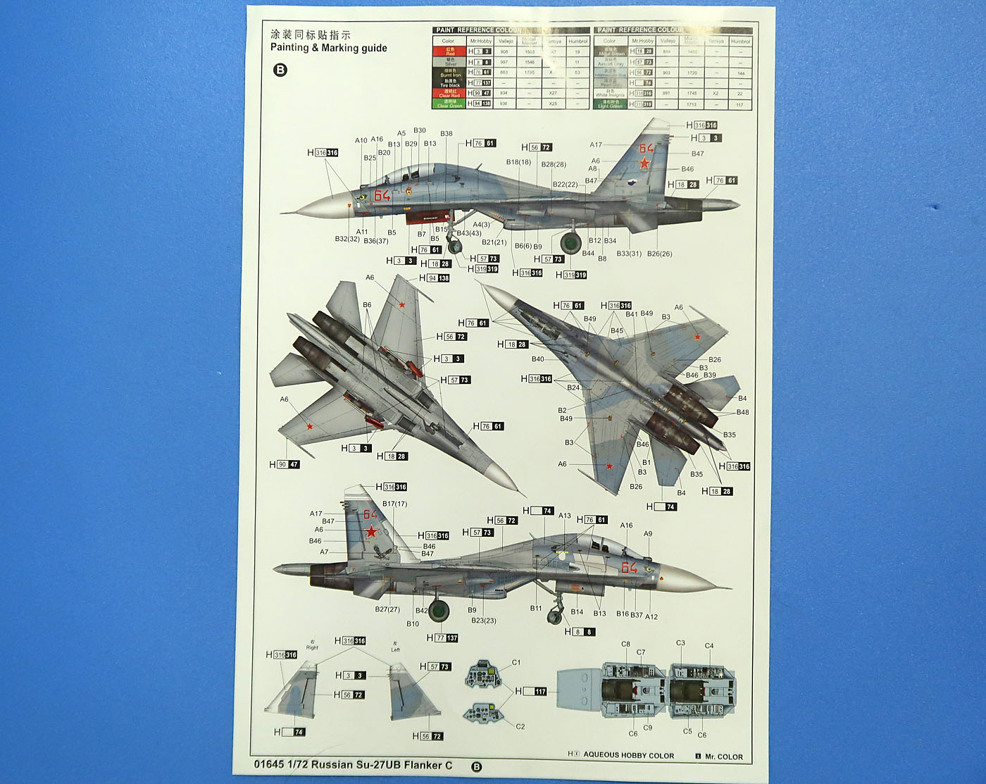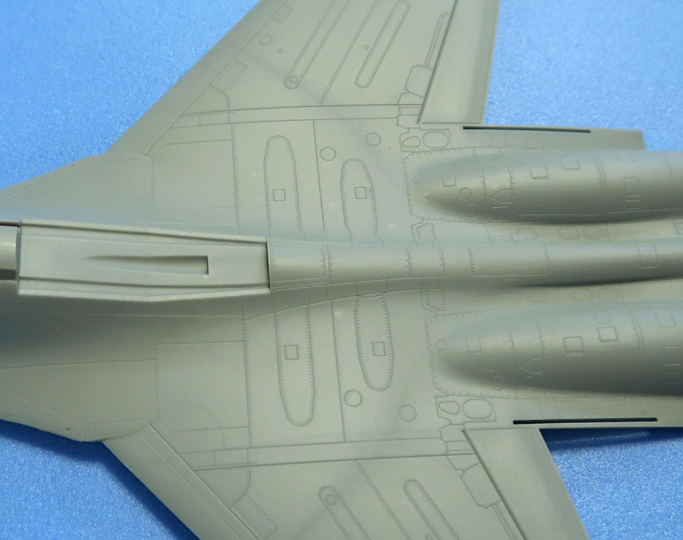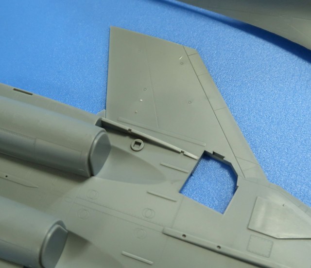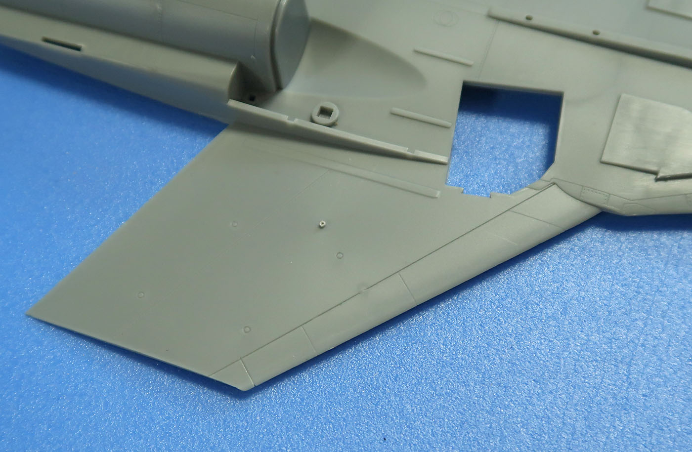 Расшивка глубже, чем у Звезды. Клепка есть в отличие от Звезды. Геометрия хуже. Пластик у Trumpeter мне нравится меньше, чем у Звезды. Он тверже, на нем сложнее перенарезать расшивку. Из-за унификаций пресс-форм Су-27СМ и УБ у Звезды, верхняя часть фюзеляж УБшки состоит из двух частей - лишний стык и место для обработки.