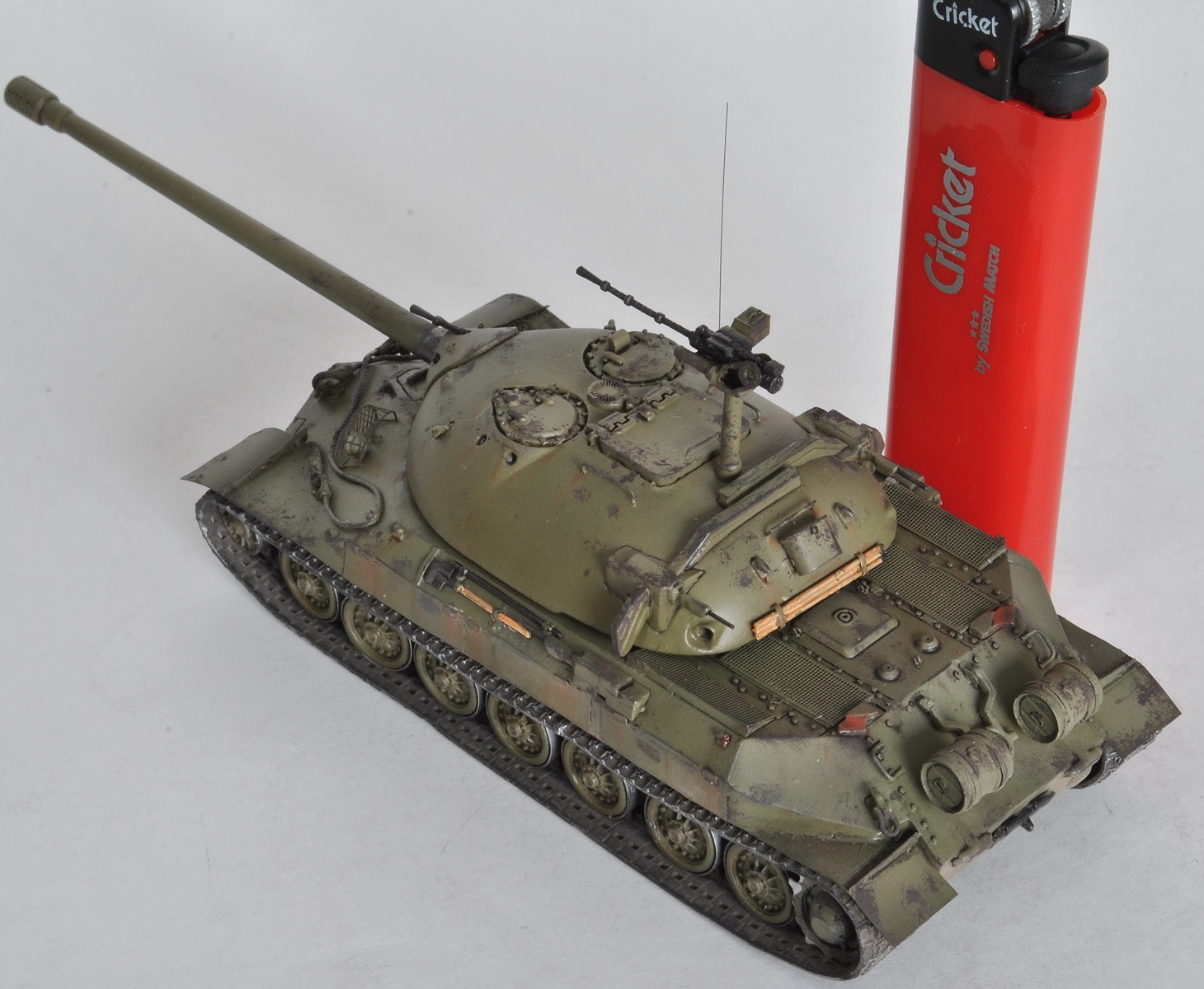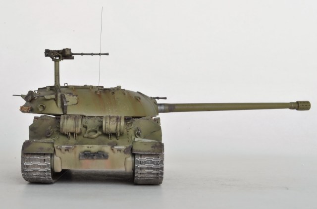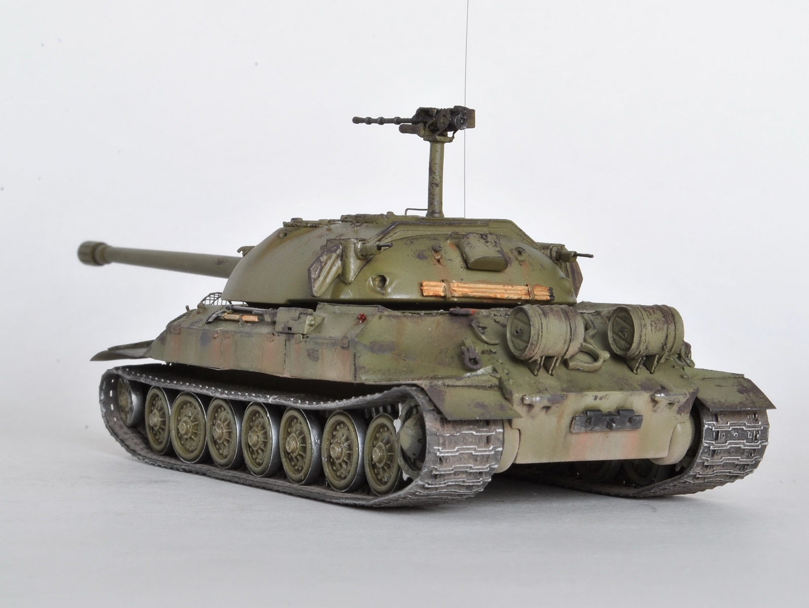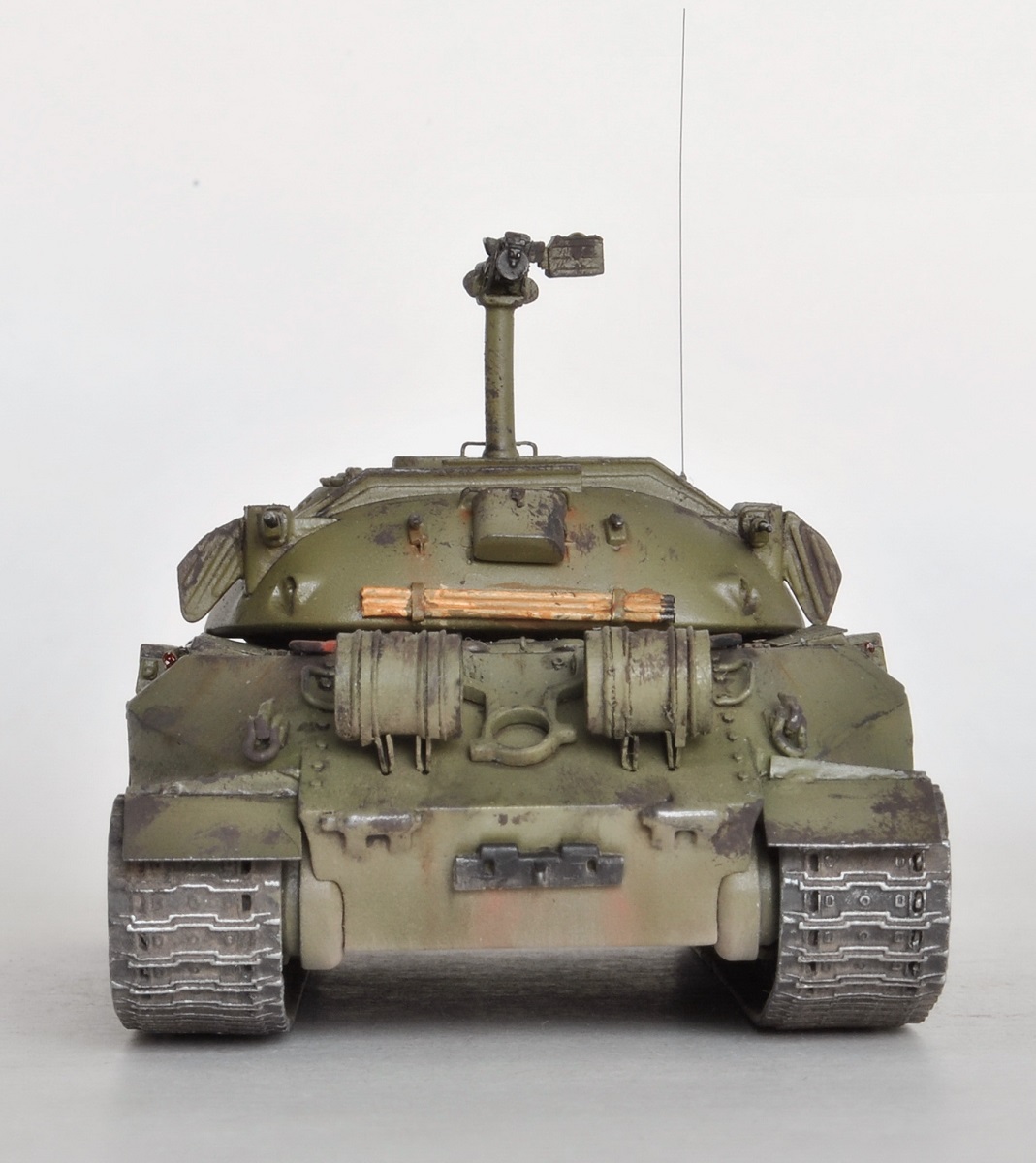 В матчасть тут сильно не влезал. Кривой смоляной ствол, а вслед за ним и убогие дымовые шашки сразу полетели в мусорку, часть деталей вообще не указана в инструкции, пришлось руководствоваться фотографиями. Банник совсем никуда не годиться, переделал. Ходовая по копийности слабовата, а гусеницы мне так и не удалось победить до конца. Шанцевый инструмент, тросы и их крепление, мелочевка полностью отсутствуют – пришлось выкручиваться самому. Вместо 14,5 мм пулеметов КПВ-44 Григоров предлагает КПВТ – оставил на его совести. Все доработки, как обычно, -- на допокрасочных фото.
