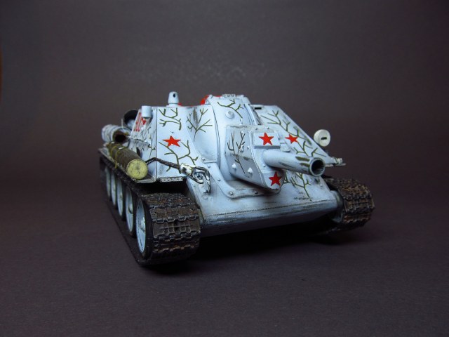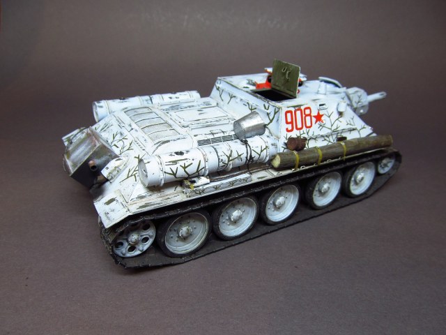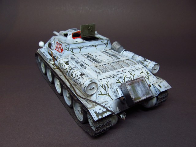 За вариант окраски сразу, еще при покупке, выбрал вариант, предложенный на бокс-арте коробки, изображающий машину, действовавшую на Ленинградском фронте в марте-апреле 1943 года. Зимний камуфляж машины для меня фактически Terra incognita (был опыт окраски Панцерягера на зимней диорамке, но это было так, не серьезно). Красил модель акриловыми красками от "Звезды", номера-звезды- веточки камуфляжа рисовал кистью. Очень кстати к этому варианту окраски пришлась печка, закрепленная на корме самоходки ("Звезда" дает их в каждом своем наборе "тридцатьчетверок", и их у меня уже скопилось столько,что хватит для обогрева танкового взвода)))). Была мысль нанести на модель имитацию снега, но отказался от нее по причине того, что модель пока на полку, а если в дальнейшем пойдет на зимнюю диораму, вот тогда применительно к сюжету снег и стоит наносить.