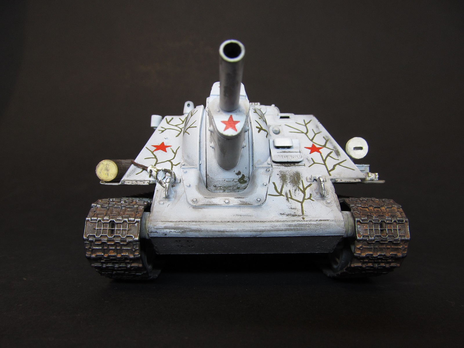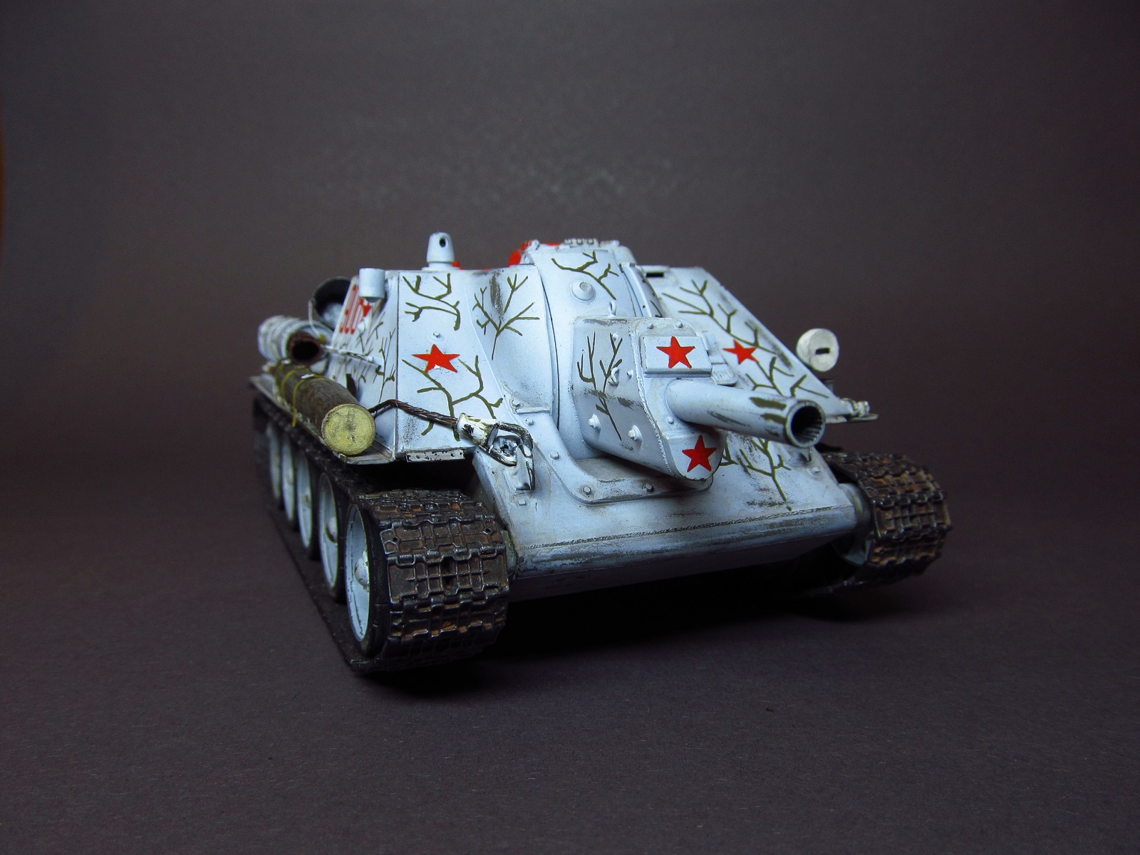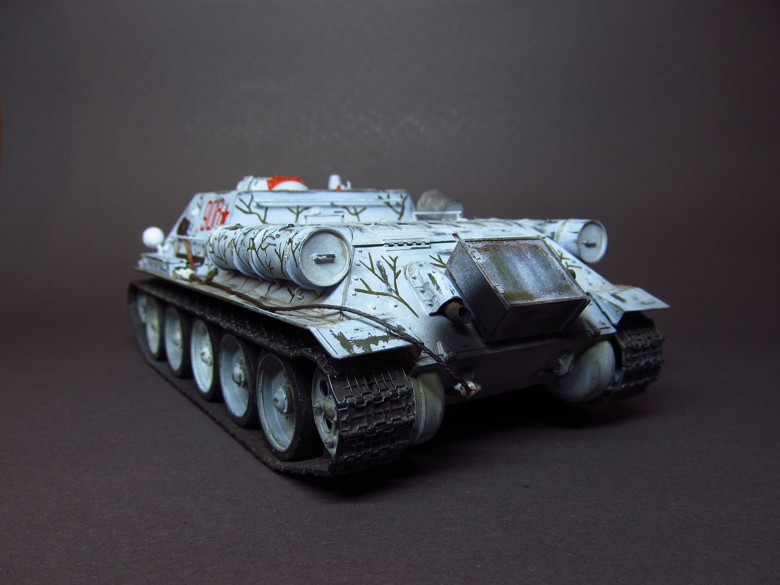 благодарю вас за ваше внимание и отзывы, друзья! Вопрос о загрязнении белого камо неоднозначен: с одной стороны, да, кажется, что он должен быть сильно замызган, да и работ в сети море, где зимник на модели зачумлен донельзя- это кажется очень естественным и логичным. А с другой стороны есть исторические фото, где видно, что белый камуфляж все же остается белым, а не замызганным. И, кстати, обратите внимание, что на первой фото хорошо видно, что оттепель, белых сугробов нет, а самоходка чистая и белая. Вот на эти фото и ориентировался в работе.