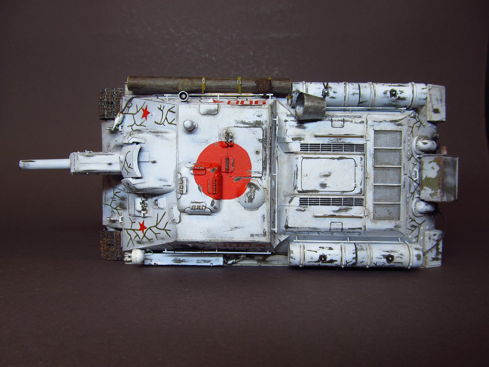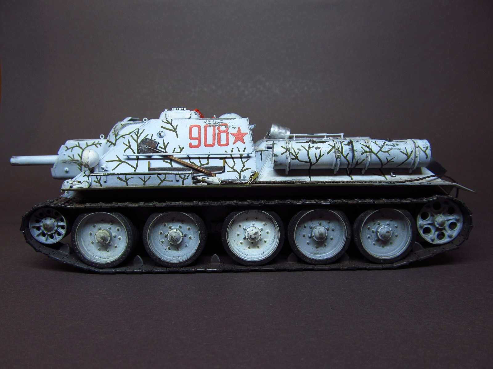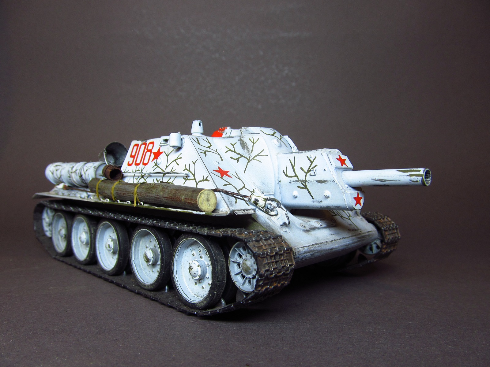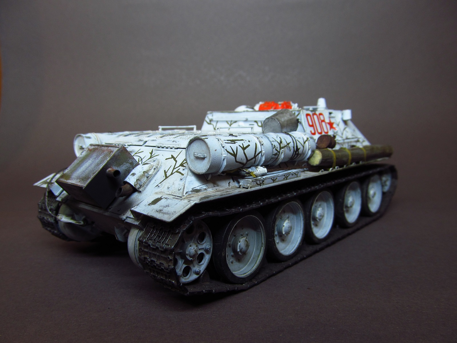 благодарю вас за ваше внимание и отзывы, друзья! Вопрос о загрязнении белого камо неоднозначен: с одной стороны, да, кажется, что он должен быть сильно замызган, да и работ в сети море, где зимник на модели зачумлен донельзя- это кажется очень естественным и логичным. А с другой стороны есть исторические фото, где видно, что белый камуфляж все же остается белым, а не замызганным. И, кстати, обратите внимание, что на первой фото хорошо видно, что оттепель, белых сугробов нет, а самоходка чистая и белая. Вот на эти фото и ориентировался в работе.