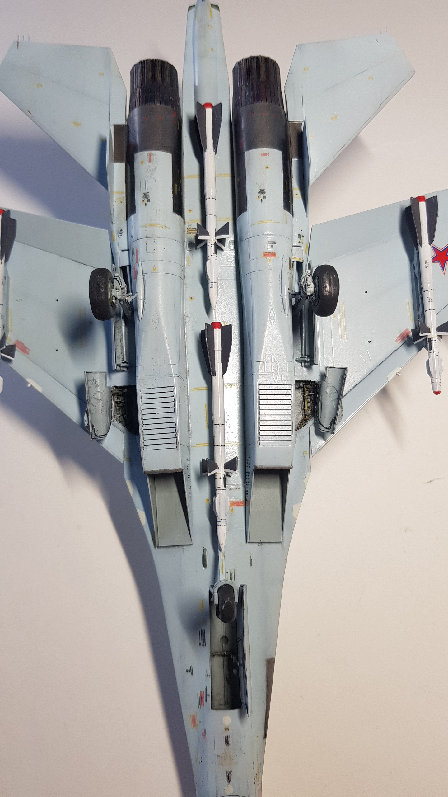 Хорошая работа! Цвета аутентичные, окраска аккуратная, клеточной расшивки нет, обгадинга тоже - все очень приятно глазу!)) По схеме окраски на левой половине стаба цвета местами перепутаны и в некоторых местах к очертаниям пятен вопросы - но некритично ни разу)) Пока что глаз зацепился за пару моментов - створки ниш шасси изнутри не красные как должно быть и р/п панель на правом киле снаружи накрашена, а изнутри нет)) Ну и если модель демонстрирует первые дземгинские СМы (на что намекает р/п панель на киле зеленого цвета при всех остальных РПО белого), то дублирующий бортовой номер у них на килях того же размера, что и основной. Опять же антенны на гроте за кабиной как на СМ3, непонятно))