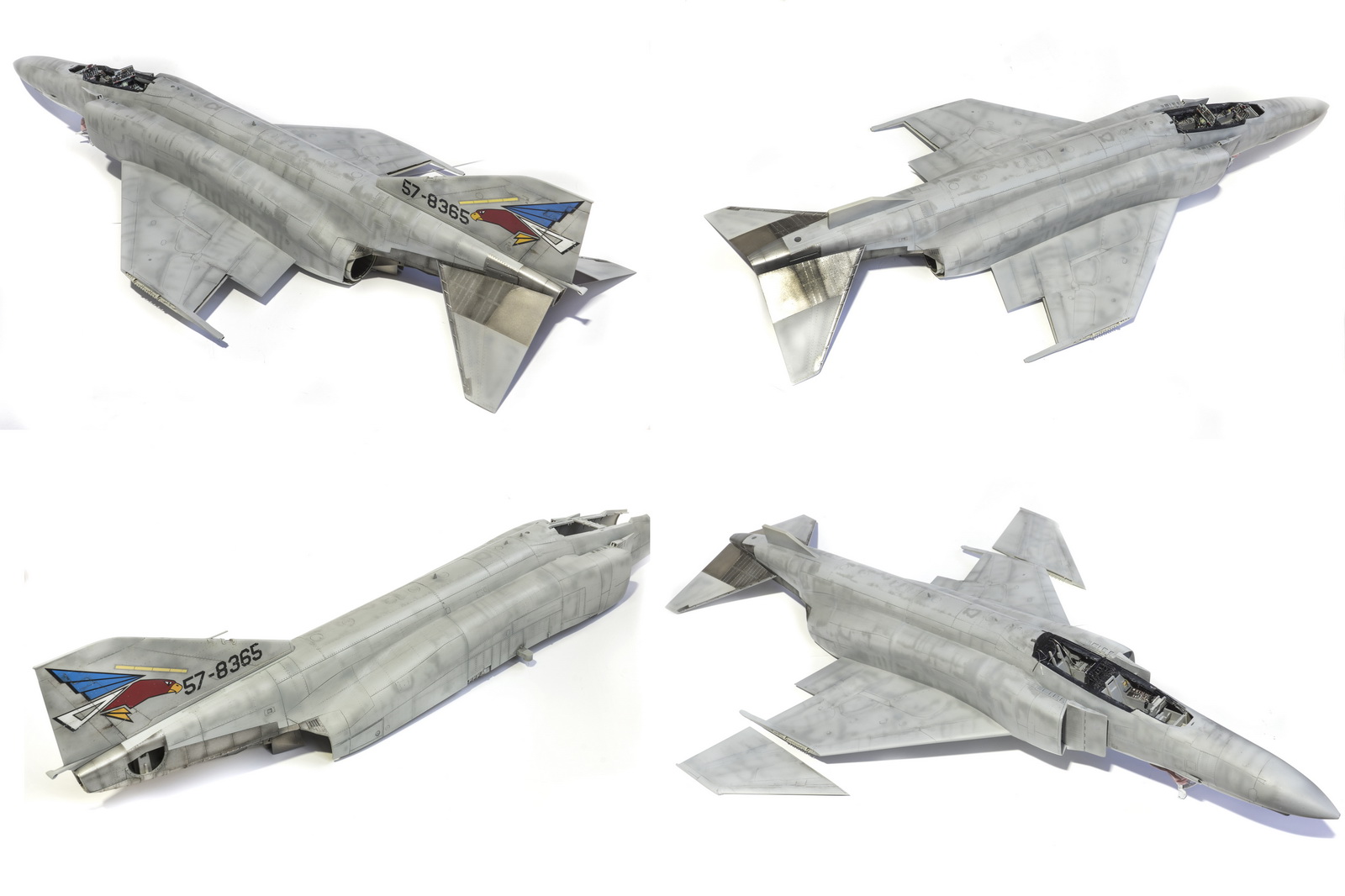 Покраска. Тут использовал 3 цвета сверху — основной серый для Фантома FS 36440 верх ( плюс 2 оттенка — светлее и темнее) и низ FS 17875. .Все пятна делал аэрографом 02 мм. Ну и смывка и тонировка впоследствии.
