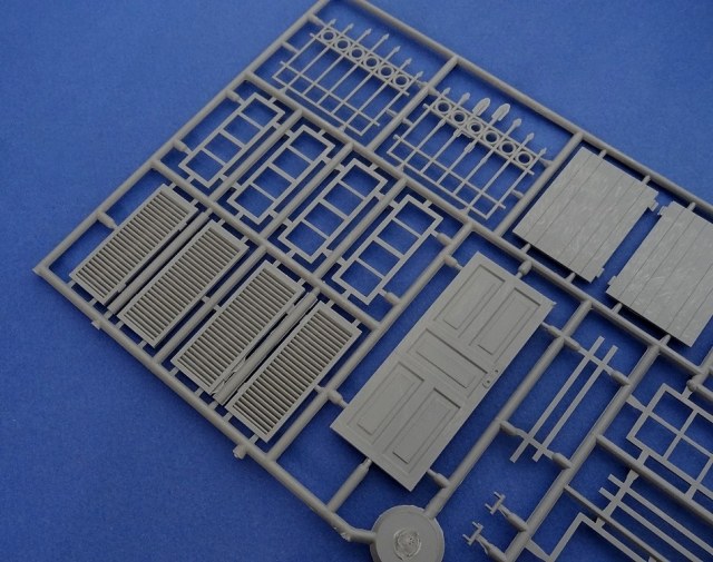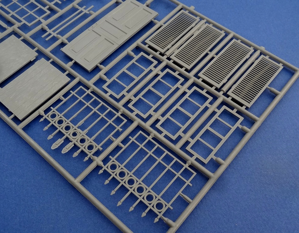 Так же в наборе присутствуют 7 пластиковых литников серого цвета. На них расположены сопутствующие детали к зданию: входная дверь, оконные блоки, уличный фонарь с кованным кронштейном, водосток с крыши, элементы входной лестницы, дверца в подвал, ворота с дверцей. На некоторых деталях обнаружено некоторое количество облоя и толкатели, которые нужно будет зачистить. Но какого либо брака или недоливов на деталях не обнаружено.
