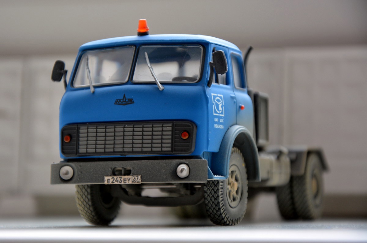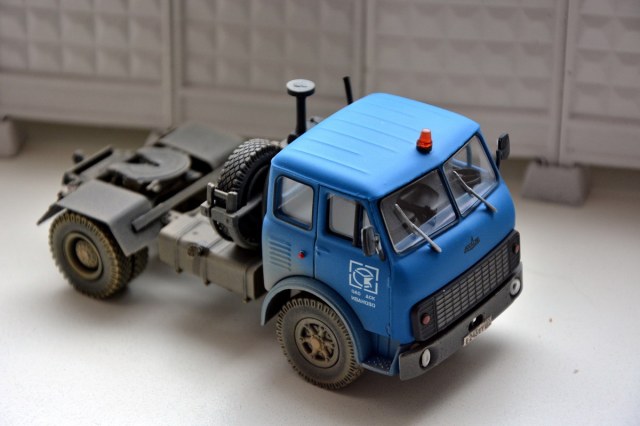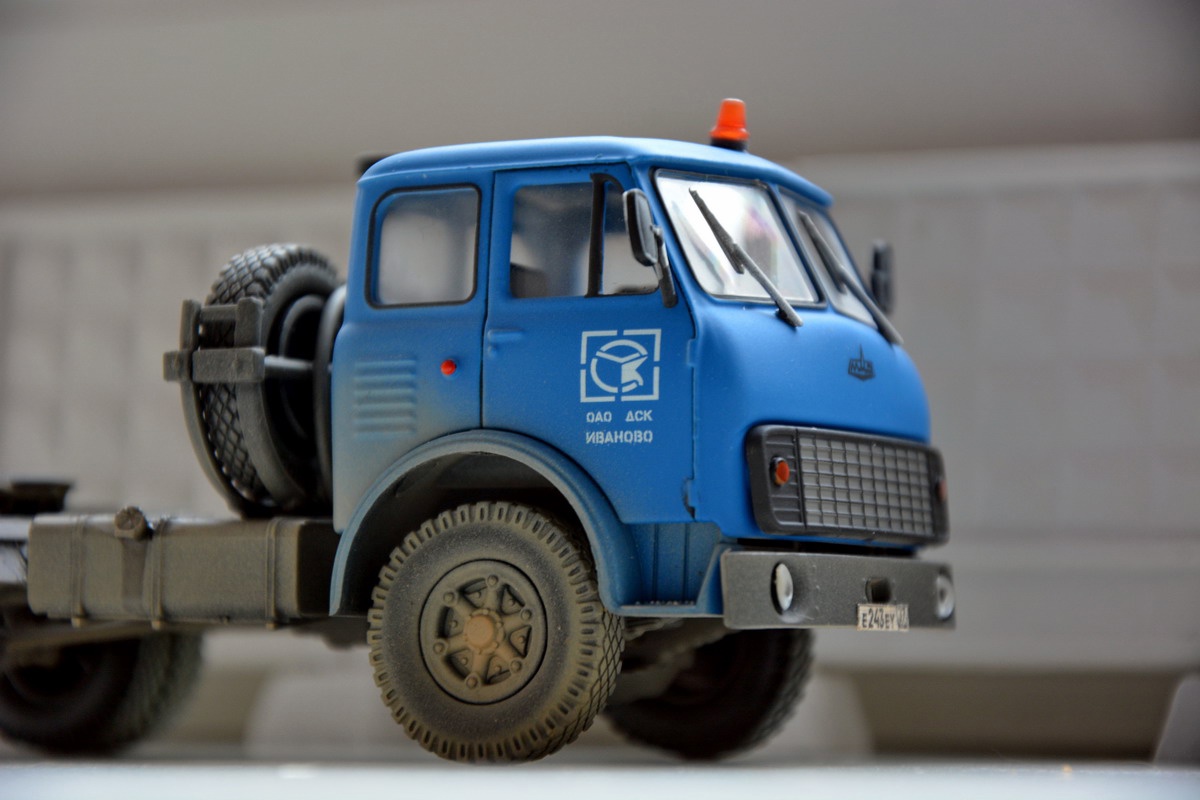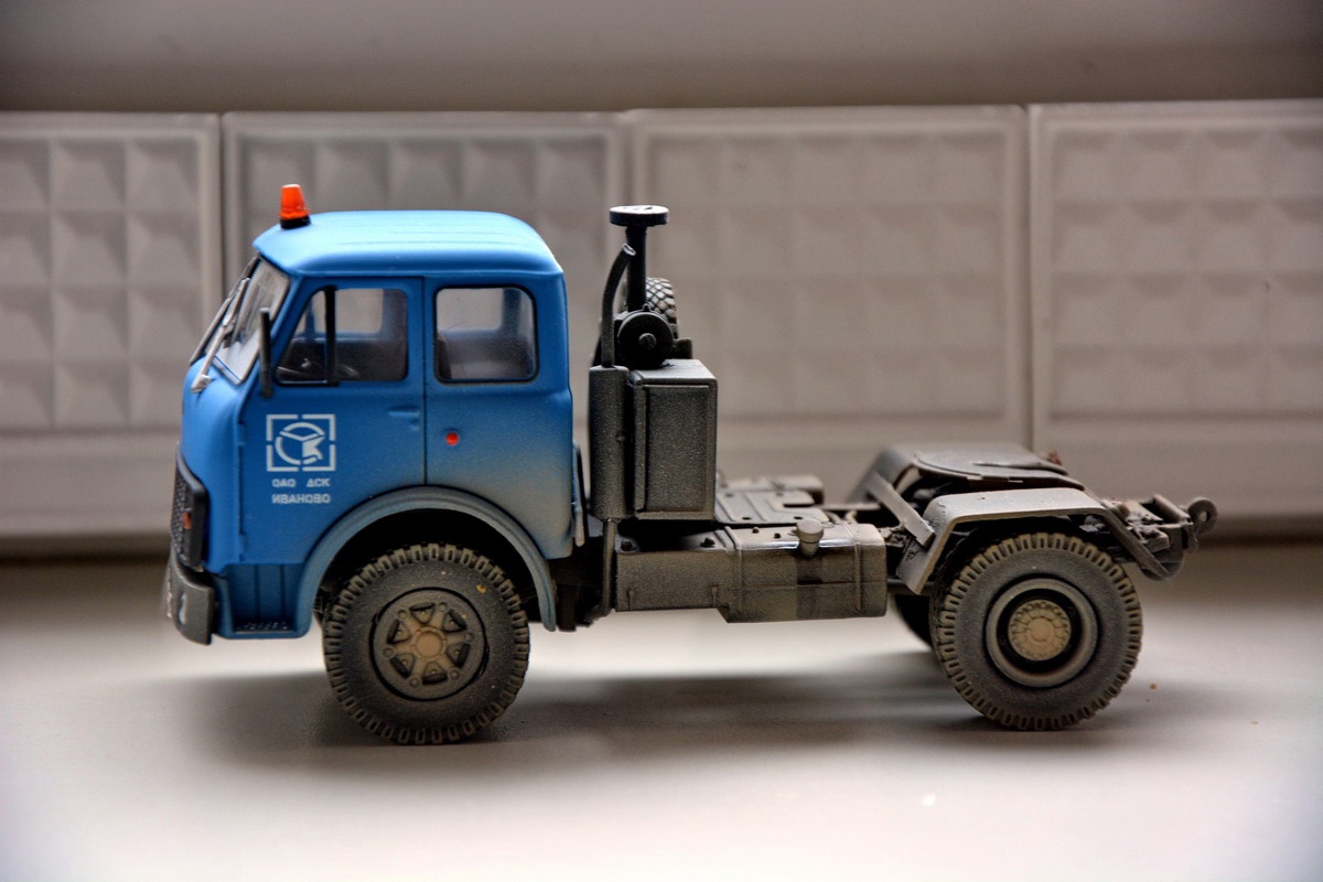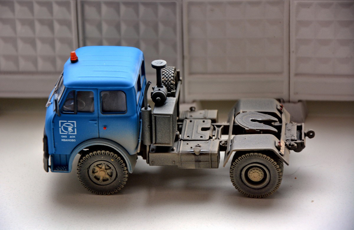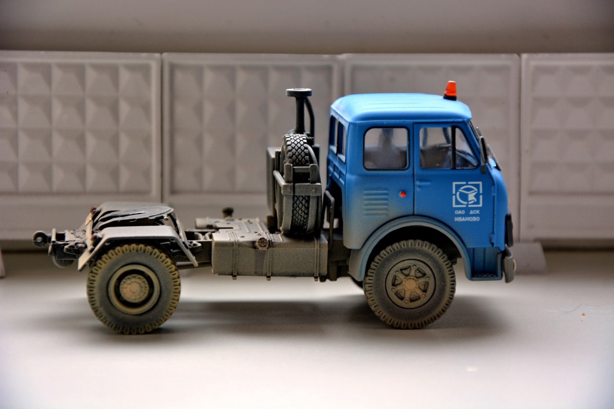 Переделка МАЗ-5334 в седельный тягач МАЗ-504В, укорочена рама, сделано сцепное устройство, задние крылья на колёса изготовлены в стиле в условиях автобазы, с дополнительными распорками для прочности. Добавлены за кабину воздушный фильтр и выхлопная труба, ну и ещё кое что по мелочи, в дальнейшем тягач будет работать с полуприцепом-панелевозом на доставки ЖБК на стройки ДСК. Покраска и следы эксплуатации: Sasha Patrizan