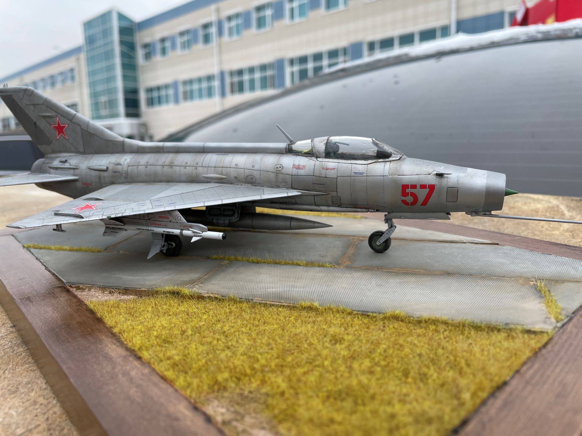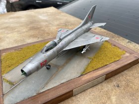 МИГ-21 Ф-13 китайского производителя Trumpeter. В связи с тем, что прошло более трёх лет с момента окончания постройки модели (см. комментарий), каких-либо особенностей я не помню. Накатал клепку, сделал гидравлику на шасси, красил металликами allclad, акрилом акан. Плиты аэродромные icm, положил неправильно (как кирпичную кладку, обратил внимание когда все закончил), траву посадил флокатором. Вроде ничего не забыл