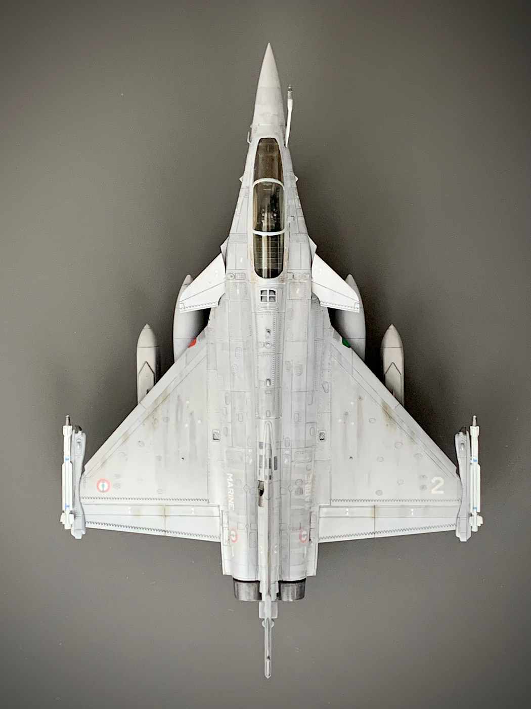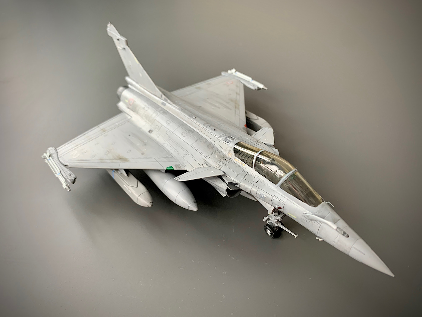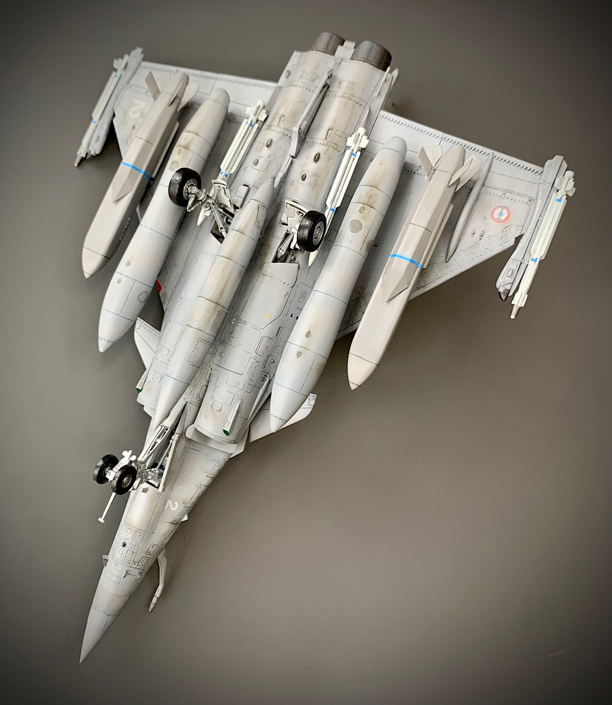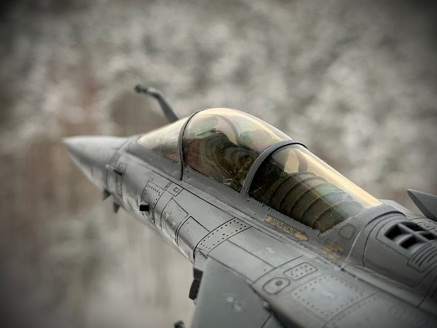 Окраска — АКАН 6й серии (67011 - цвет Gris Bleu Clair, специальный для Миражей и Рафалей), лаки и металлики Mr.Hobby, смывка и легкий загрязинг (с которым немного перестарался на крыле, каюсь) — Tamiya и АКАНовский пигмент на лаке Mr.Hobby. Прешейдинг делал первый раз, очень не хотел с ним переборщить. Фонарь тонирован лаками от АКАН, а именно смесью из Тика (74047) и Дымчатого (74029). Получилось похоже, как мне кажется.