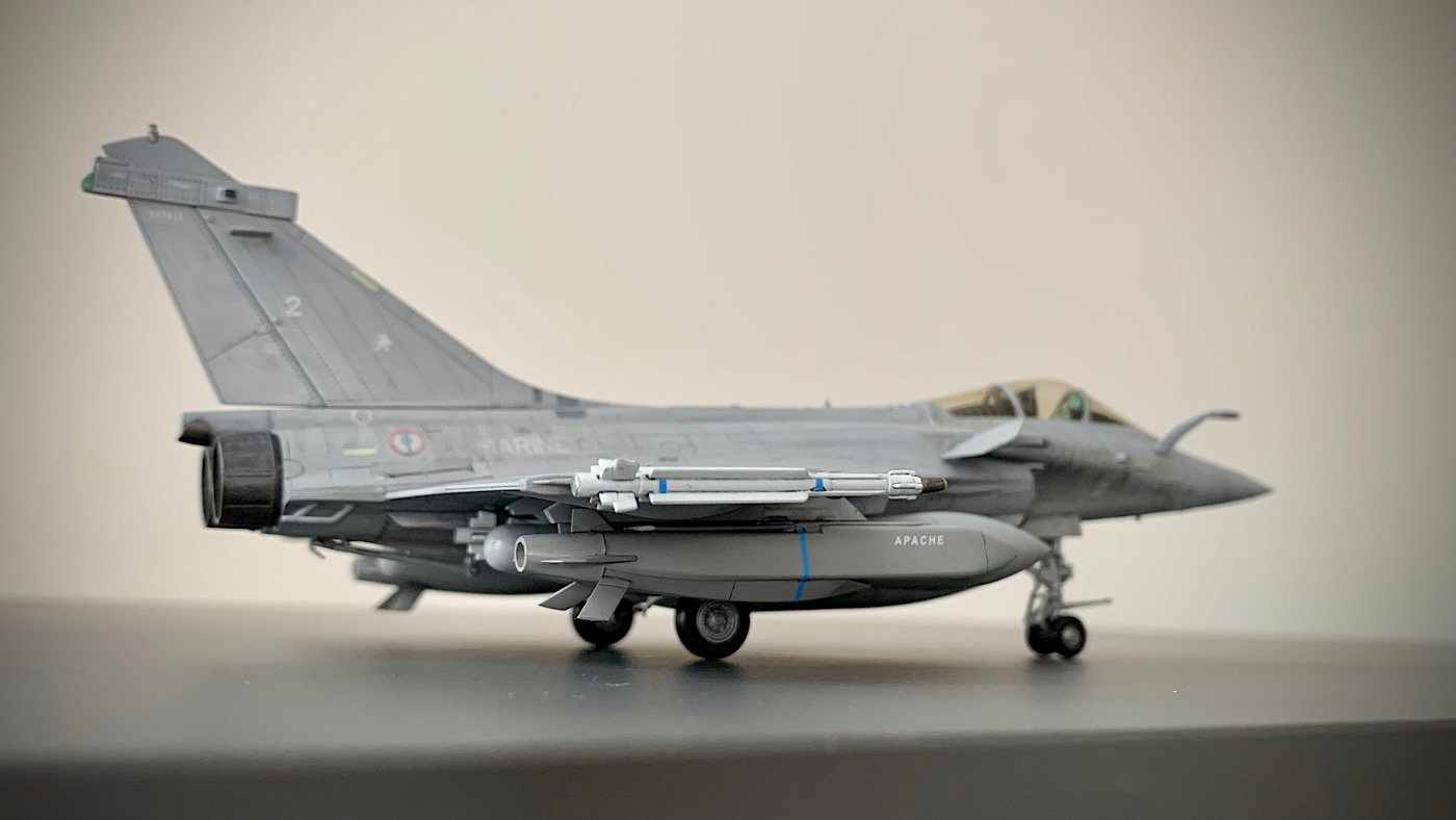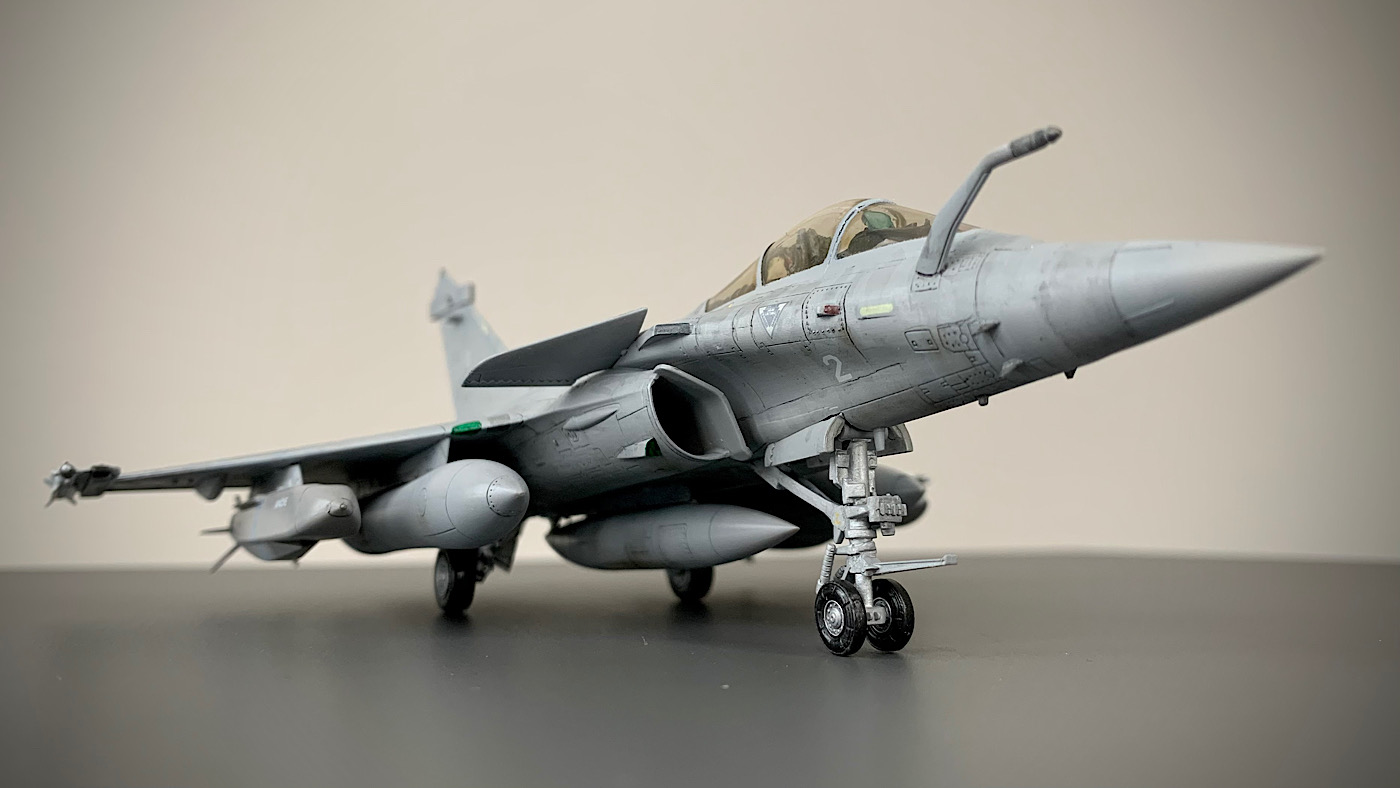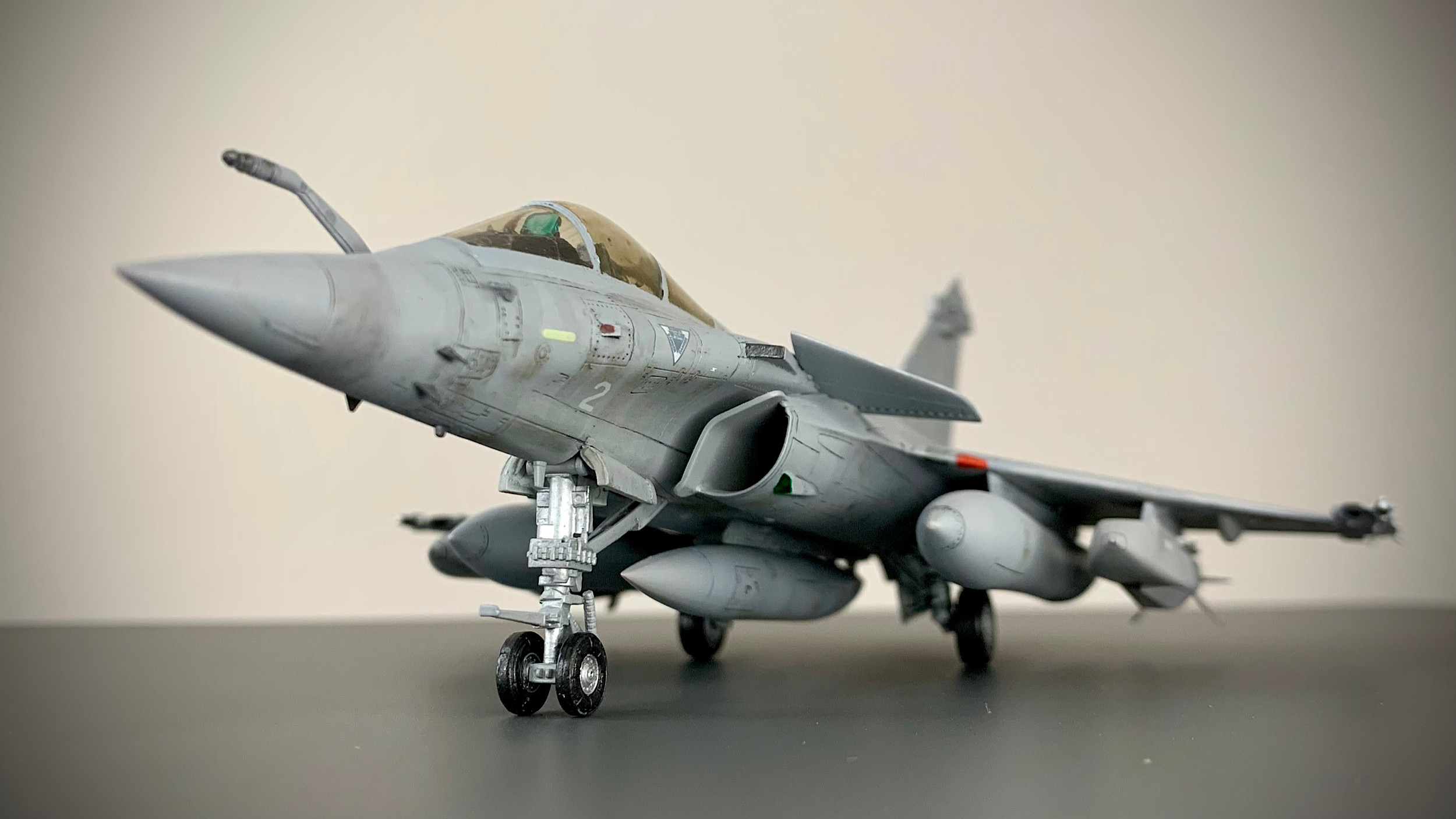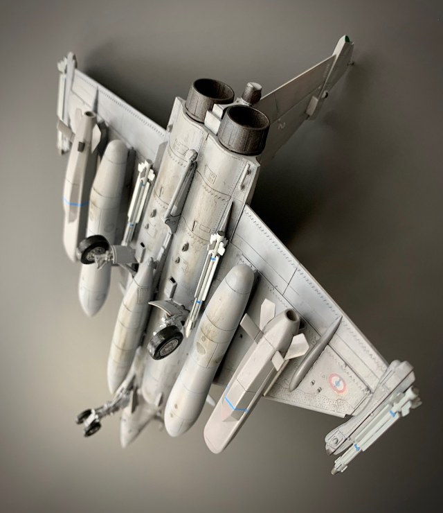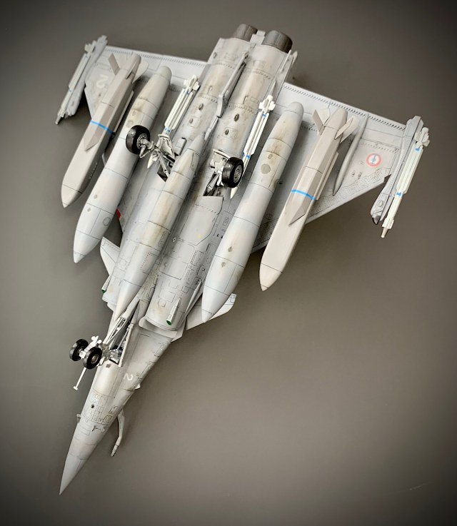 Окраска — АКАН 6й серии (67011 - цвет Gris Bleu Clair, специальный для Миражей и Рафалей), лаки и металлики Mr.Hobby, смывка и легкий загрязинг (с которым немного перестарался на крыле, каюсь) — Tamiya и АКАНовский пигмент на лаке Mr.Hobby. Прешейдинг делал первый раз, очень не хотел с ним переборщить. Фонарь тонирован лаками от АКАН, а именно смесью из Тика (74047) и Дымчатого (74029). Получилось похоже, как мне кажется.