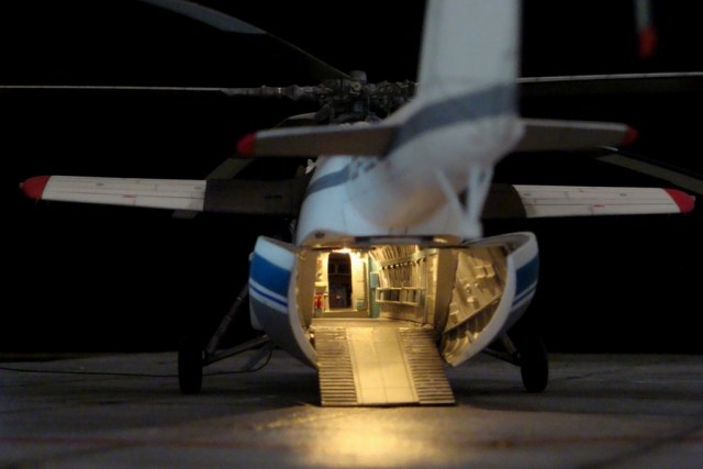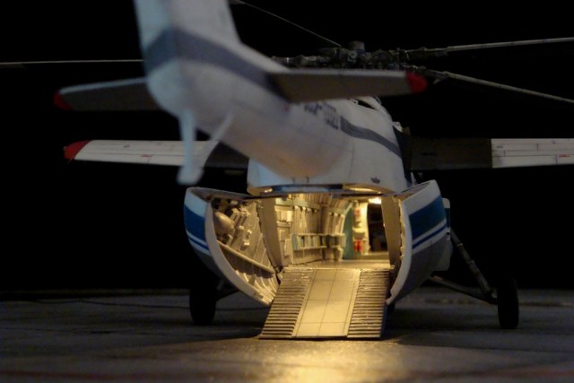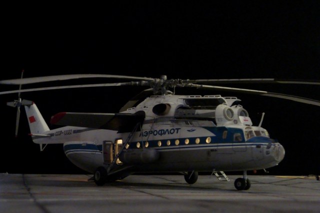 Когда цвет подсветки и масштаб освещения соответствует - смотрится очень реалистично. Хотелось бы увидеть в исполнении автора Камовский вертолёт с вращающимися соосно винтами в противоположные стороны. При желании автор может воспроизвести кадр из того же фильма "Чёрная Акула", когда вертолёт ночью взлетал.
