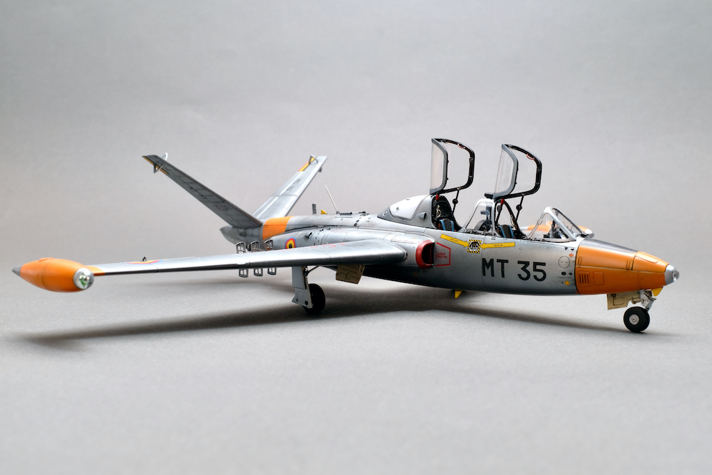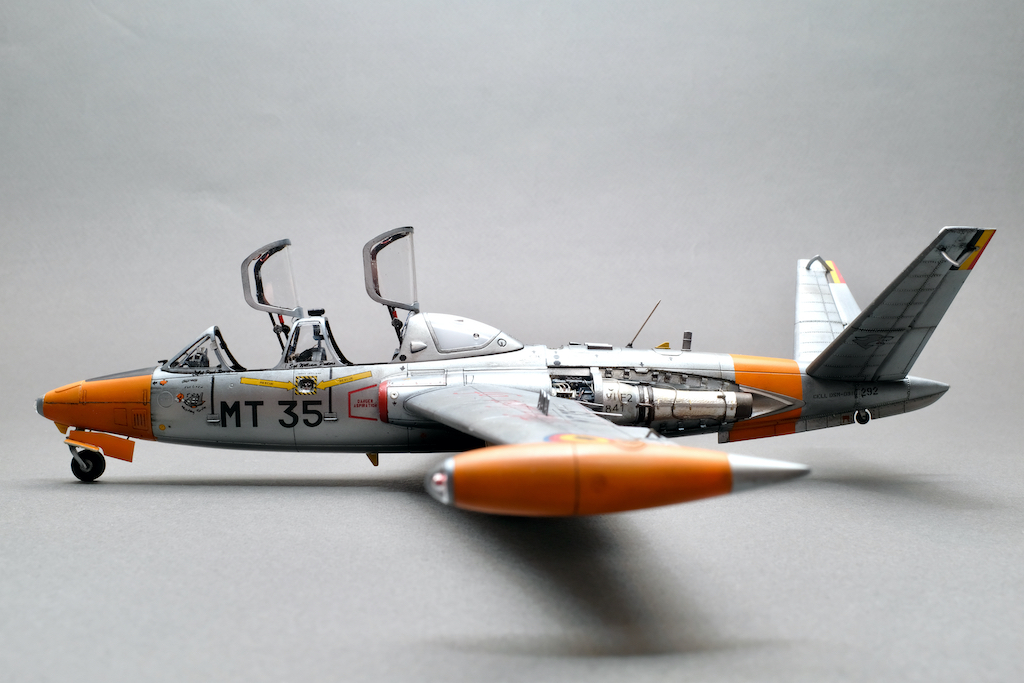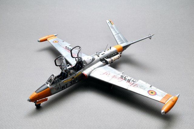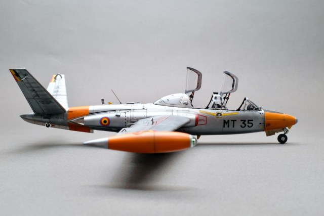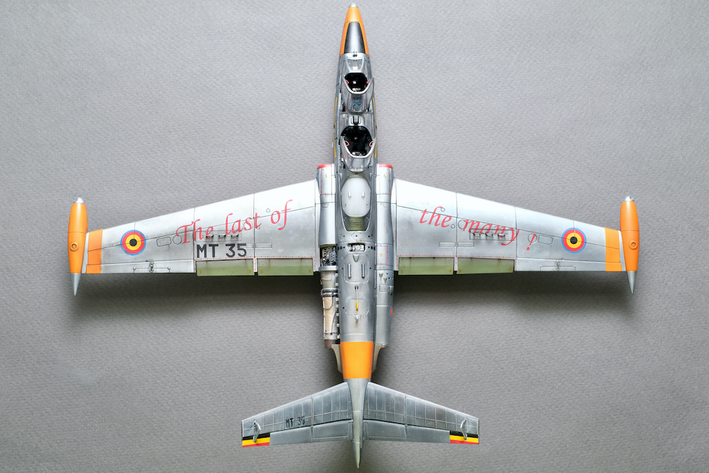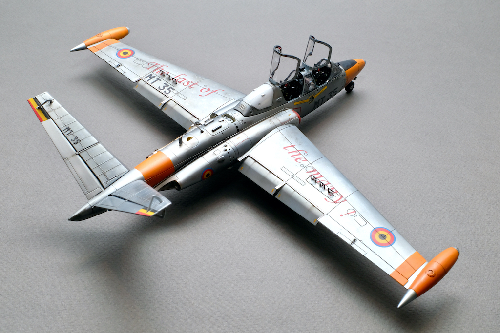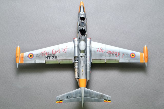 Разрешите представить вам свою очередную работу - модель учебно-боевого самолёта Fouga CM.170 Magister. Самолёт очень интересный, симпатичный, с долгой историей эксплуатации. Принимал участие в боевых действиях и, думаю, обучил немало отличных лётчиков. В качестве прототипа была выбрана машина бельгийских ВВС с б/н MT 35. Уникальность этого борта заключается в том, что это была последняя Фуга, находящаяся в эксплуатации бельгийских ВВС, она была выведена из состава в 2007 году. Об этом факте говорит красочная надпись на крыле "The Last of the Many".