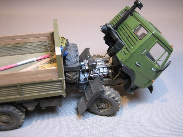 Итак. Вполне себе неплохая модель. Не Мустанг, но вполне похожа на прототип. Заменил изкоробочные колёса на смолу от Комплект ЗИП. Использовал немного травления от Микродизайн. Доработал кузов. Сделал буксир, лопату, скатку (первый раз), трос. Фар Эльф. Ведро, ящик и канистра - не помню чьи.