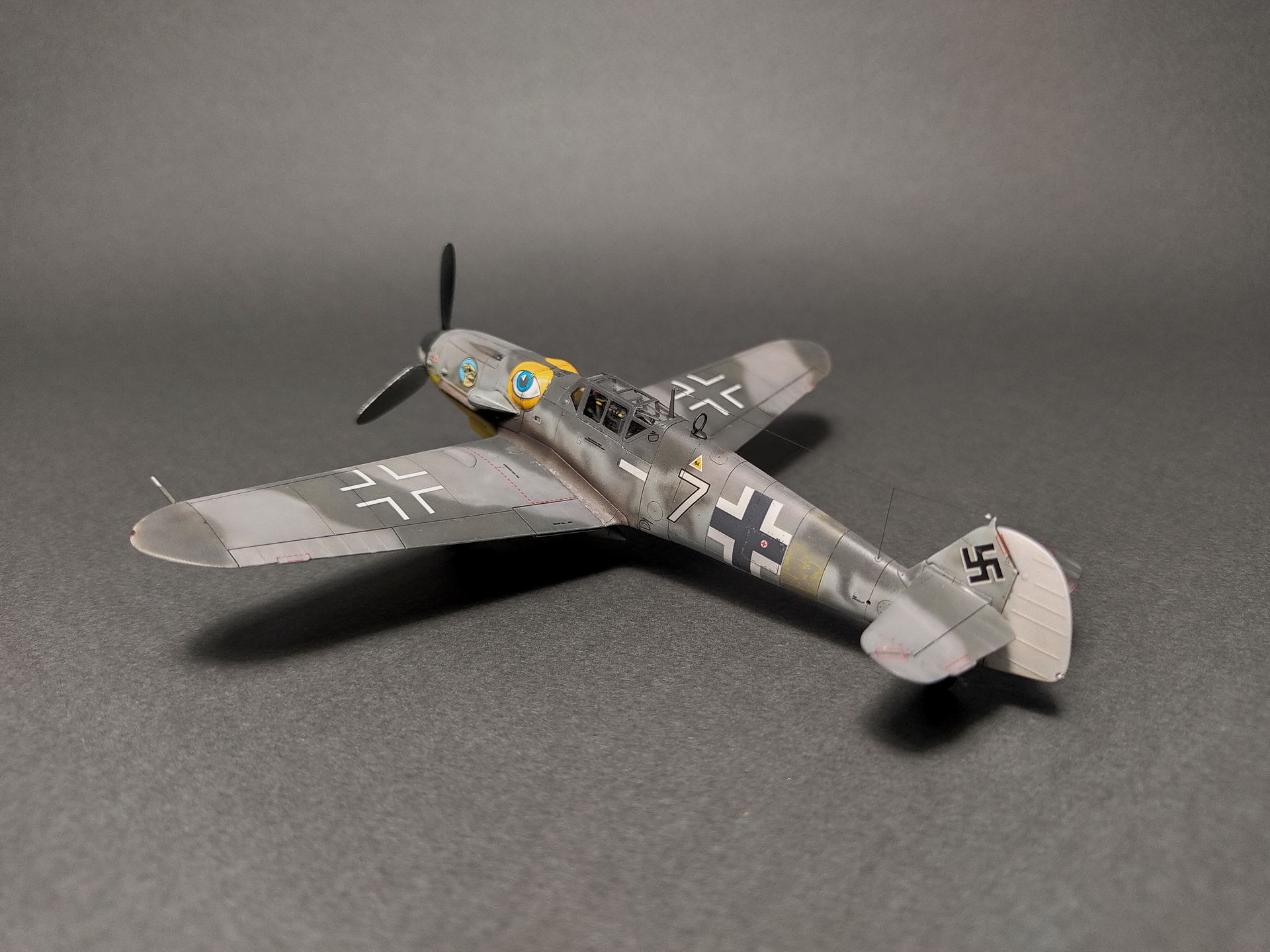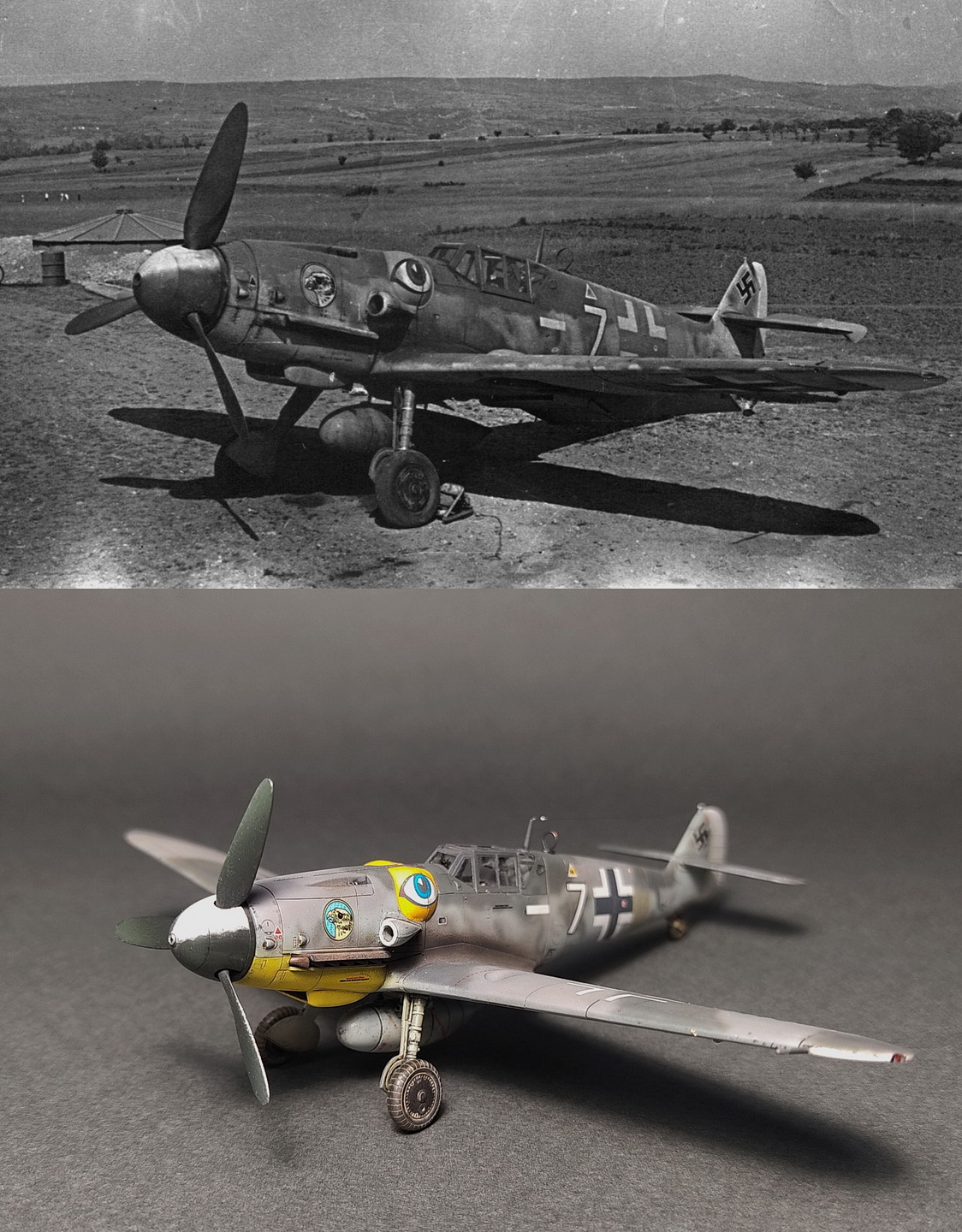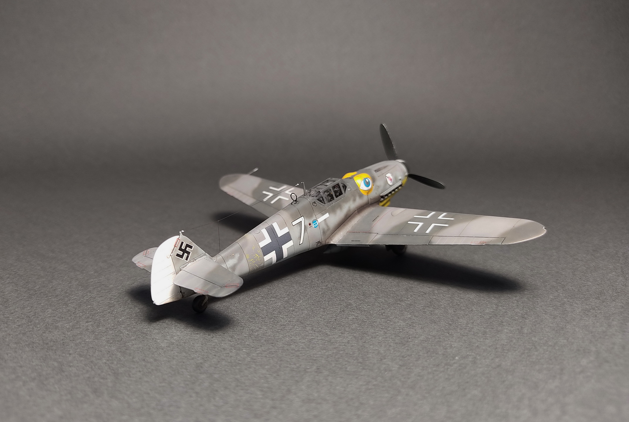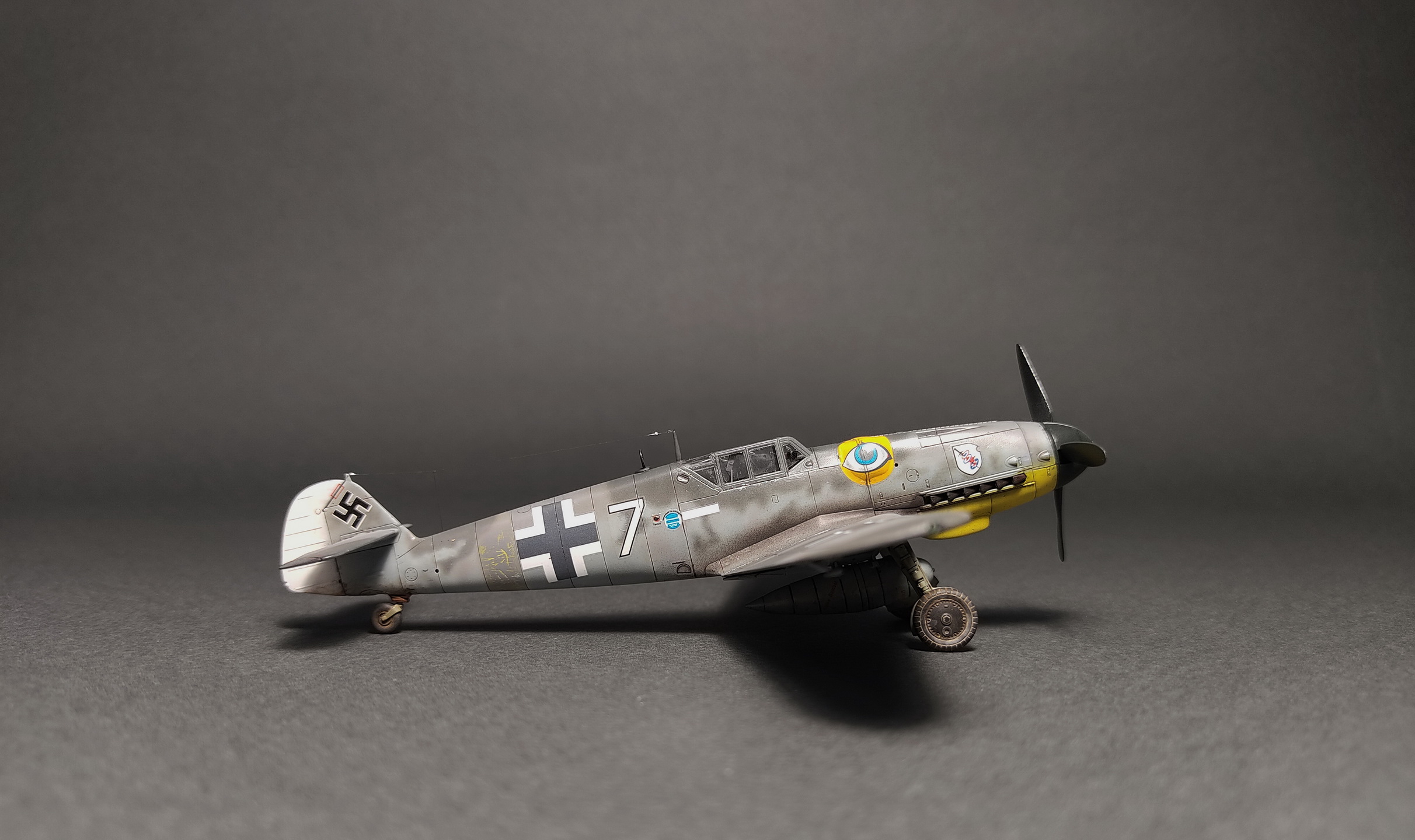 Вариант выбран 51-го "гешвадера" ,Радомир, Болгария ,июня 44 -го, на котором летал Элиус Кюлейн. "Глаза" на обтекателях MG131,обойти было невозможно).