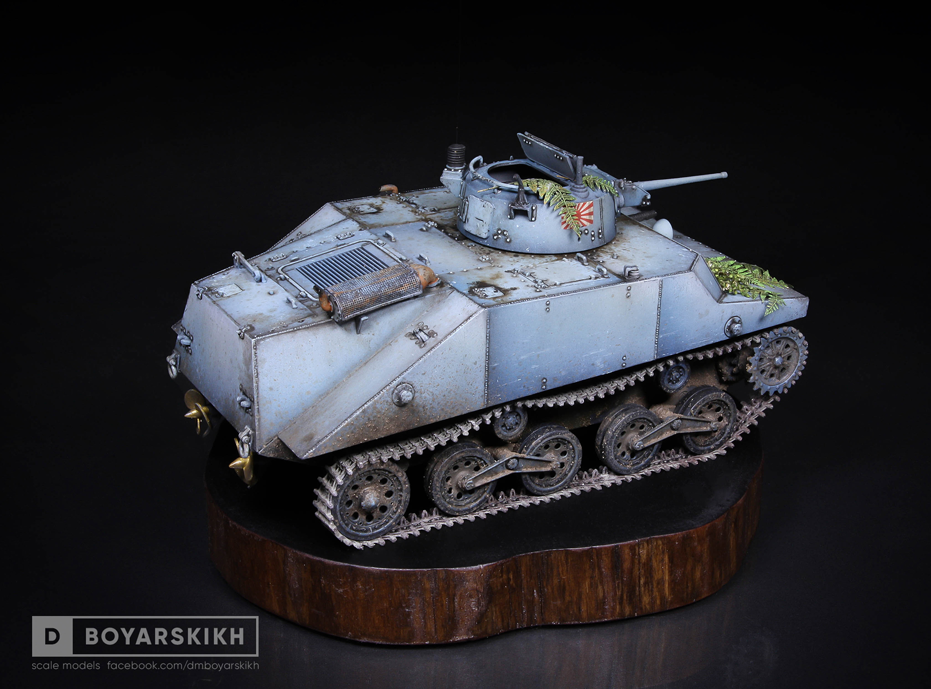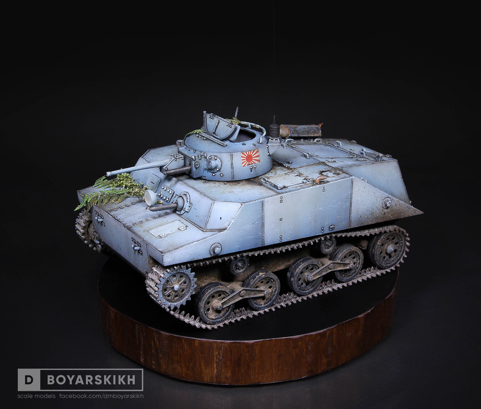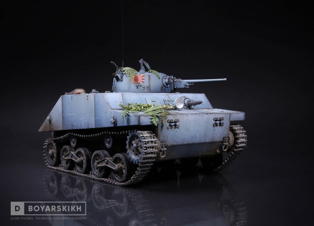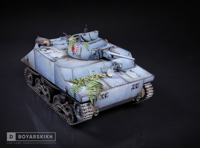 Мой первый японский танк в коллекции, построенный для разнообразия как в тематике, так и просто в варианте окраски. Набор от драгон, дополнен металлическими траками MasterClub и фарой эльф. Листья папоротника - фототравление Miniwarpaint. Окраска акрилом Tamiya, везеринг с помощью худ. масла и продуктов от Ak interactive.