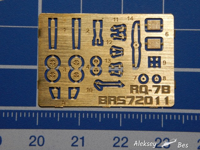 Фюзеляж, крылья, перевернутое V-образное хвостовое оперение, мотор и шар с оптическим оборудованием – выполнены из смолы. Производитель в наборе дает на выбор шасси и двухлопастной воздушный винт в виде смоляных деталей и деталей из фототравления. Так же на плате фототравления находиться детали крыльев и тормозной стартовый гак. Направляющие балки к хвостовому стабилизатору в наборе отсутствуют, но в инструкции производитель предлагает их сделать самим из трубочек диаметром 0,8мм и длинной 22мм.