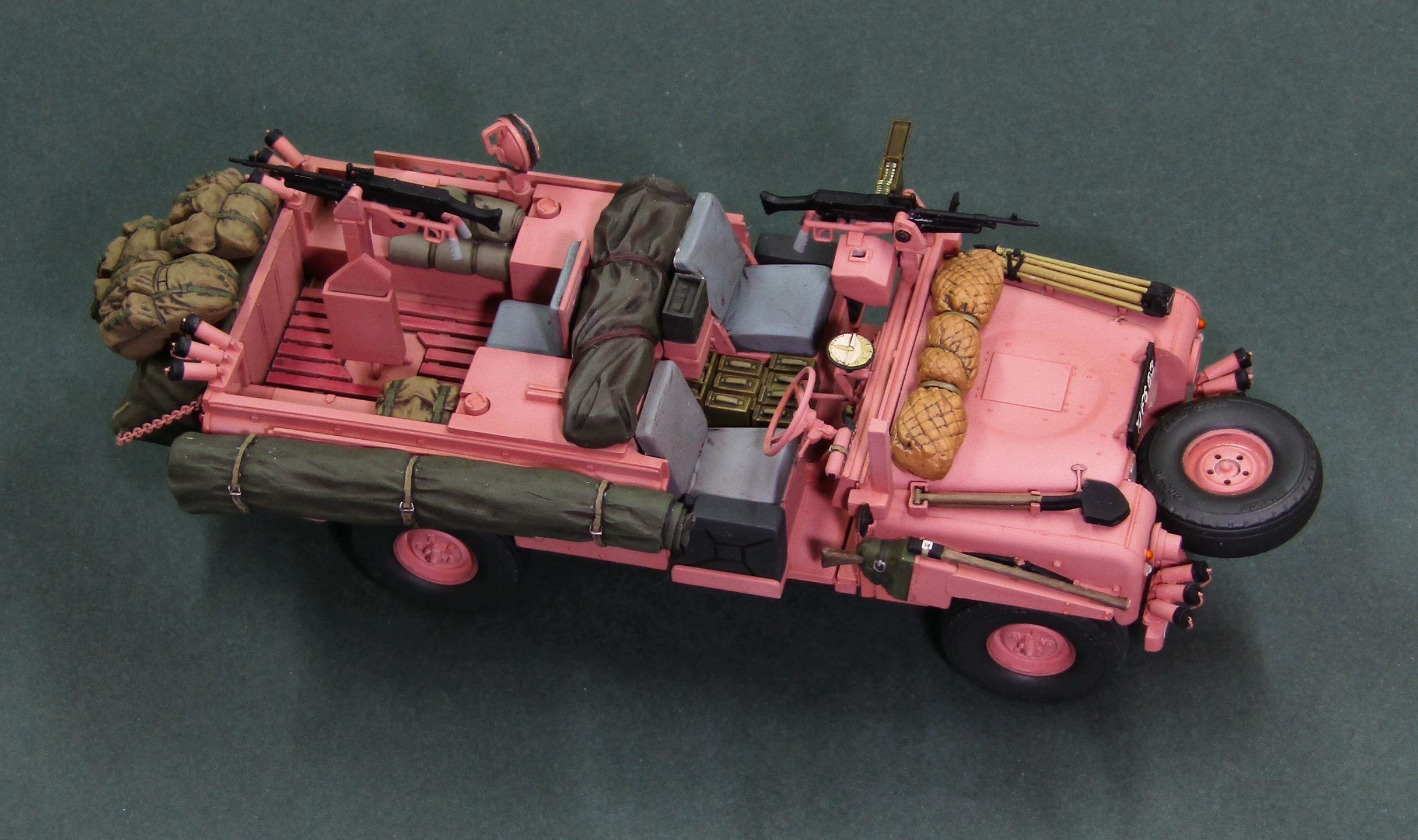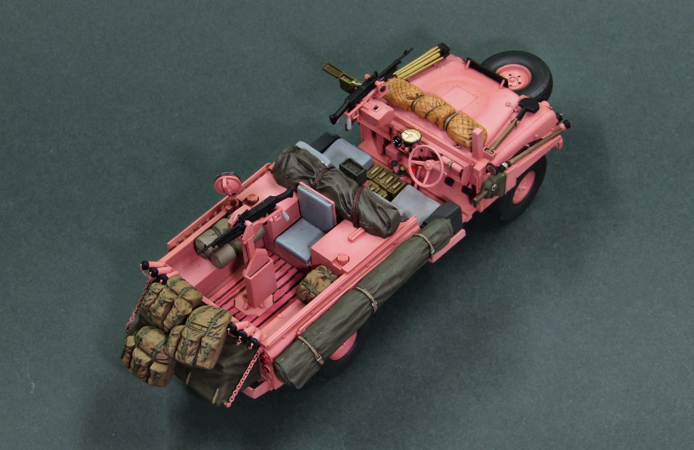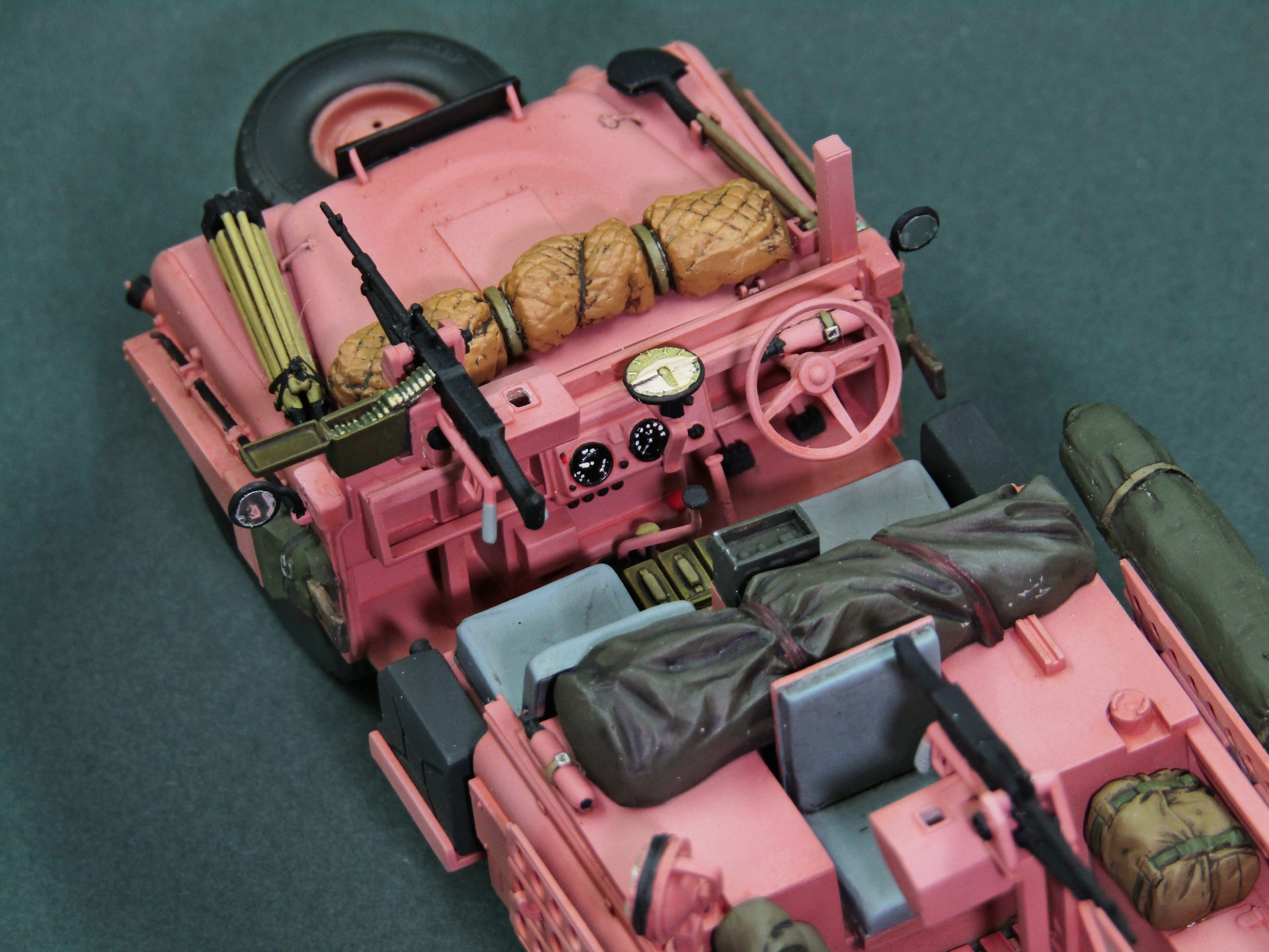 Только что собрал точно такую же модель от Tamiya. Я новичок в моделизме и поэтому хвастаться пока не чем, но при покраске возник вопрос, а надо ли красить в розовый цвет внутри машины. Ну то есть приборную панель, руль, педали, пол в салоне, внутри кузова. Просто я предполагаю, что их красили в полевых условиях, а не на заводе и резона красить больше нужного нет. Кстати, та же история и с Jeep Willys SAS. Только там покрас в песочный цвет. И такой же вопрос возникает при покраске ходовой этих машин, тоже в розовый/песочный/олив драп?