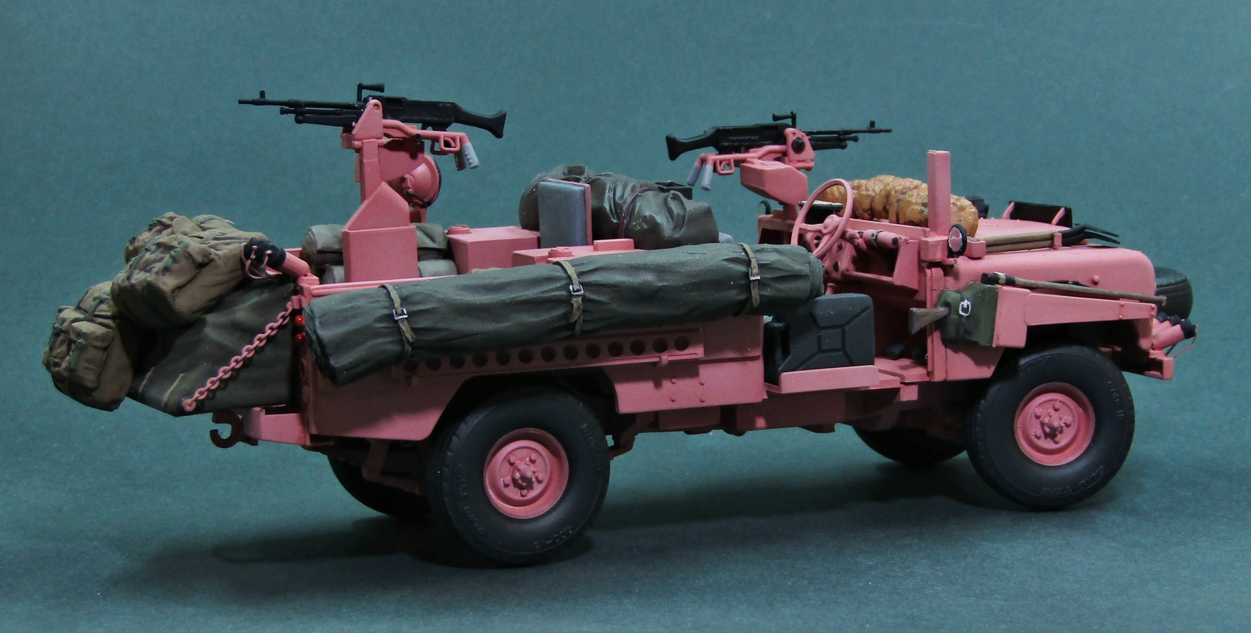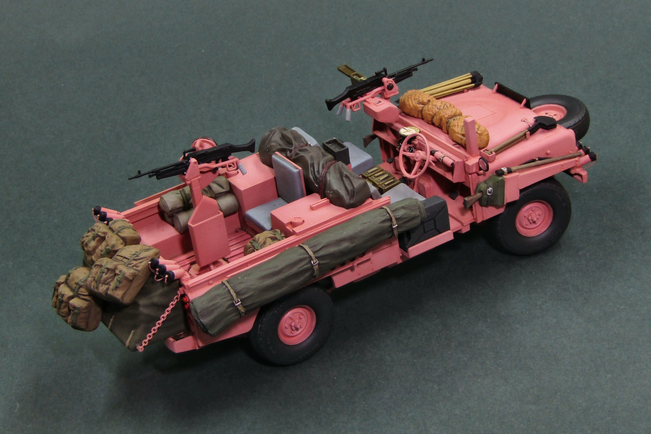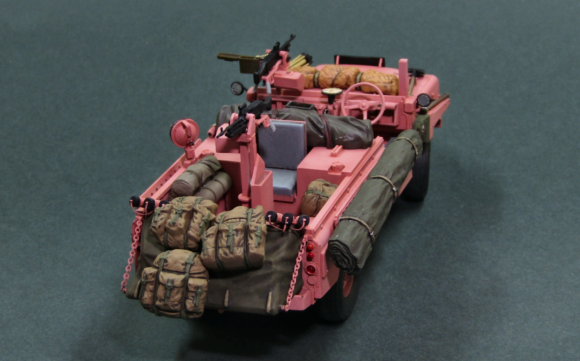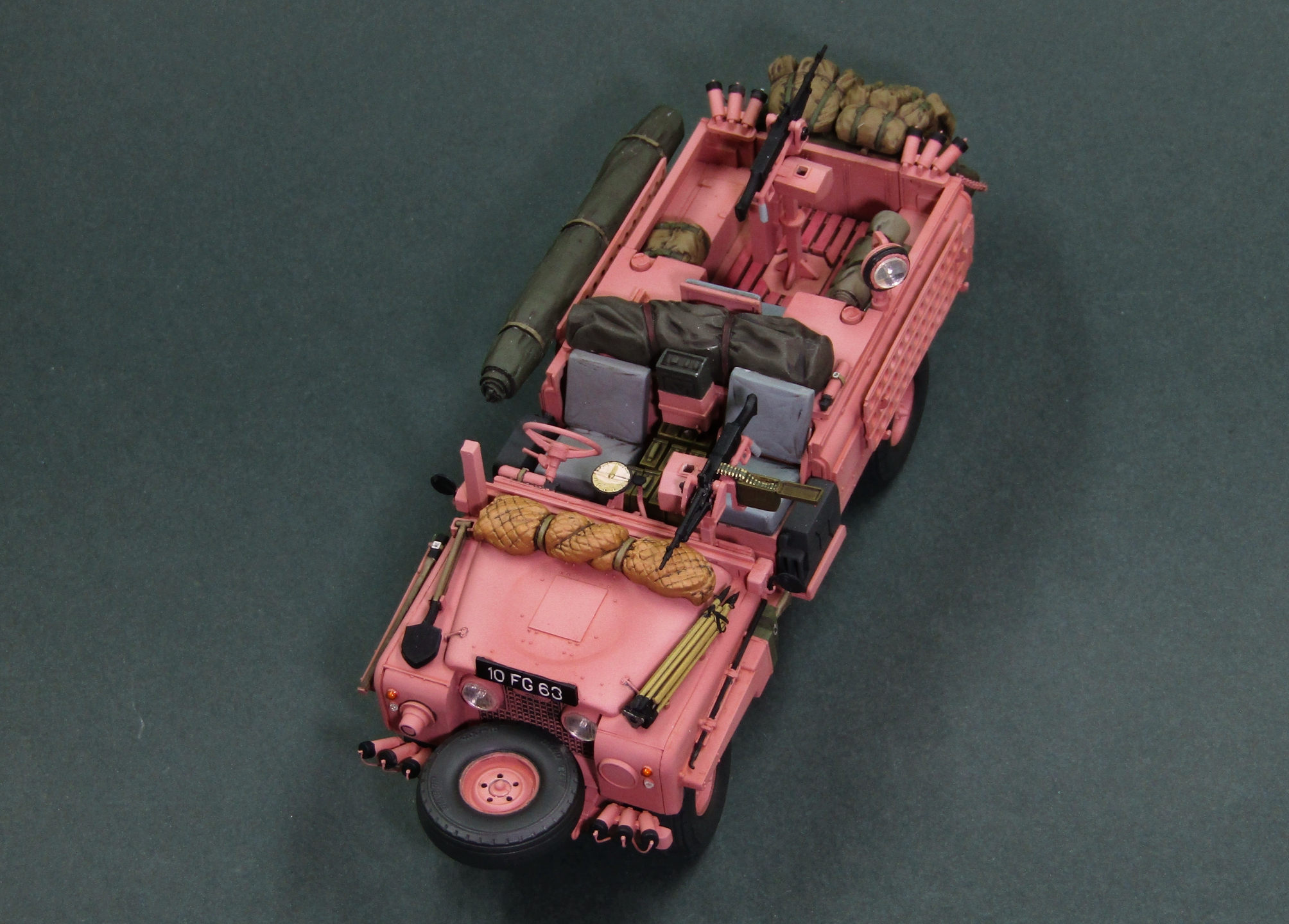 Только что собрал точно такую же модель от Tamiya. Я новичок в моделизме и поэтому хвастаться пока не чем, но при покраске возник вопрос, а надо ли красить в розовый цвет внутри машины. Ну то есть приборную панель, руль, педали, пол в салоне, внутри кузова. Просто я предполагаю, что их красили в полевых условиях, а не на заводе и резона красить больше нужного нет. Кстати, та же история и с Jeep Willys SAS. Только там покрас в песочный цвет. И такой же вопрос возникает при покраске ходовой этих машин, тоже в розовый/песочный/олив драп?