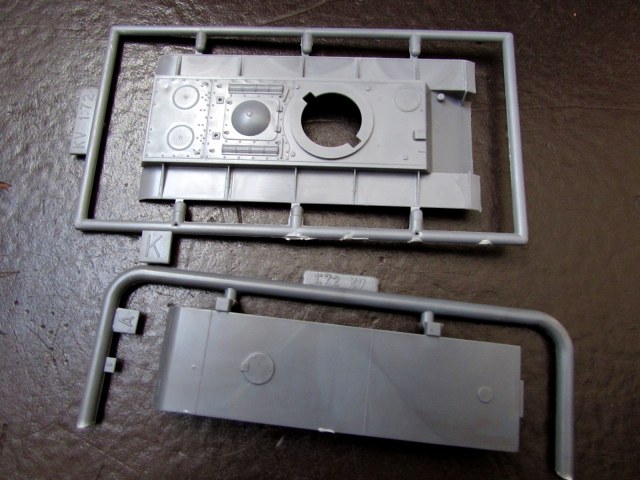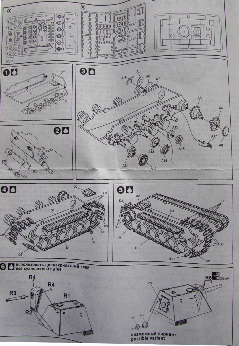 Учитывая, что САУ разрабатывалась в начале 1942 года (т.е. в последние месяцы производства КВ-1), основа должна иметь спрямленный кормовой лист, и катки с внутренней амортизацией. Непосредственно у меня корпус правильный - но вот на сайте Хэнка в обзоре виден более ранний "скругленный" кормовой лист корпуса. Катки же вложены почему-то усиленные образца 1941 года, которые Zebrano/PST вкладывают во все наборы ранних КВ. Про поддерживающие ролики вообще молчу. Также в инструкции упоминаются явно смоляные, судя по маркировке, поручни - которых нет в наборе. Ну и вишенкой на торте является отсутствие выведенных под верхним кормовым листом двух патрубков (что явственно видно на чертеже).