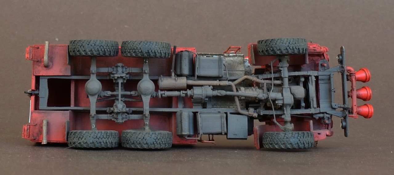 На мой взгляд; ширина колеи на всех мостах большеватая. Боковые поворотники на кабине высоковато установлены. Не хватает нижних реактивных штанг на среднем и заднем мостах, при наличии верхних.