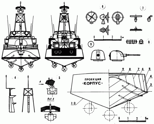 Корпус выклеен по деревянной матрице из стеклоткани с эпоксидной смолой, палуба из текстолита, надстройка склеена из полистирола. В отличие от чертежа отсутствуют продольные реданы на днище и форма РЛС на топе мачты.
