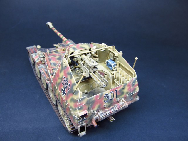 Есть и некоторые "минусы", тоже традиционные, а именно: минимум фототравления (только кожух на глушитель), резиновые гусеничные ленты, небогатая детализация боевого отделения (снарядов могли бы и побольше отлить, а не жалкие 4 штучки при 27 тубусах под них).