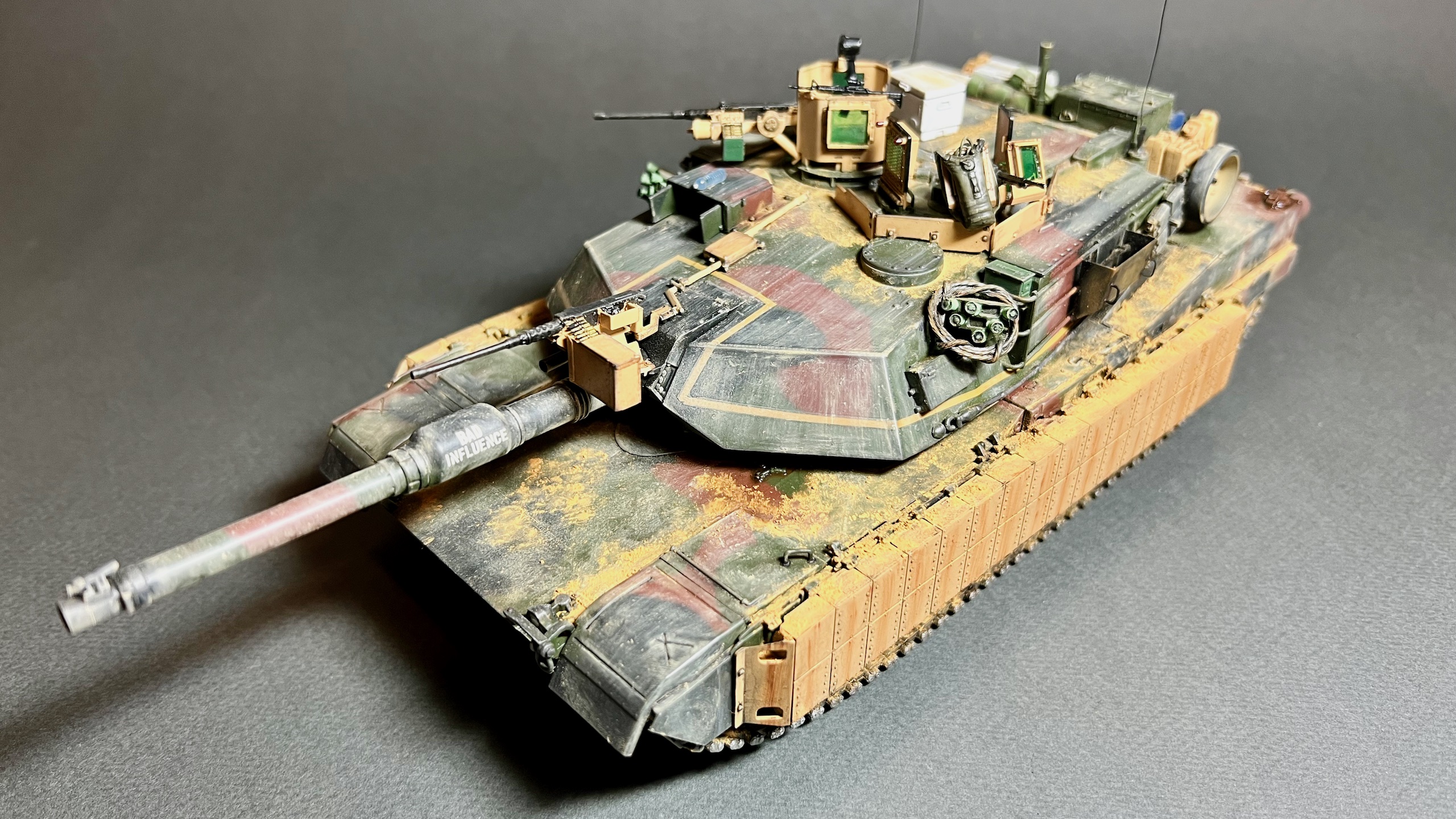 Хорошо известный кит от MENG, позволяет собрать несколько вариантов, как для КМП (корпуса морской пехоты), так и армейский. Вариант для КМП можно сделать с установленным оборудованием для подводного вождения. Но я выбрал армейский вариант на 2008 год (Ирак) для роты Б 1-го батальона 35 бронетанкового полка с собственным именем "BAD INFLUENCE" ("Дурное влияние"). Понравилось само сочетание камуфляжной окраски для европейского ТВД, с элементами TUSK, окрашенными в песочный. Есть здесь что-то символическое - и про традиционный армейский бардак, и про маниакальный интерес главной демократии земного шара наводить свои порядки там, куда их совсем не звали).