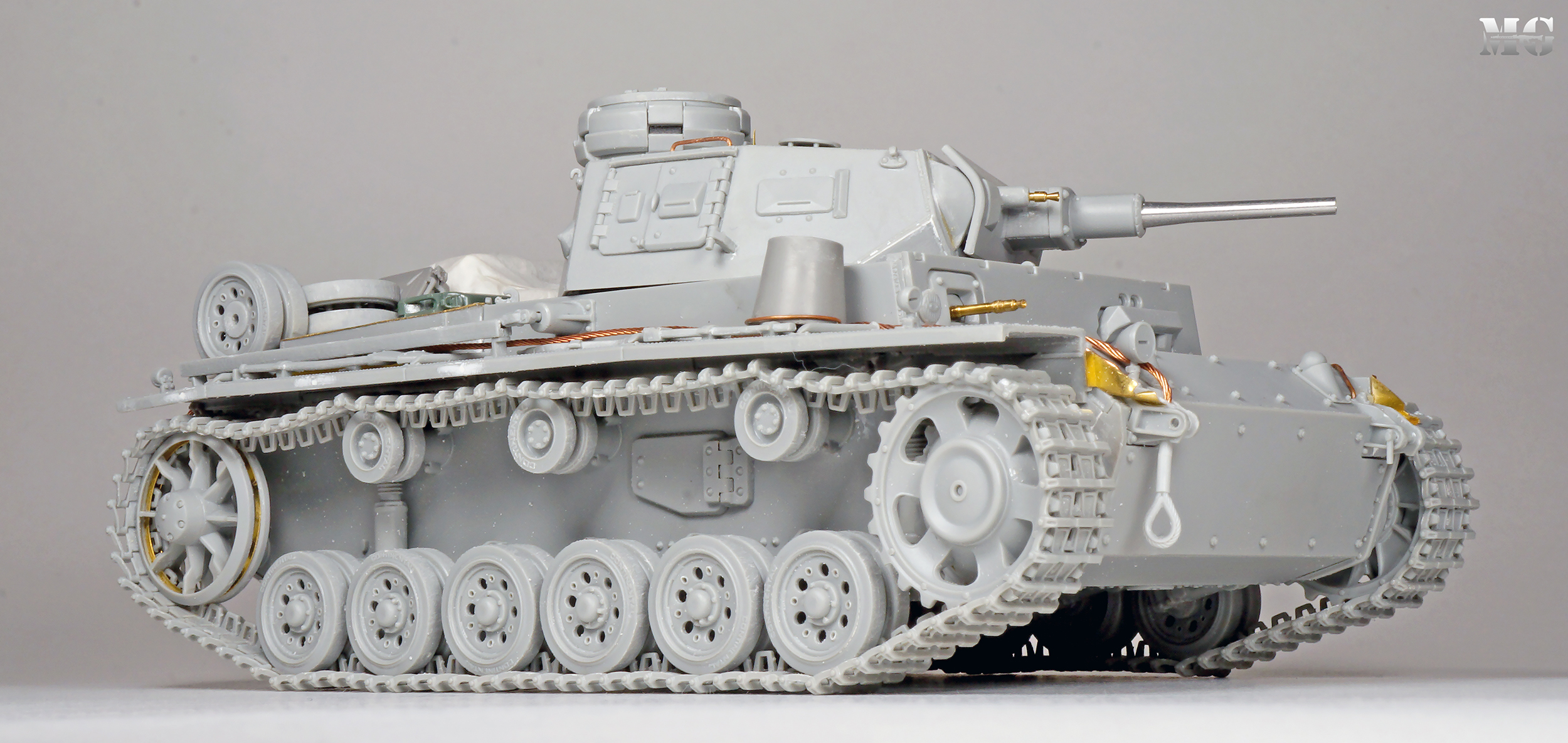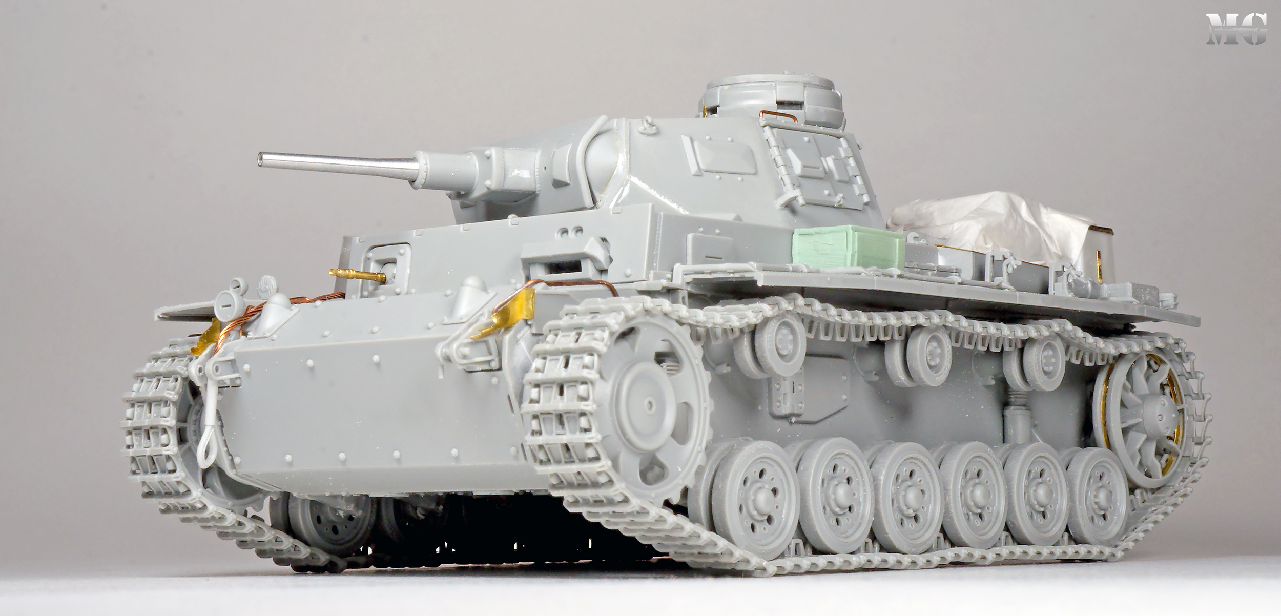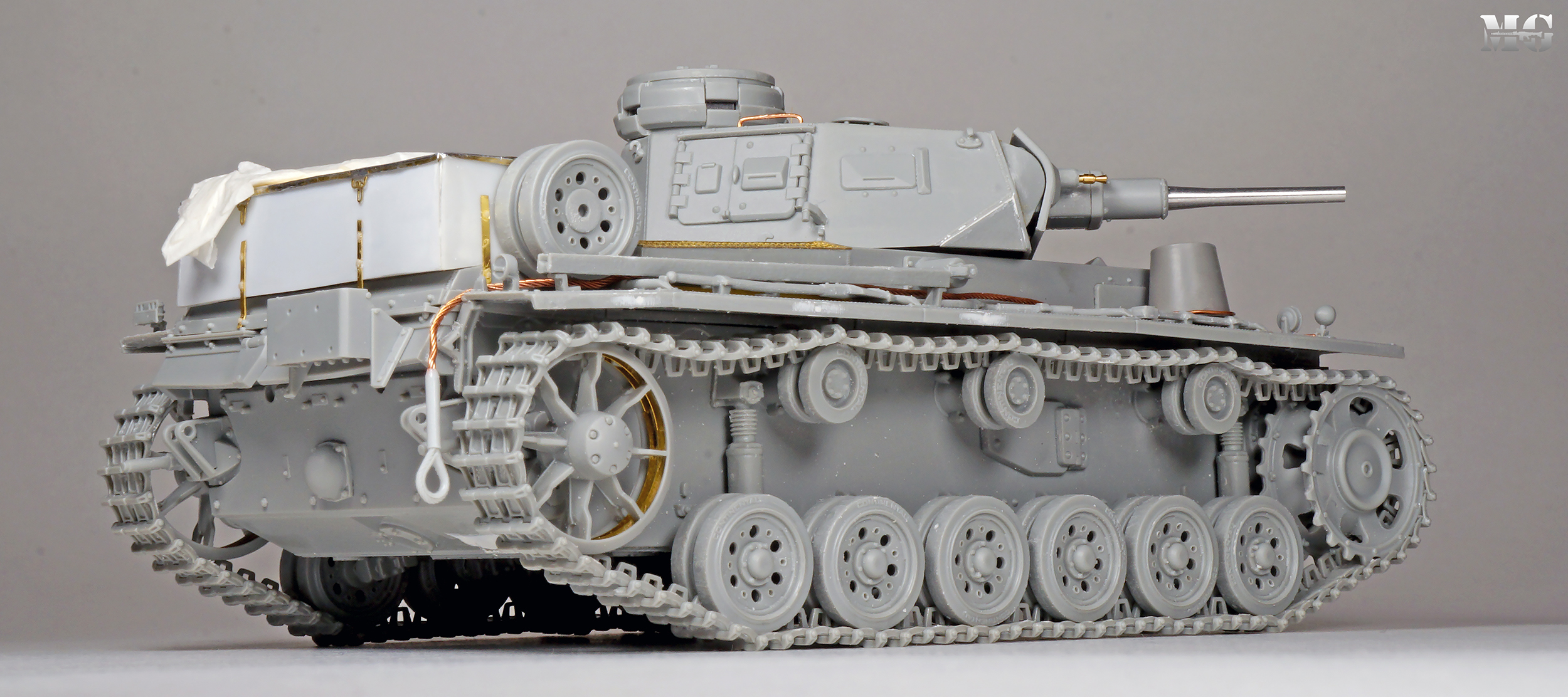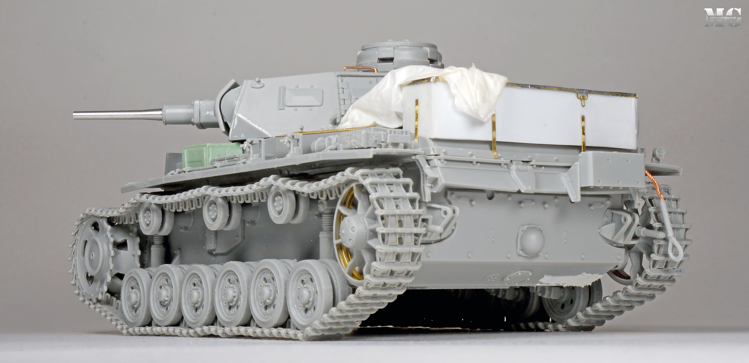 Эффектная модель в плане художки. Панцергрей, на мой взгляд, слишком светлый и Драгон так и не научился делать крепления для шанцевого инструмента. Их надо менять на травление.