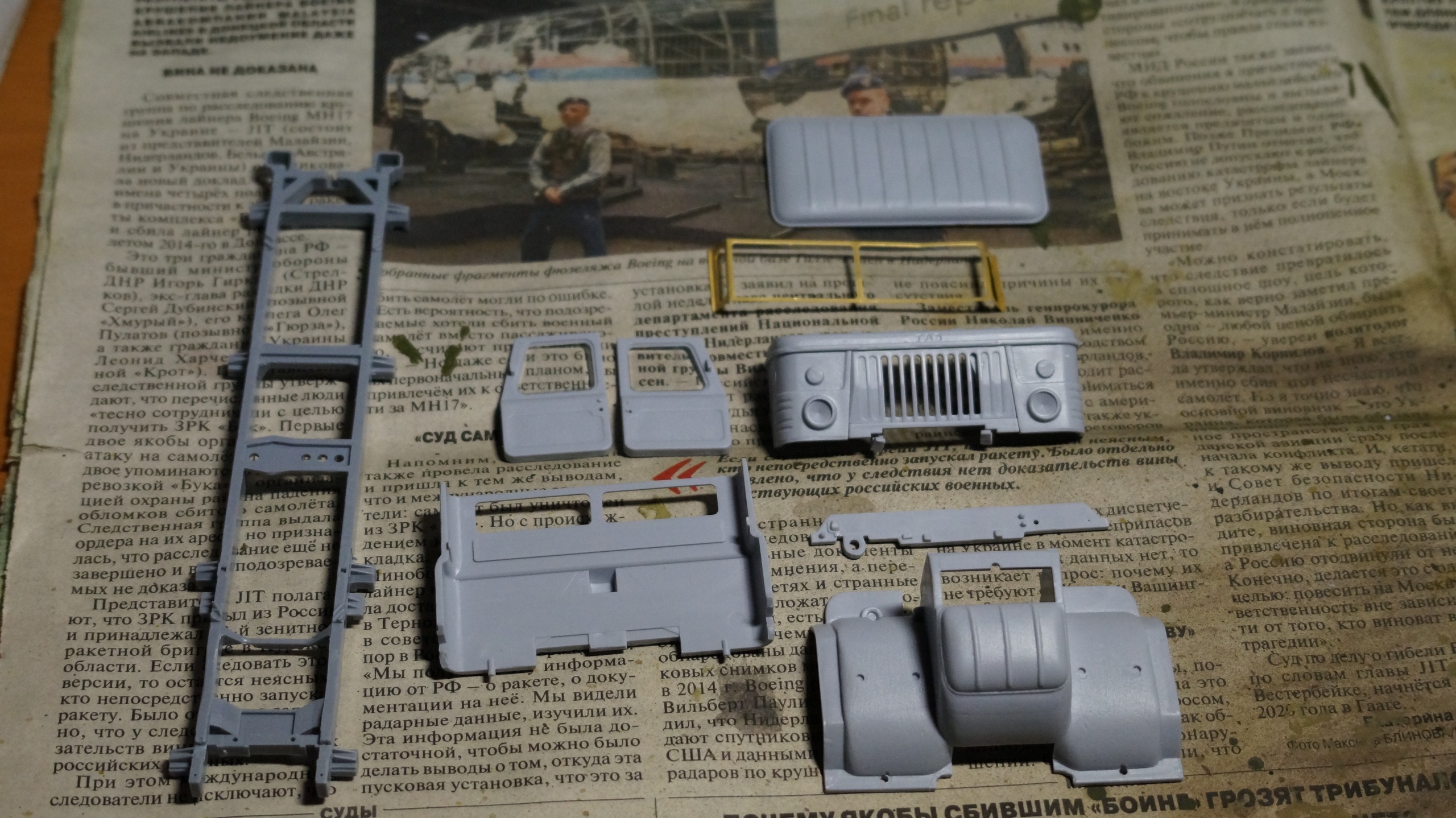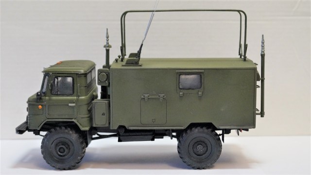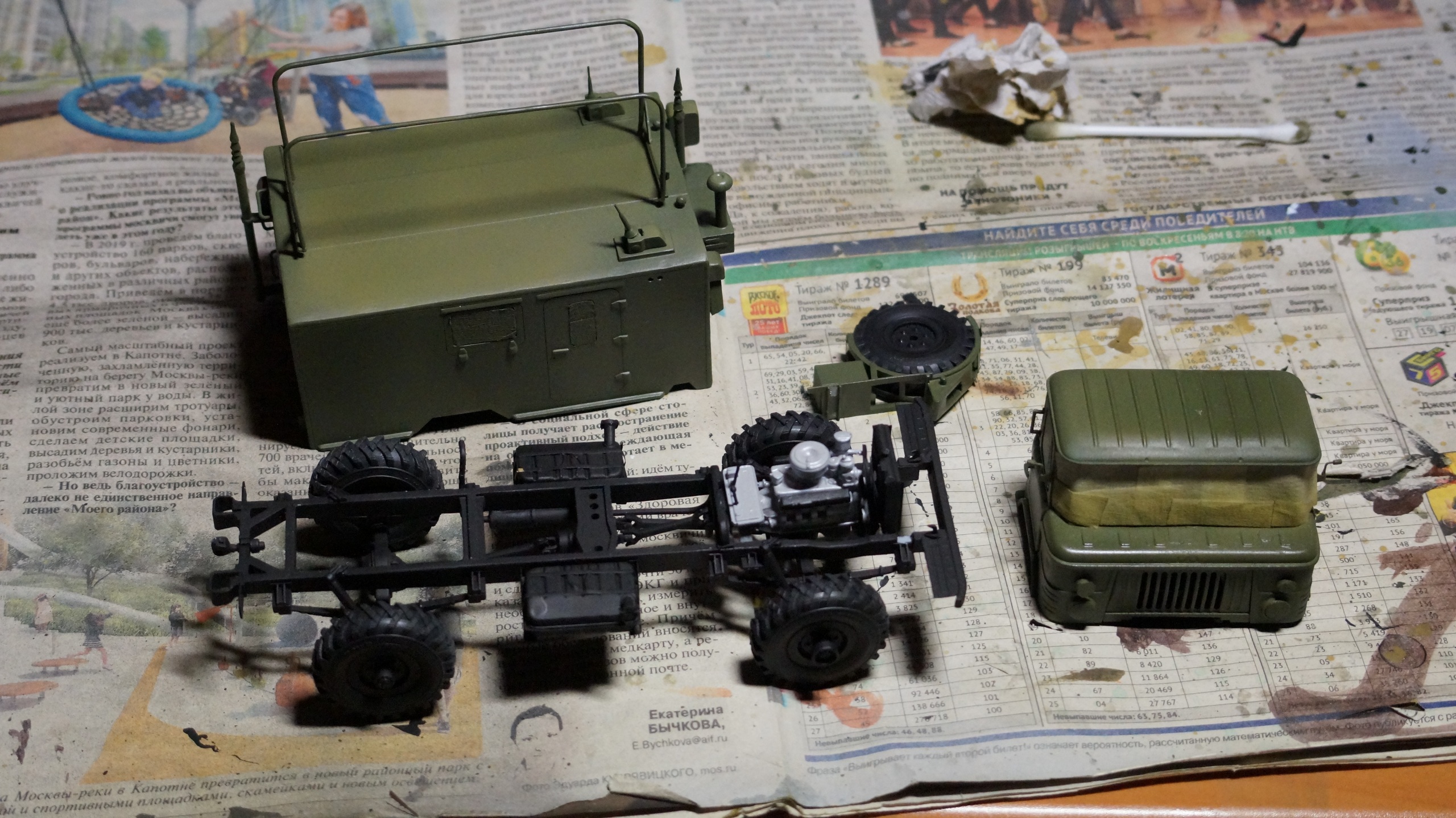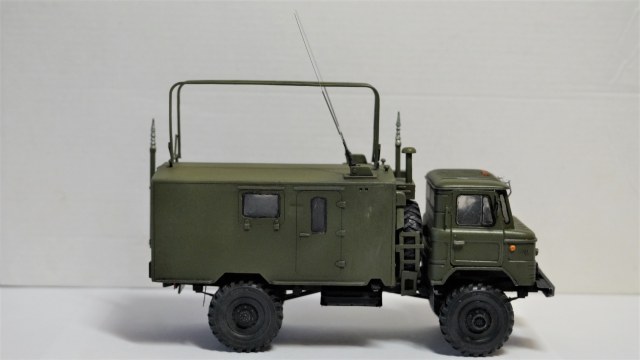 Собрал очередную модель - Р-142Н (ГАЗ-66) от "Восточного экспресса". Так как это вторая моя модель ГАЗ-66 от данного производителя, то в этот раз сборка прошла куда лучше. Даже кабина подвижная. В процессе сборки понял, что не следует собирать кунг по инструкции. Если клеить прибамбасы, что между ним и кабиной точно по местам, указанным в ней, то тогдазапаска не даст поставить кунг на раму. Как вариант - нафиг запаску, видел фото, есть варианты КШМ без нее. Также, опять же, согласно инструкции, на модели два ящика для ЗИПа, один собирается в рамках сборки кронштейна (или как он там называется) для запаски, а другой - в рамках сборки кунга. Получается, что один лишний. При сборке использовал фототравленку от "Микродизайна". Места установки фар рассверлил и вставил туда стекла фар и отражатели от «Elf». Передние поворотники срезал и вставил вместо них уменьшенные в диаметре стекла от фар из родного набора. Задние поворотники самодельные, вырезал из прозрачного ПВХ прямоугольники и раскрасил их цветными лаками от "ZIP". В качестве габаритных огней кабины использовал, предварительно обработав, маленькие пластиковые камушки из мозаичного набора для детей. Также, по мелочам, сделал дополнения: поручни сзади кунга из проволокипровод от боковой фары в кабину, обточил телескопические антенны, поставил антенны от "Magic Models". При тонировании делал прешейдинг модели. В базовый цвет красил краской от «Акана», ходовую часть - от «AK Interaktive». Смывку, лак и пигмент для запыления для передних поворотников использовал также от «AK Interaktive». Глянцевый и матовый лаки – от «MR Hobby». Получился, конечно, далеко не шедевр, однако, в целом я доволен результатом работы. Жаль, что фотографии получились так себе, но с освещением у меня просто беда.