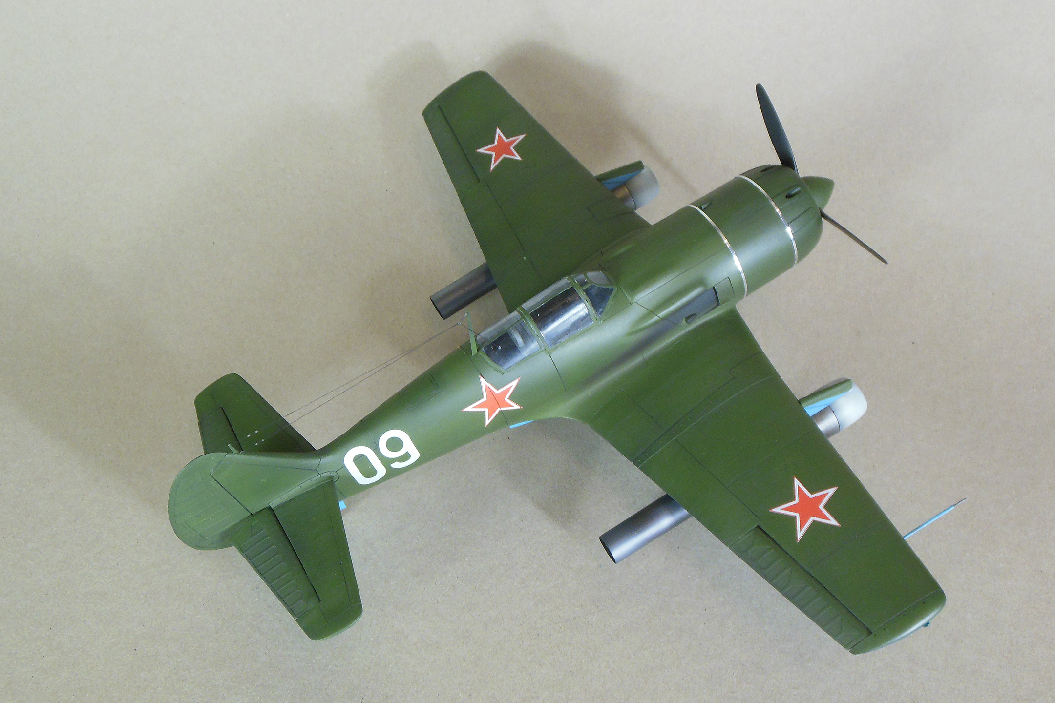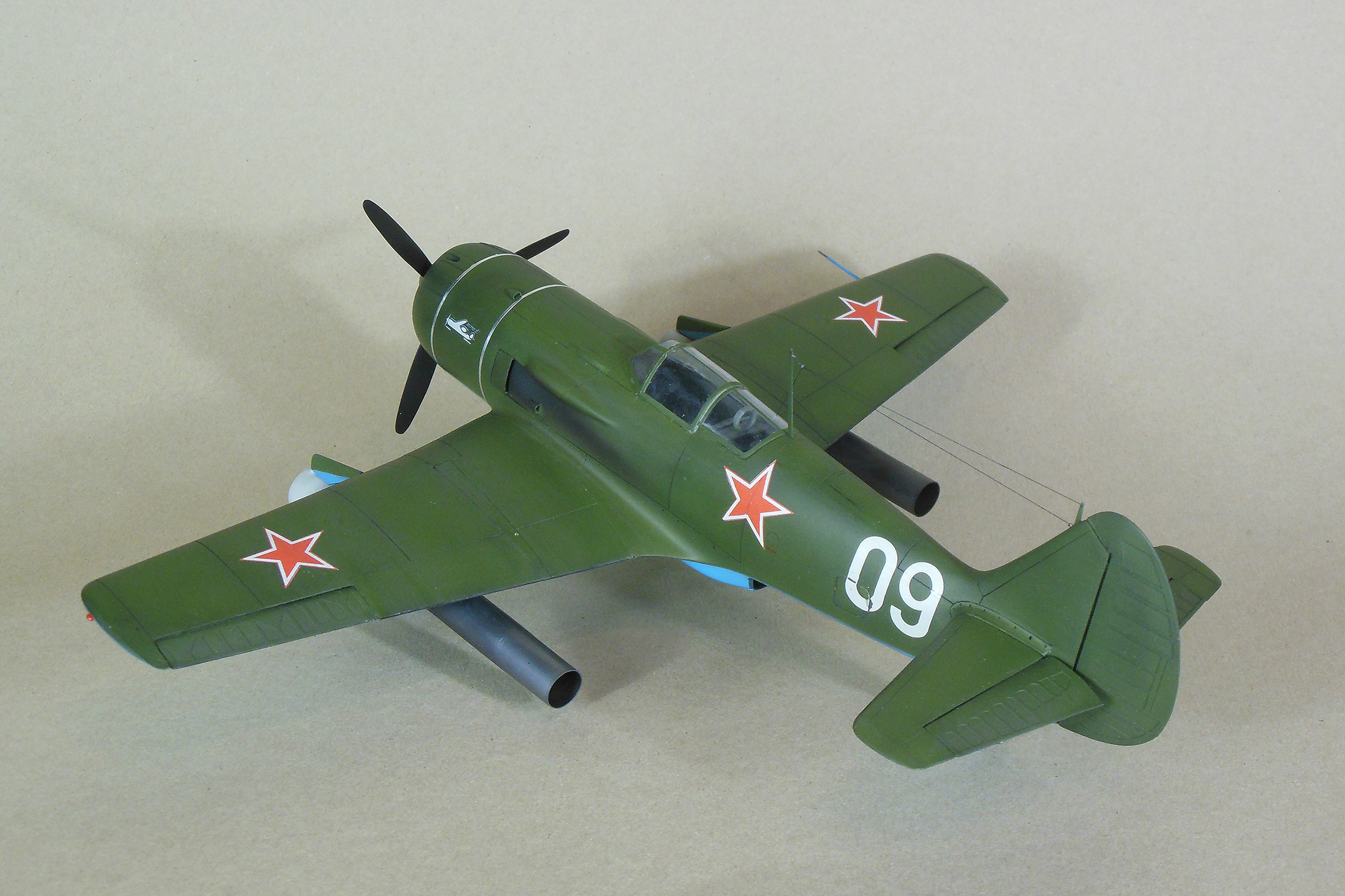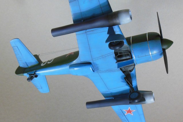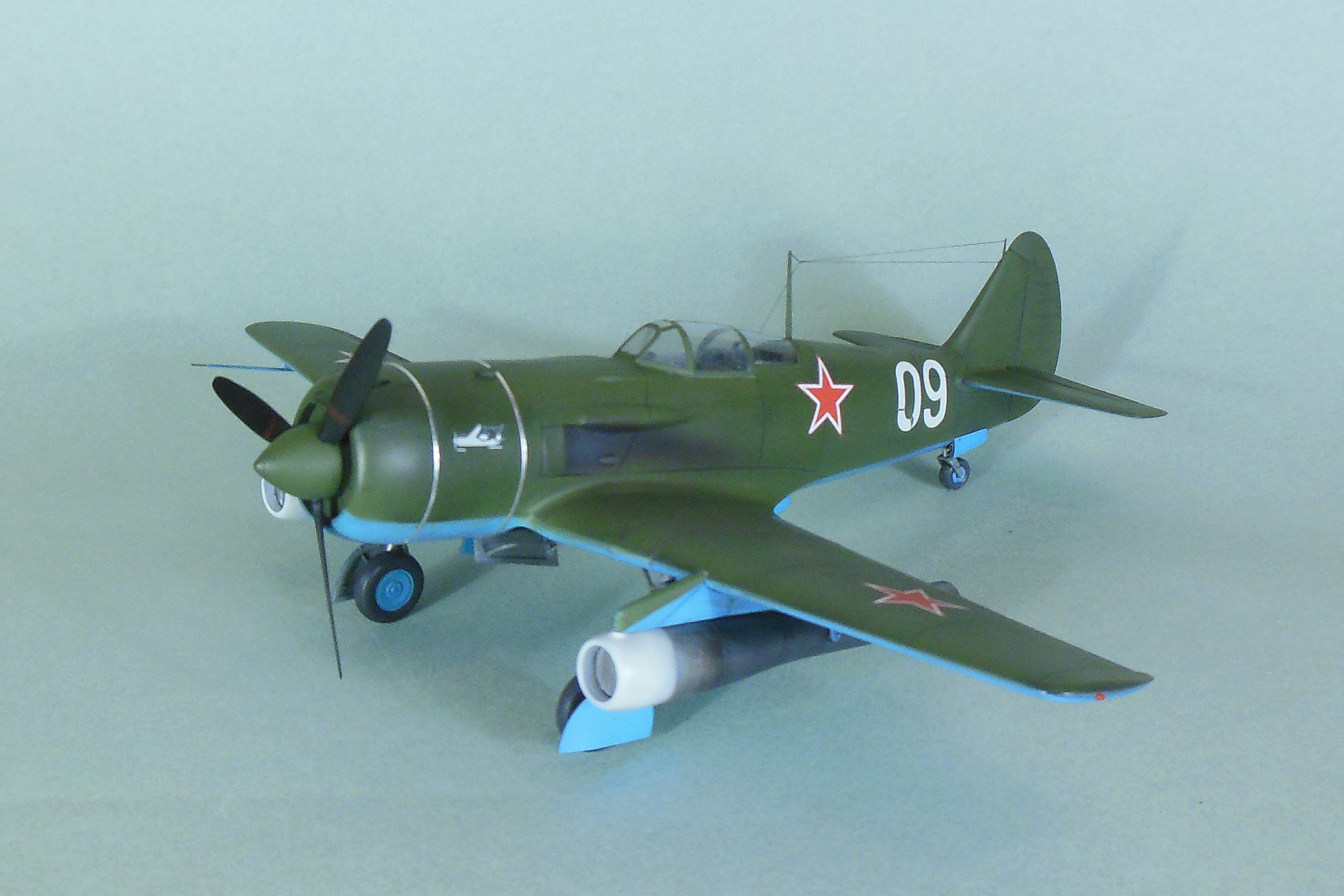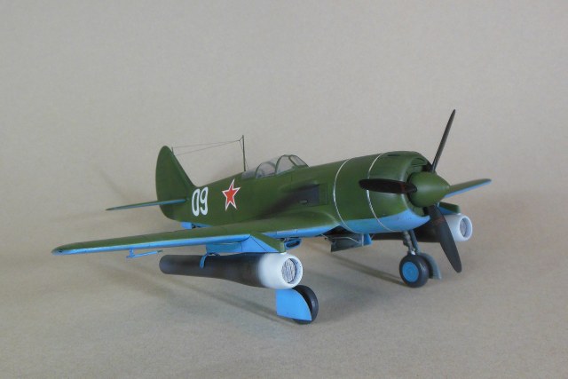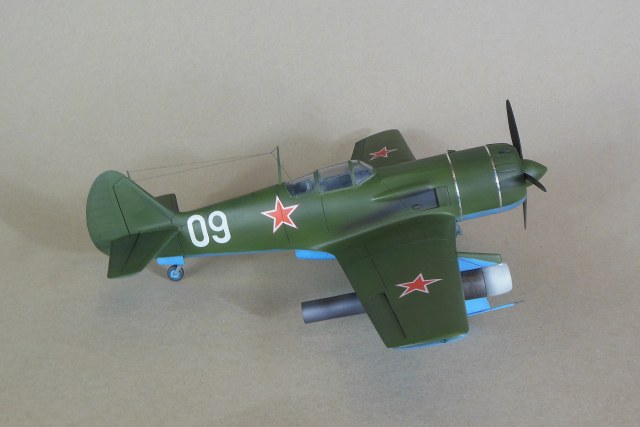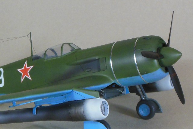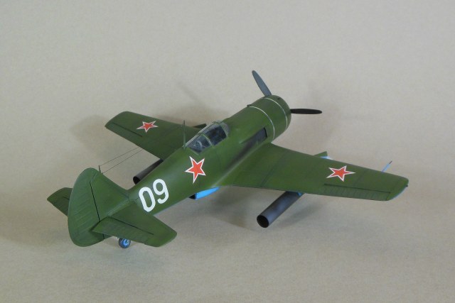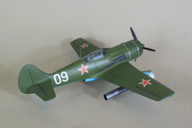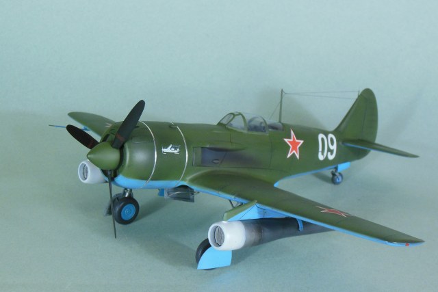 Кабина собирается моноблоком и вклеивается в фюзеляж, дается пленка с имитацией приборной доски, которую традиционно лучше сточить до приемлемой толщины, и прочее внутреннее убранство такое как бронеспинка, кресло, прицел и т.д. Фонарь дается в двух экземплярах. Ниша также вклеивается в фюзеляж, для ее установки необходимо доработать нижнюю часть фюзеляжа. Консоли сделаны полыми для облегчения конструкции, также в них делаются вырезы для установки ниш основных стоек шасси. Теперь что касается изготовления самой модели. Собрав и окрасив кабину, последняя была помещена на свое место, бронеспинка не устанавливалась, т.к. решено было построить модификацию РД, также был установлена самодельная антенна радиокомпаса в задней части кабины, что встречается на девятках и видно на фотографии прототипа. Сделаны вырезы под ниши шасси. Следует отметить, что все детали были снабжены самодельными штифтами из медной проволоки для надежности крепления. В процессе сборки переделал капот и пушечные порты, во-первых в мастер-модели сделал не совсем верно форму выреза, ну и в РД не было крайних пушек, их пришлось закрыть. Трудностей в сборке не возникло, все сошлось на «Ура», кое-где использовал шпатлевку. Добавил из алюминиевой фольги накладки на центроплане и люк на фюзеляже слева. Модель загрунтована черным грунтом Mr.Hobby для выявления мелких дефектов смолы, которые исправлены, затем отшлифована «совсем уставшей» наждачкой и окрашена. Слегка подтонирована, натянута антенна из нитки EZ Line. Мачты антенны традиционно выпилены из металла для живучести, просверлен ввод в задней части фонаря. Установлены БАНО от ЭЛЬФа, стяжные ленты на капоте из тойже фольги. Как говорил выше стойки армированные, только засверлить посадочные места в ниши и готово, подкосы створок основных стоек спаял из проволоки походящего диаметра. Декаль из набора отличного качества, тонкая и хорошо переводится без применения каких-либо вспомогательных жидкостей. В декале, кстати, предусмотрен бортовой номер «09» белый для борта И.М.Дзюбы. На капоте имеется характерный знак 21 завода, который мне сделал под заказ по моему эскизу Алексей Бацких за что ему респект. Автопульсирующие воздушно-реактивных двигателей РД-13 в данном наборе нет, я их добавлял уже по собственной инициативе, но при желании есть возможность приобрести целевой набор Ла-9РД этой же фирмы. Состоят они из трех частей: передней, центральной и сопла к каждому РД-13 идет пилон. Окрасил их под горелый металл, с оглядкой на фотографии. В целом модель оказалась желанной в ряду 32-го масштаба и при ее изготовлении получил массу позитива, чего и вам желаю, приятного просмотра.