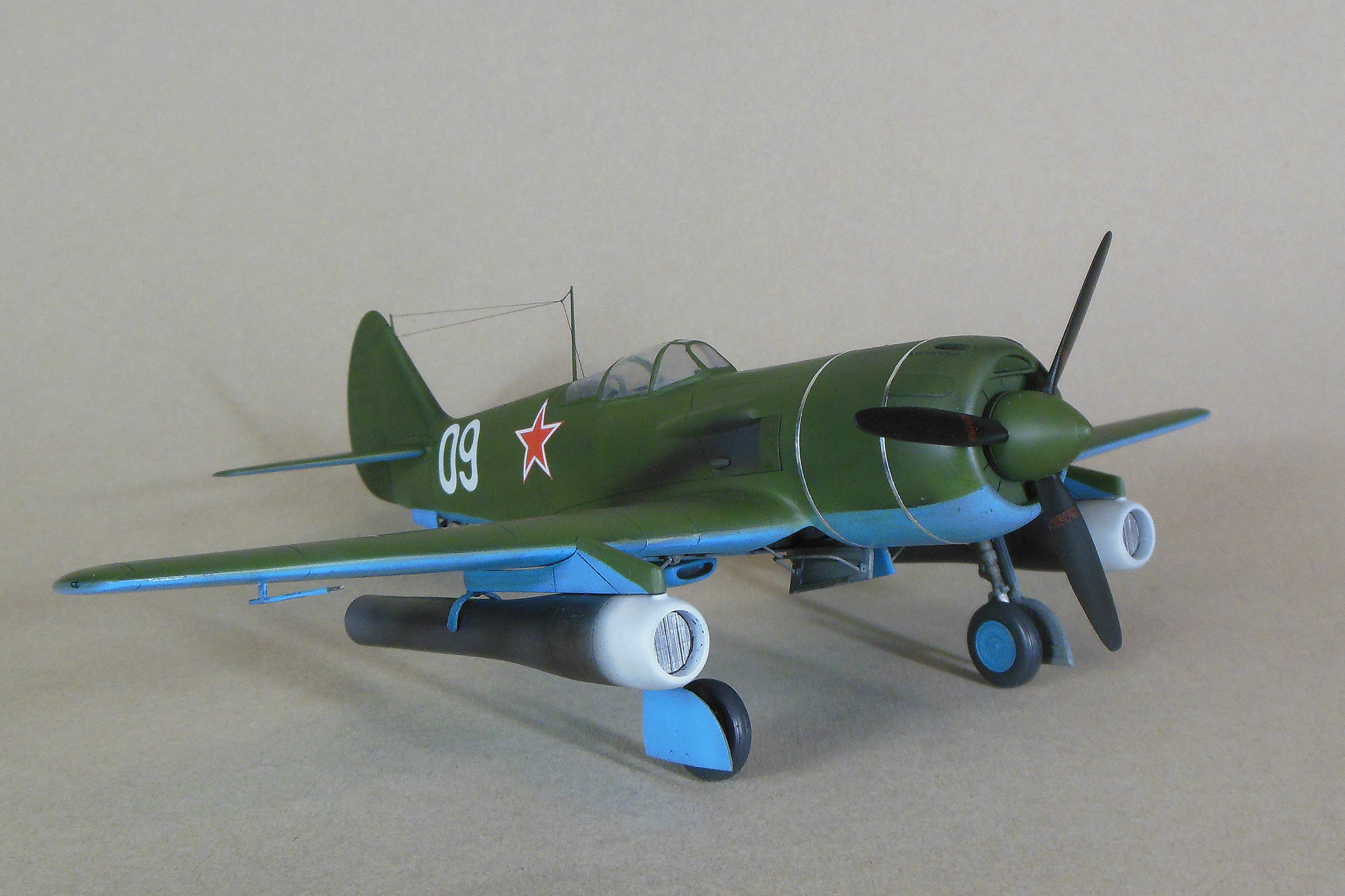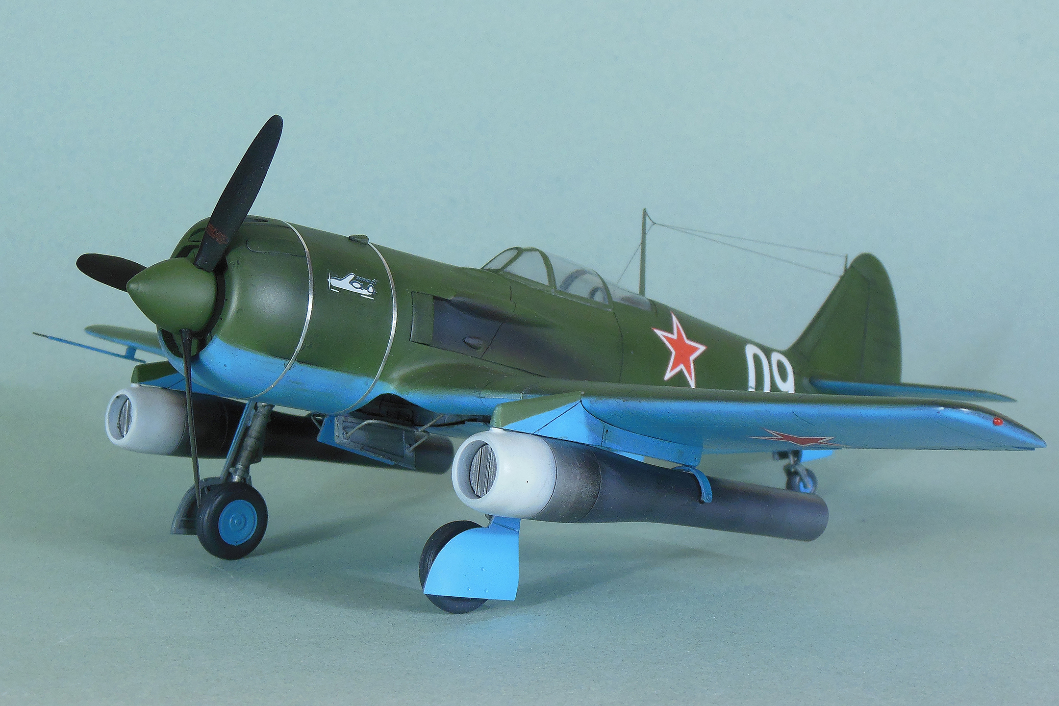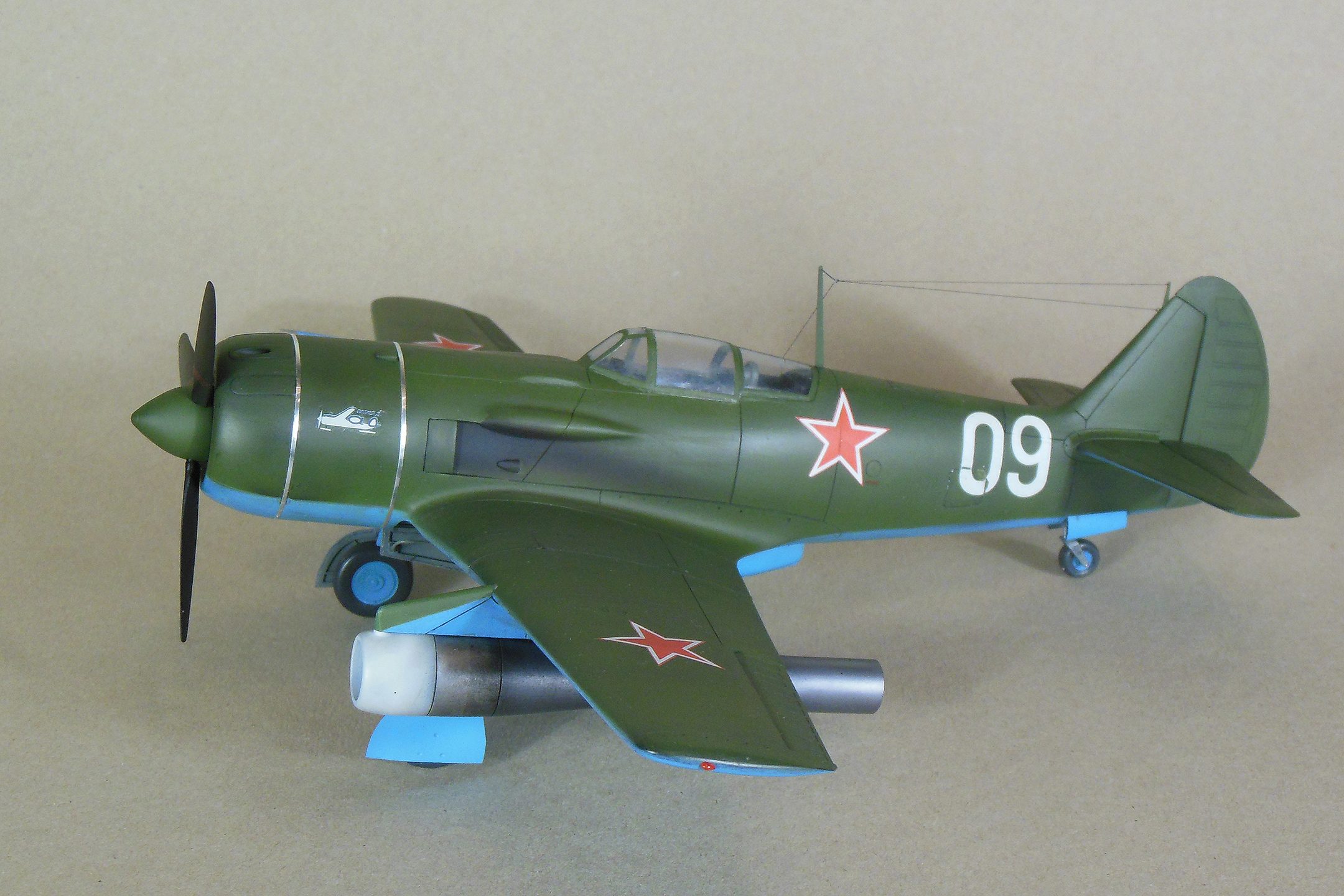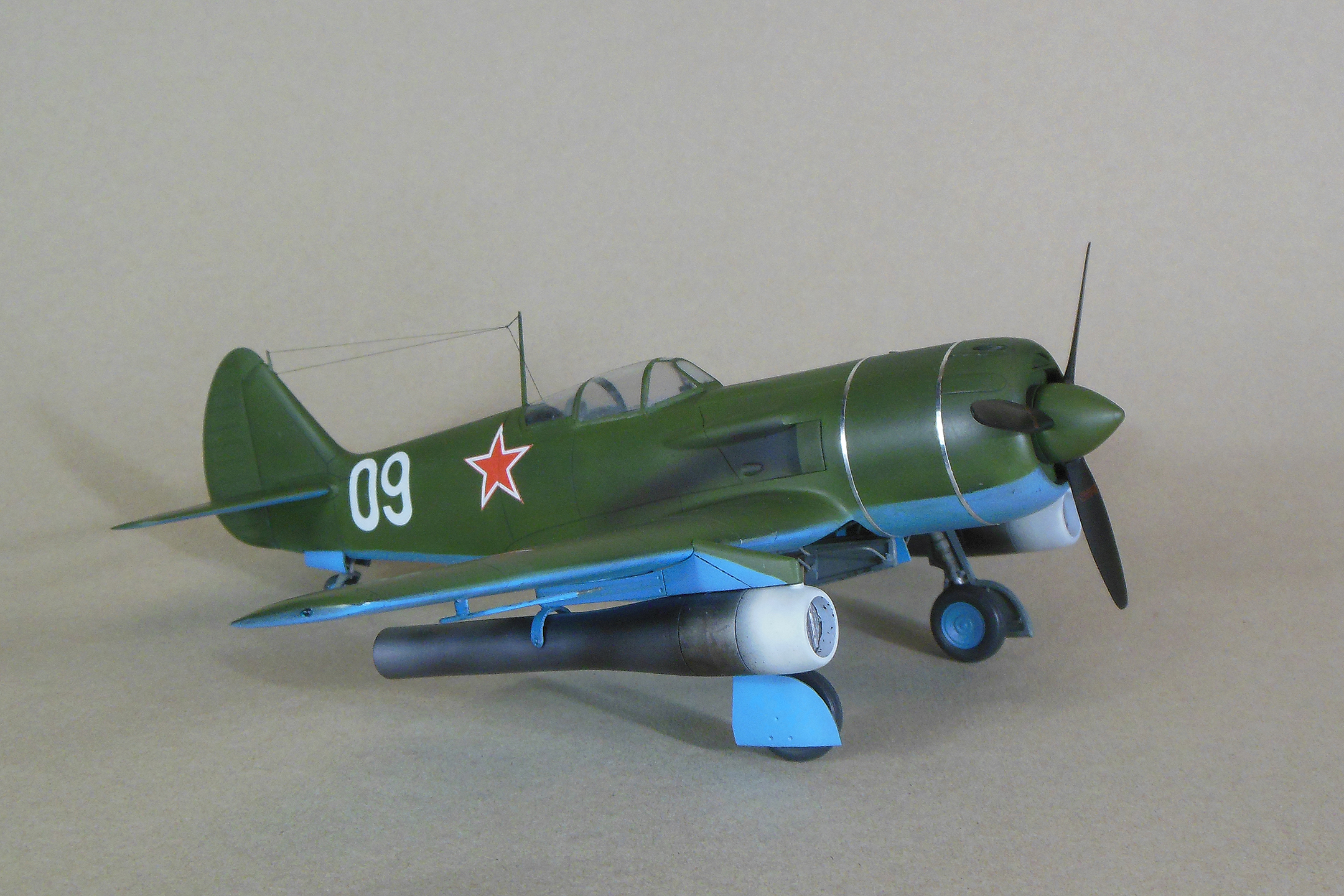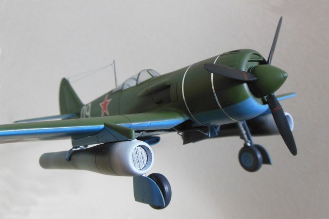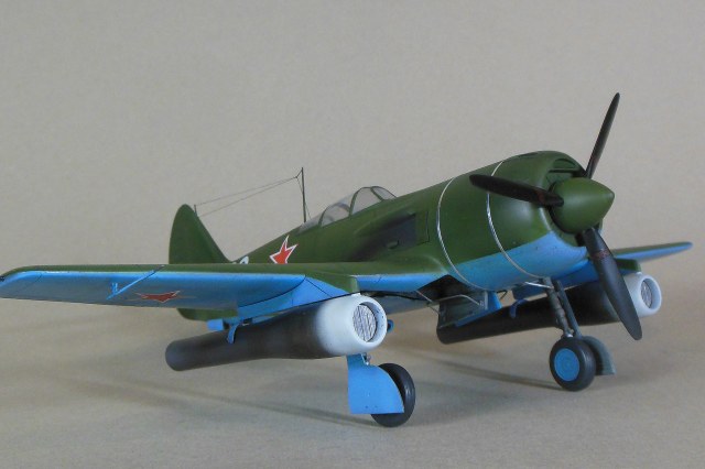 Приветствую уважаемое сообщество моделистов! Попробую рассказать вам свою историю постройки модели Ла-9 и как в процессе стройки она переросла в модификацию РД Если коснуться истории, то с 21 ноября 1947 г по 13 января 1948 г. проходил госиспытания серийный Ла-9 48210509 (Ла-9РД), оснащенный на 51-м заводе двумя автопульсирующими воздушно-реактивными двигателями РД-13 конструкции В.Н.Челомея. Ведущим летчиком-испытателем был И.М.Дзюба. На самолете изменили систему питания топливом, сняли бронеспинку, и две пушки НС-23, усилив конструкцию планера. Прирост скорости составил 70 км/ч. Летчик отмечал сильные вибрации и шум при включении ПуВРД. Подвеска ПуВРД ухудшала маневренные и взлетно-посадочные характеристики самолета. Запуск двигателей был ненадежным, резко снижалась продолжительность полета, усложнялась эксплуатация. Проведенные работы принесли пользу лишь при отработке прямоточных двигателей, предназначавшихся для установки на крылатые ракеты. Самолеты участвовали в воздушных парадах и неизменно своим грохотом производили сильное впечатление на публику. По свидетельству очевидцев в разных парадах участвовало от трех до девяти машин с ПуВРД. Кульминацией испытаний ПуВРД стал пролет девяти Ла-9РД летом 1947 г. на воздушном параде в Тушино. Пилотировали самолеты летчики-испытатели ГК НИИ ВВС В.И.Алексеенко. А.Г.Кубышкин. Л.М.Кувшинов, А.П.Манучаров. В.Г.Масич. Г.А.Седов, П.М.Стефановский, А.Г.Терентьев и В.П.Трофимов. Сама идея постройки зародилась после предложения сделать модель в 32 масштабе, и переросла в изготовление самой мастер-модели с расчетом изготовления также Ла-11. В работе, в основном, опирался на чертежи Н.Гордюкова, за неимением других более подробных, а также различные схемы, техническое описание, ну и помощь друзей. Приведя чертежи в свой масштаб выяснилось, что не без греха они, не сходились ниши шасси, пришлось весь этот узел сопоставлять с реальными фотографиями и рассчитывать новое положение ниш. Основными отличиями Ла-11 от девятки стало: капот с нижним радиатором и отсутствие последнего под фюзеляжем, стойка хвостовой опоры, и система подогрева носка крыла, тосчнее отверстия в крыле для функционирования этой системы. В настоящее время модели доступны в продаже под брендом LEM. Вкратце о содержимом коробки: Набор упакован в коробку из плотного картона с боковым изображением Ла-9, масштаба и названия фирмы изготовителя. Внутри представлены сами детали расфасованные в полиэтиленовую пленку с «пупырышками» исключающую повреждения при транспортировки, декаль на несколько вариантов в индивидуальном пакете и CD диск с документальными фотографиями прототипа и пошаговой фотосборкой. Модель отлита из полиуретановой смолы, кремового цвета, поверхность ровная без дефектов, расшивка аккуратная, показаны винты, клепки нет, недоливов нет. Членение выполнено следующим образом: половинки фюзеляжа с нишами шасси и кабиной пилота, капот с винтом, консоли, хвостовое оперение, стойки. Все стойки и подкосы армированные с расчетом на вес модели.