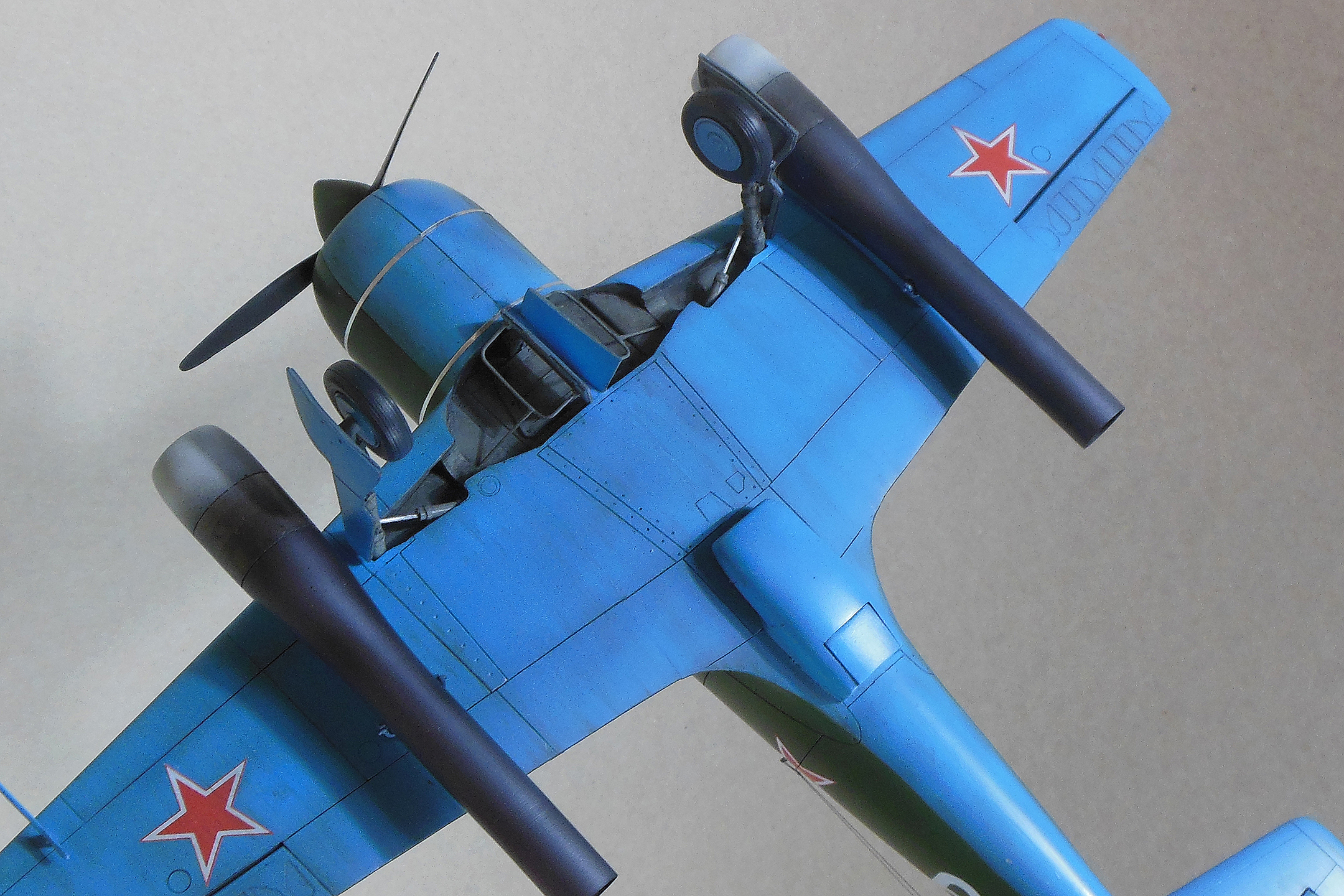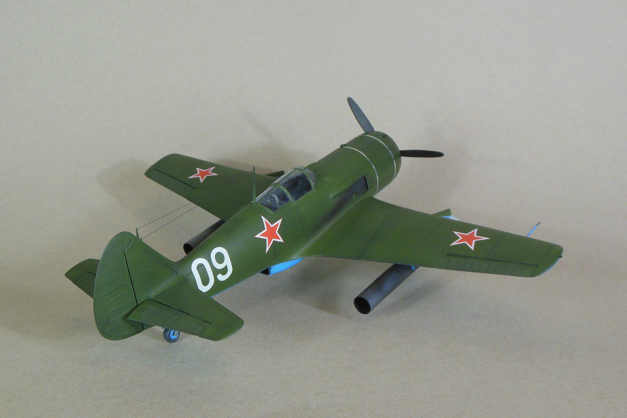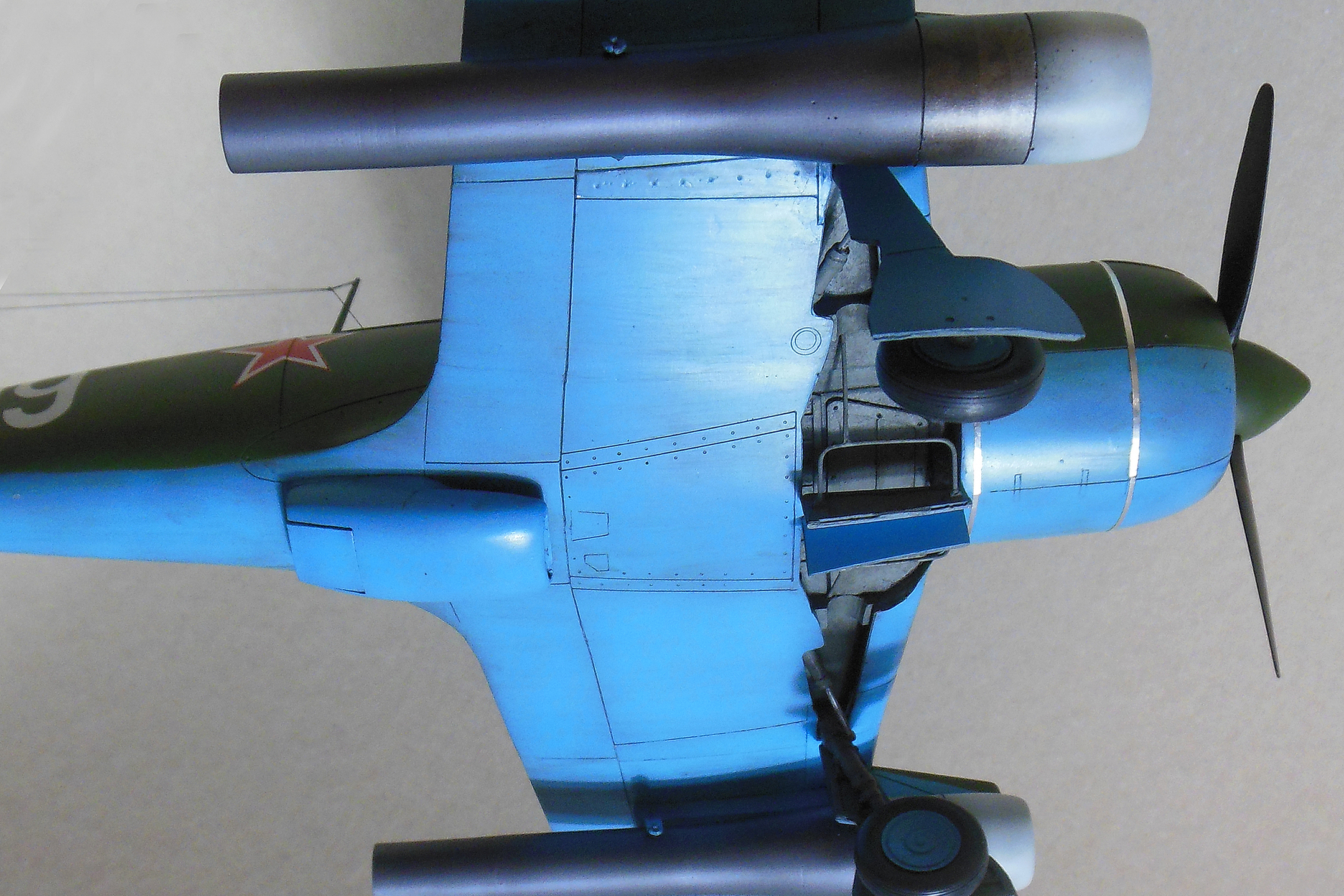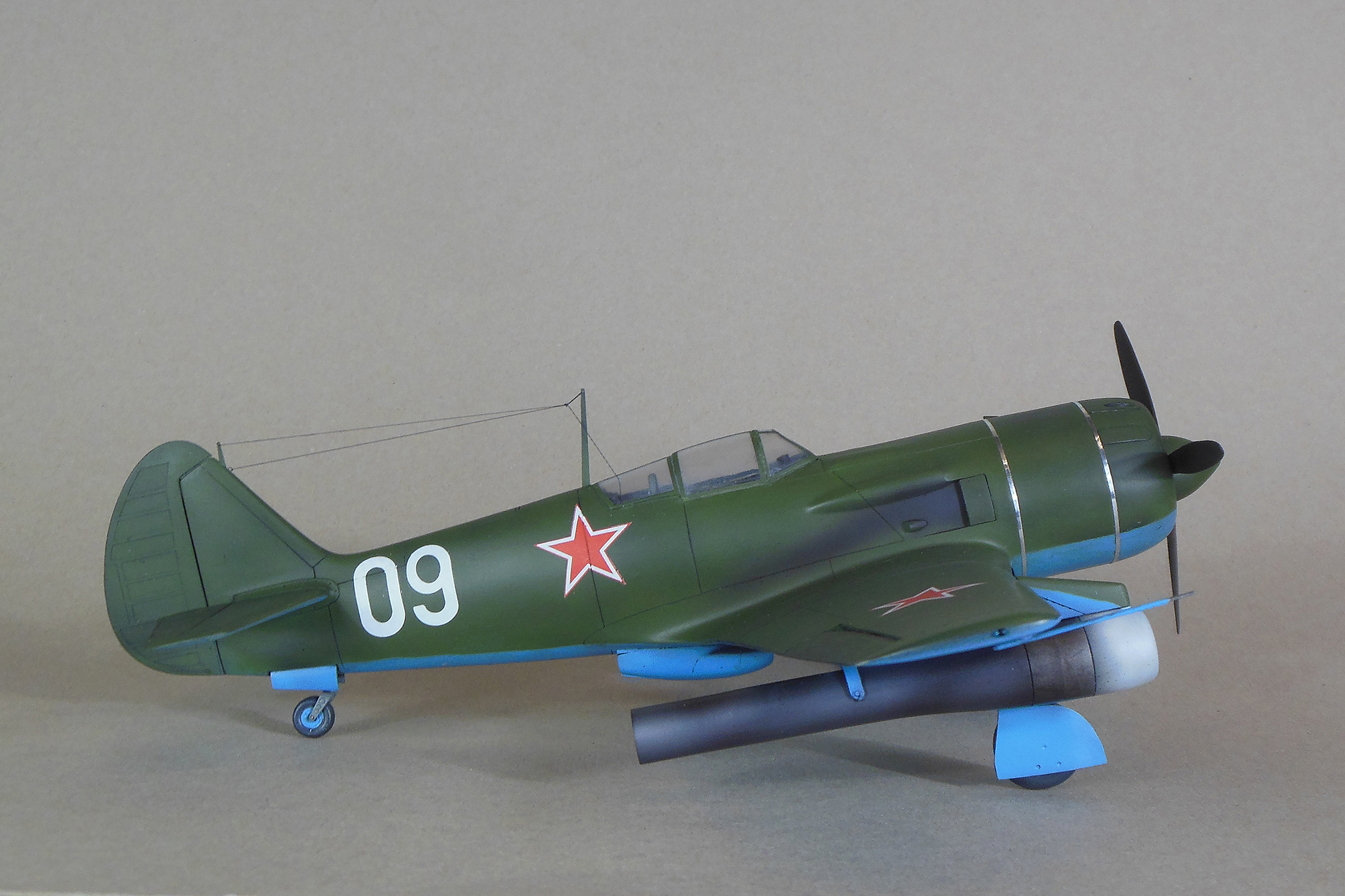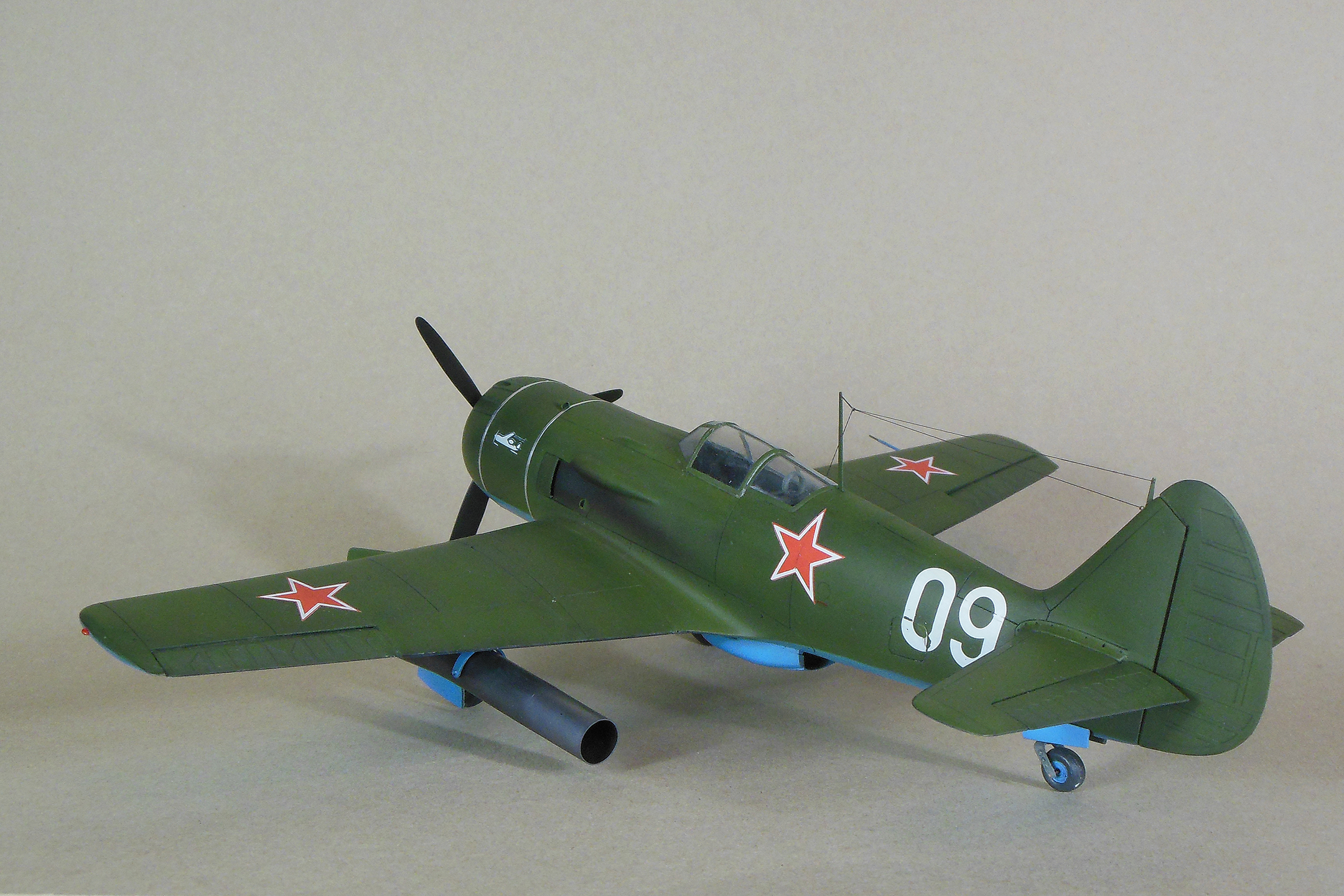 Приветствую уважаемое сообщество моделистов! Попробую рассказать вам свою историю постройки модели Ла-9 и как в процессе стройки она переросла в модификацию РД Если коснуться истории, то с 21 ноября 1947 г по 13 января 1948 г. проходил госиспытания серийный Ла-9 48210509 (Ла-9РД), оснащенный на 51-м заводе двумя автопульсирующими воздушно-реактивными двигателями РД-13 конструкции В.Н.Челомея. Ведущим летчиком-испытателем был И.М.Дзюба. На самолете изменили систему питания топливом, сняли бронеспинку, и две пушки НС-23, усилив конструкцию планера. Прирост скорости составил 70 км/ч. Летчик отмечал сильные вибрации и шум при включении ПуВРД. Подвеска ПуВРД ухудшала маневренные и взлетно-посадочные характеристики самолета. Запуск двигателей был ненадежным, резко снижалась продолжительность полета, усложнялась эксплуатация. Проведенные работы принесли пользу лишь при отработке прямоточных двигателей, предназначавшихся для установки на крылатые ракеты. Самолеты участвовали в воздушных парадах и неизменно своим грохотом производили сильное впечатление на публику. По свидетельству очевидцев в разных парадах участвовало от трех до девяти машин с ПуВРД. Кульминацией испытаний ПуВРД стал пролет девяти Ла-9РД летом 1947 г. на воздушном параде в Тушино. Пилотировали самолеты летчики-испытатели ГК НИИ ВВС В.И.Алексеенко. А.Г.Кубышкин. Л.М.Кувшинов, А.П.Манучаров. В.Г.Масич. Г.А.Седов, П.М.Стефановский, А.Г.Терентьев и В.П.Трофимов. Сама идея постройки зародилась после предложения сделать модель в 32 масштабе, и переросла в изготовление самой мастер-модели с расчетом изготовления также Ла-11. В работе, в основном, опирался на чертежи Н.Гордюкова, за неимением других более подробных, а также различные схемы, техническое описание, ну и помощь друзей. Приведя чертежи в свой масштаб выяснилось, что не без греха они, не сходились ниши шасси, пришлось весь этот узел сопоставлять с реальными фотографиями и рассчитывать новое положение ниш. Основными отличиями Ла-11 от девятки стало: капот с нижним радиатором и отсутствие последнего под фюзеляжем, стойка хвостовой опоры, и система подогрева носка крыла, тосчнее отверстия в крыле для функционирования этой системы. В настоящее время модели доступны в продаже под брендом LEM. Вкратце о содержимом коробки: Набор упакован в коробку из плотного картона с боковым изображением Ла-9, масштаба и названия фирмы изготовителя. Внутри представлены сами детали расфасованные в полиэтиленовую пленку с «пупырышками» исключающую повреждения при транспортировки, декаль на несколько вариантов в индивидуальном пакете и CD диск с документальными фотографиями прототипа и пошаговой фотосборкой. Модель отлита из полиуретановой смолы, кремового цвета, поверхность ровная без дефектов, расшивка аккуратная, показаны винты, клепки нет, недоливов нет. Членение выполнено следующим образом: половинки фюзеляжа с нишами шасси и кабиной пилота, капот с винтом, консоли, хвостовое оперение, стойки. Все стойки и подкосы армированные с расчетом на вес модели.