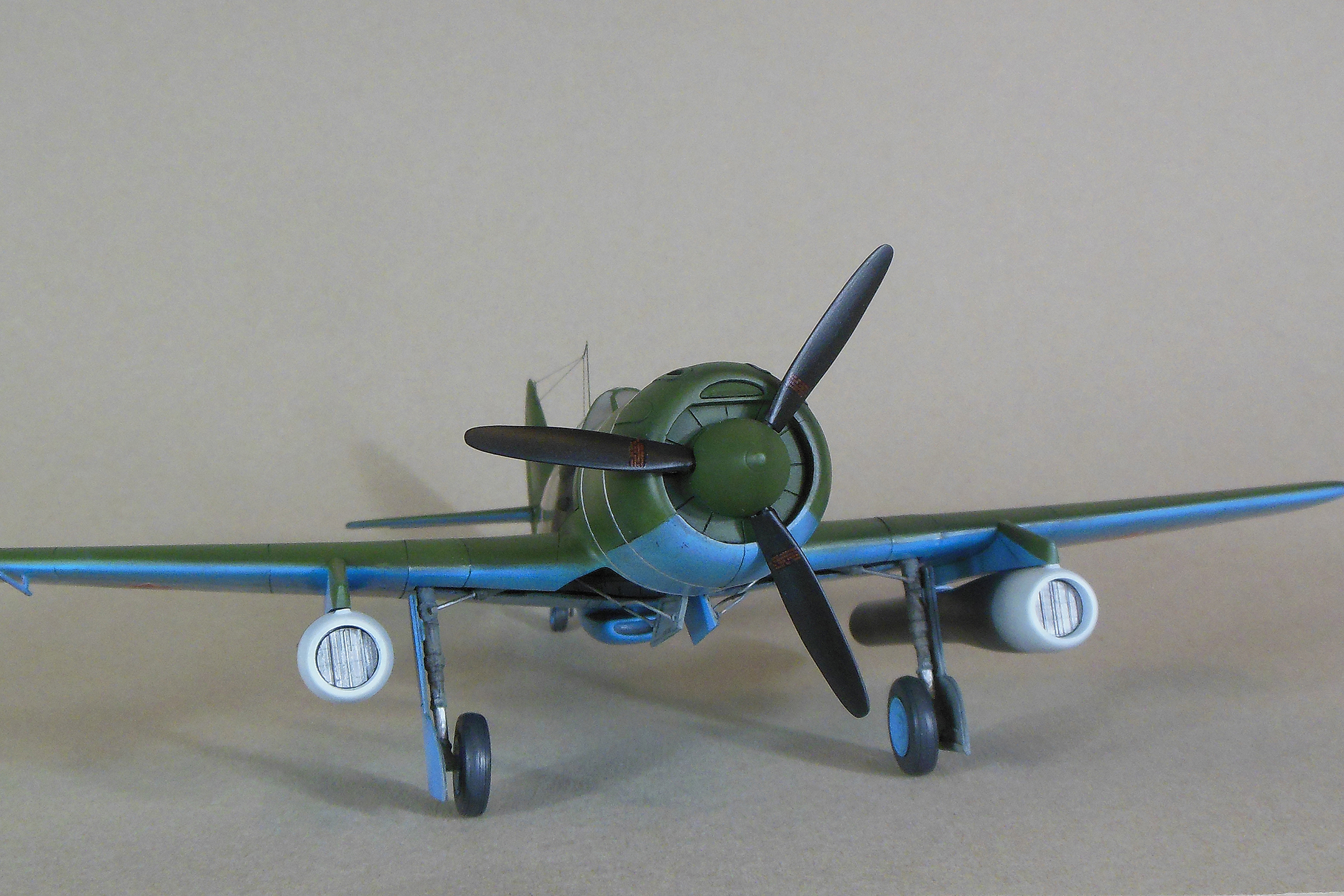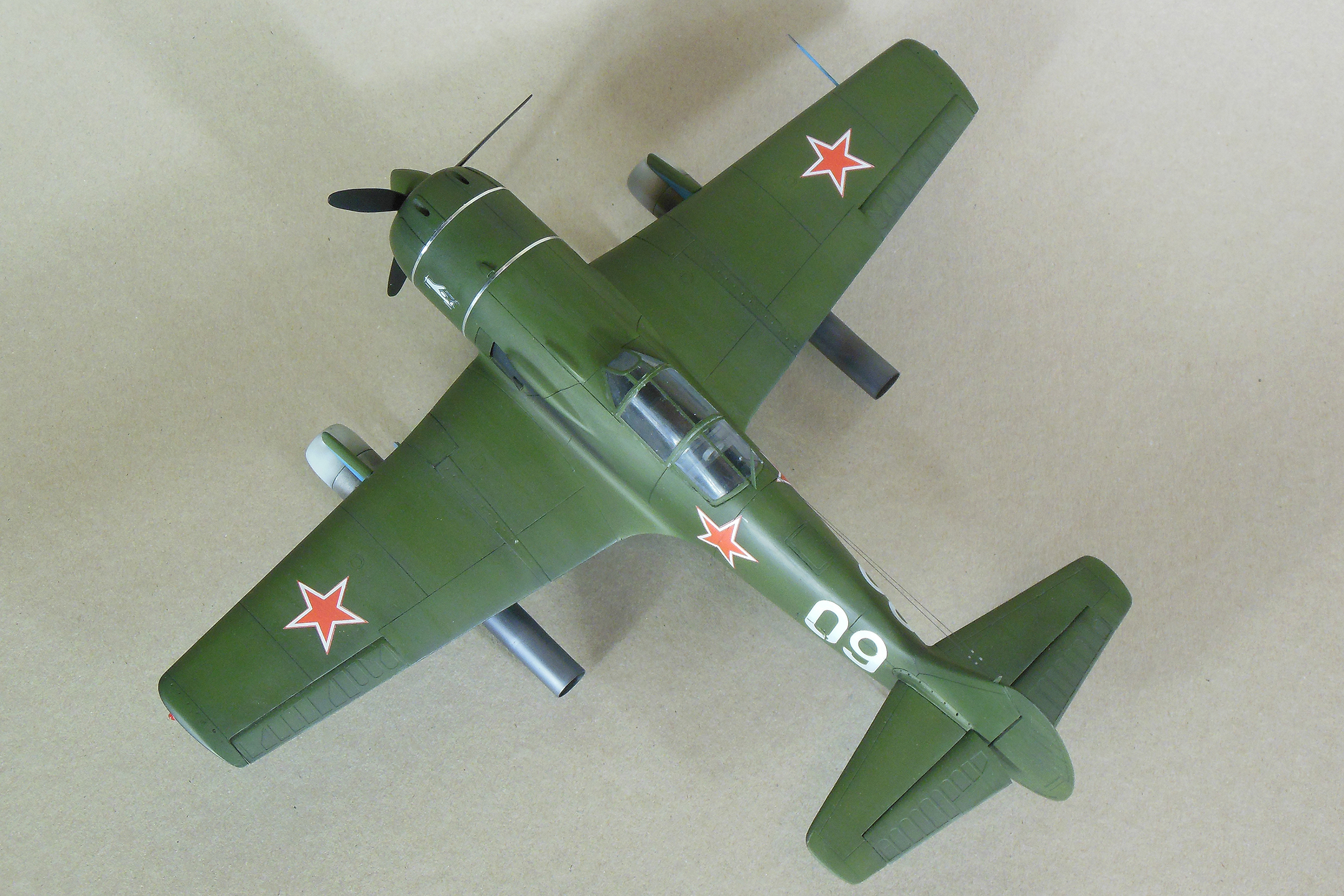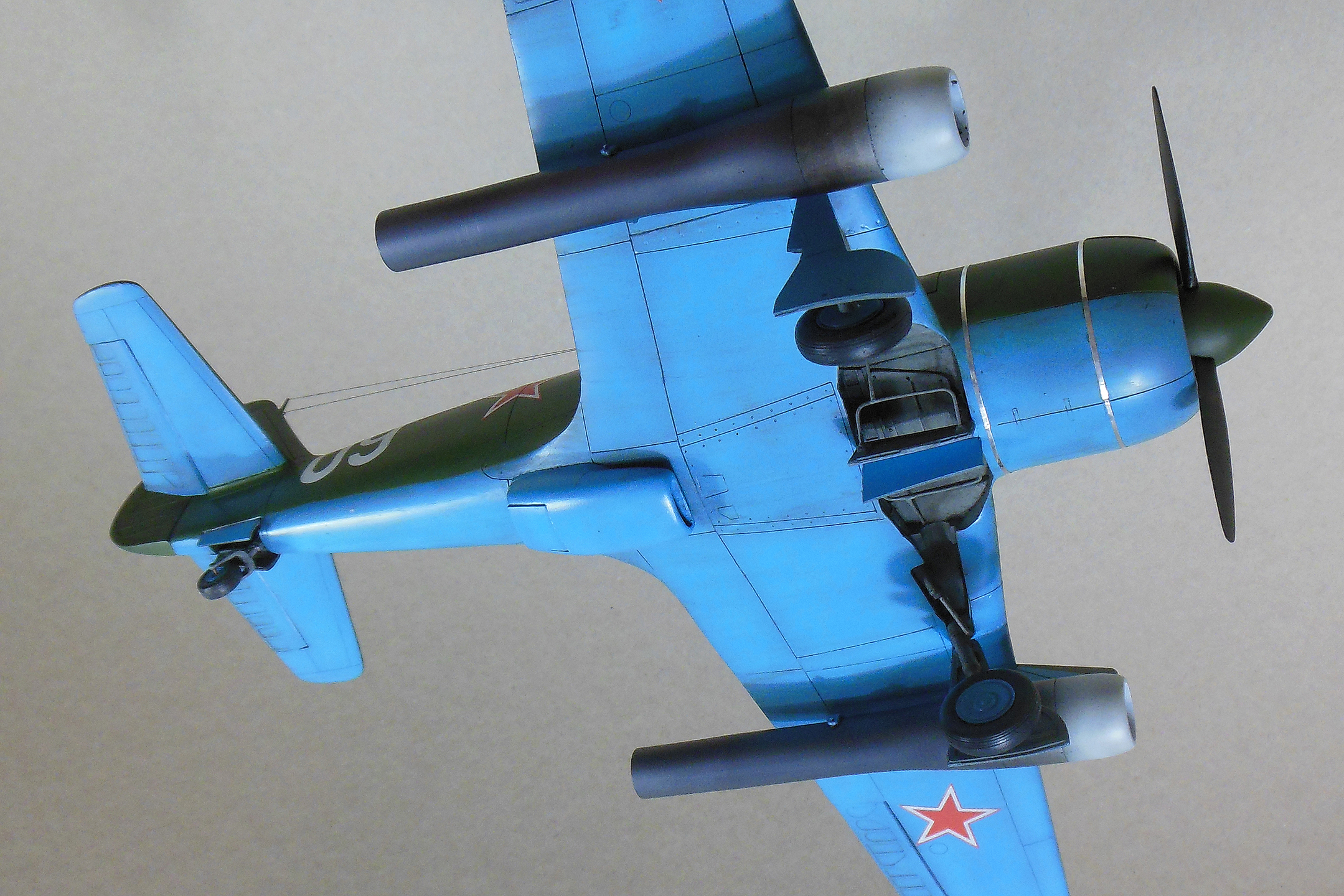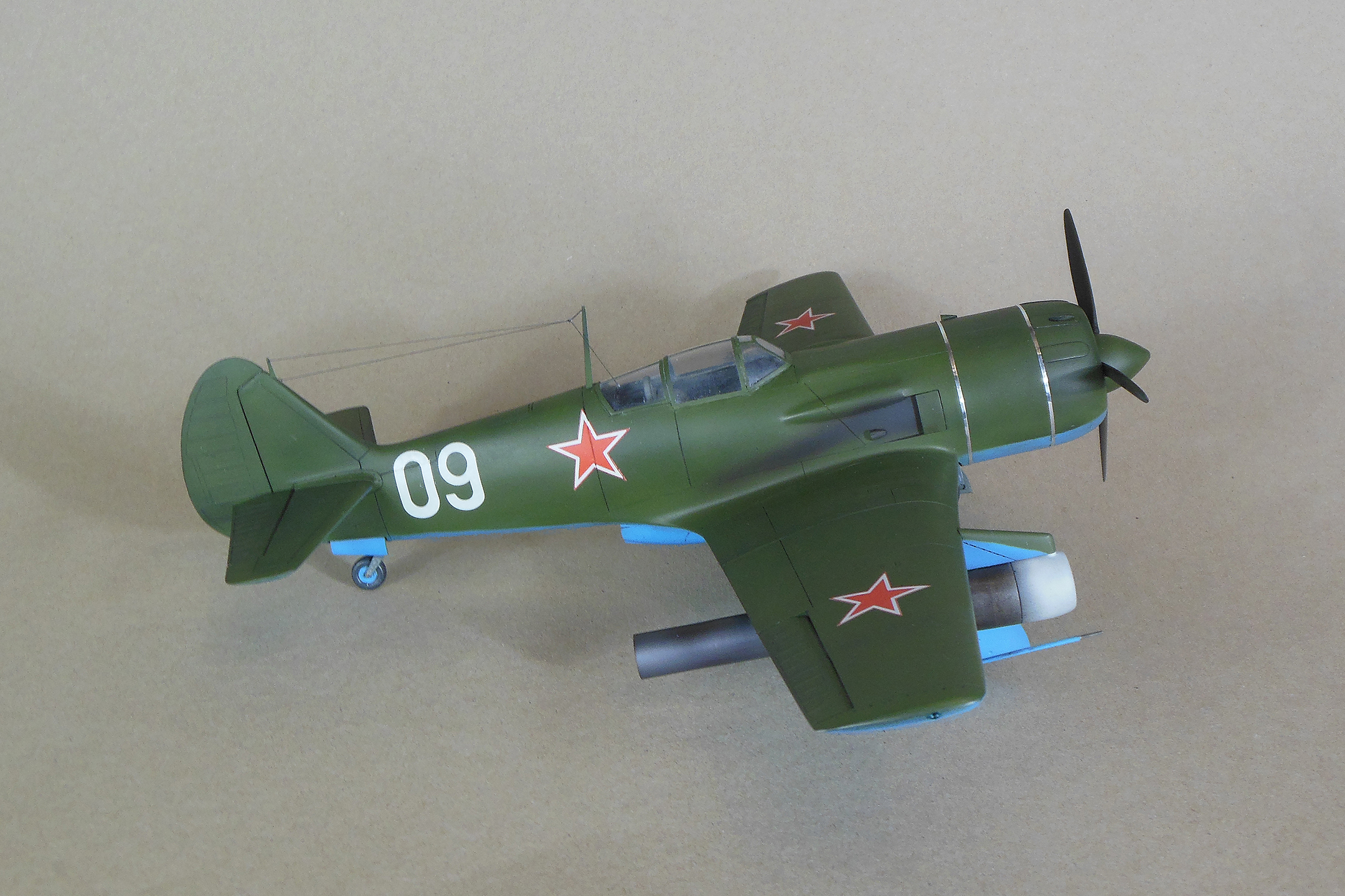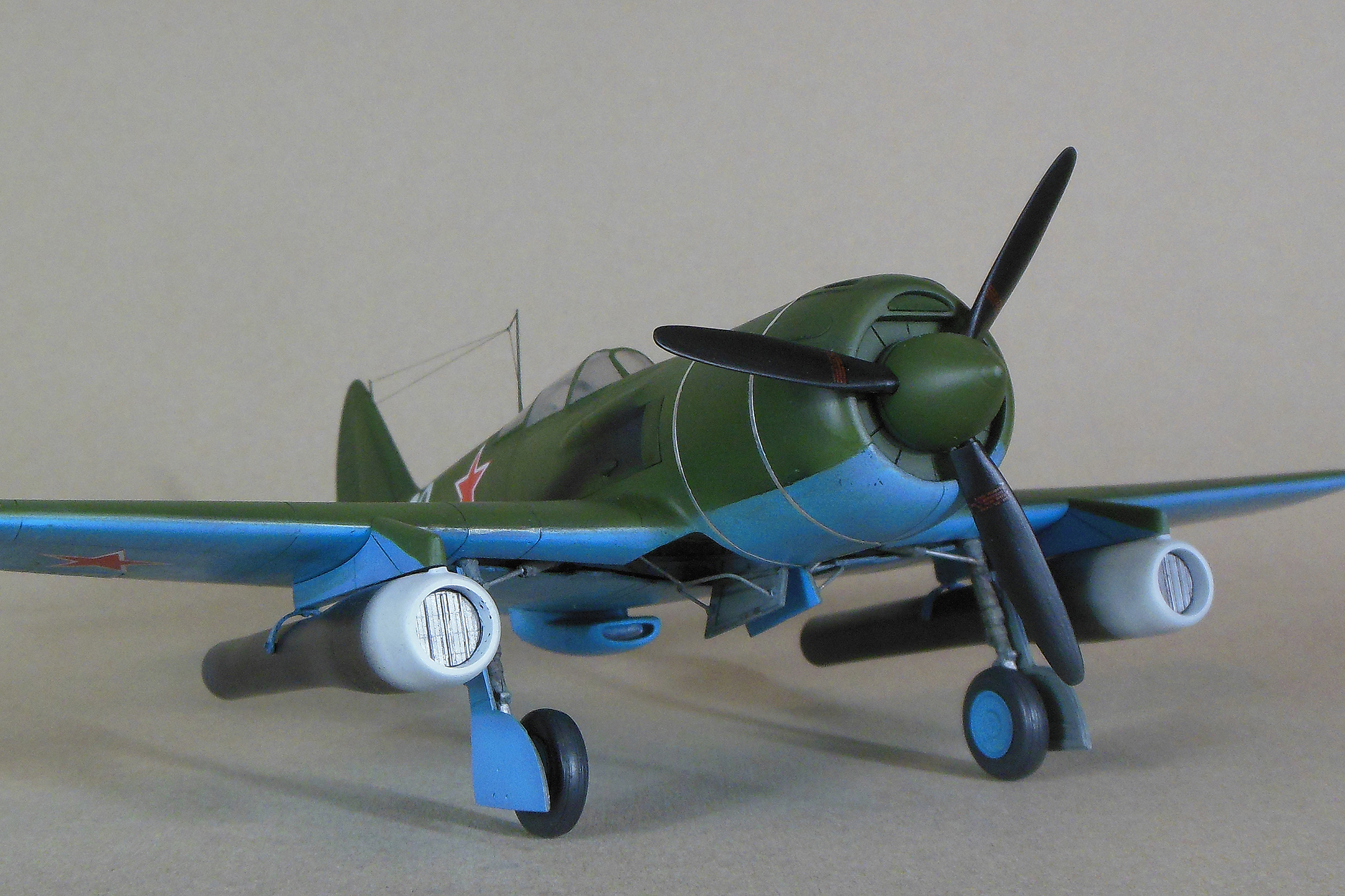 Приветствую уважаемое сообщество моделистов! Попробую рассказать вам свою историю постройки модели Ла-9 и как в процессе стройки она переросла в модификацию РД Если коснуться истории, то с 21 ноября 1947 г по 13 января 1948 г. проходил госиспытания серийный Ла-9 48210509 (Ла-9РД), оснащенный на 51-м заводе двумя автопульсирующими воздушно-реактивными двигателями РД-13 конструкции В.Н.Челомея. Ведущим летчиком-испытателем был И.М.Дзюба. На самолете изменили систему питания топливом, сняли бронеспинку, и две пушки НС-23, усилив конструкцию планера. Прирост скорости составил 70 км/ч. Летчик отмечал сильные вибрации и шум при включении ПуВРД. Подвеска ПуВРД ухудшала маневренные и взлетно-посадочные характеристики самолета. Запуск двигателей был ненадежным, резко снижалась продолжительность полета, усложнялась эксплуатация. Проведенные работы принесли пользу лишь при отработке прямоточных двигателей, предназначавшихся для установки на крылатые ракеты. Самолеты участвовали в воздушных парадах и неизменно своим грохотом производили сильное впечатление на публику. По свидетельству очевидцев в разных парадах участвовало от трех до девяти машин с ПуВРД. Кульминацией испытаний ПуВРД стал пролет девяти Ла-9РД летом 1947 г. на воздушном параде в Тушино. Пилотировали самолеты летчики-испытатели ГК НИИ ВВС В.И.Алексеенко. А.Г.Кубышкин. Л.М.Кувшинов, А.П.Манучаров. В.Г.Масич. Г.А.Седов, П.М.Стефановский, А.Г.Терентьев и В.П.Трофимов. Сама идея постройки зародилась после предложения сделать модель в 32 масштабе, и переросла в изготовление самой мастер-модели с расчетом изготовления также Ла-11. В работе, в основном, опирался на чертежи Н.Гордюкова, за неимением других более подробных, а также различные схемы, техническое описание, ну и помощь друзей. Приведя чертежи в свой масштаб выяснилось, что не без греха они, не сходились ниши шасси, пришлось весь этот узел сопоставлять с реальными фотографиями и рассчитывать новое положение ниш. Основными отличиями Ла-11 от девятки стало: капот с нижним радиатором и отсутствие последнего под фюзеляжем, стойка хвостовой опоры, и система подогрева носка крыла, тосчнее отверстия в крыле для функционирования этой системы. В настоящее время модели доступны в продаже под брендом LEM. Вкратце о содержимом коробки: Набор упакован в коробку из плотного картона с боковым изображением Ла-9, масштаба и названия фирмы изготовителя. Внутри представлены сами детали расфасованные в полиэтиленовую пленку с «пупырышками» исключающую повреждения при транспортировки, декаль на несколько вариантов в индивидуальном пакете и CD диск с документальными фотографиями прототипа и пошаговой фотосборкой. Модель отлита из полиуретановой смолы, кремового цвета, поверхность ровная без дефектов, расшивка аккуратная, показаны винты, клепки нет, недоливов нет. Членение выполнено следующим образом: половинки фюзеляжа с нишами шасси и кабиной пилота, капот с винтом, консоли, хвостовое оперение, стойки. Все стойки и подкосы армированные с расчетом на вес модели.