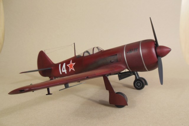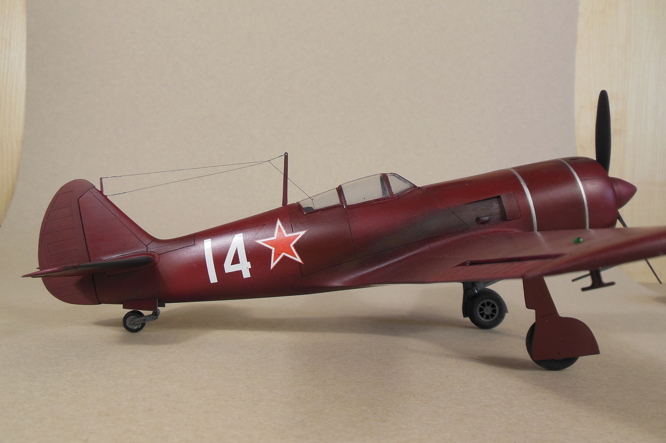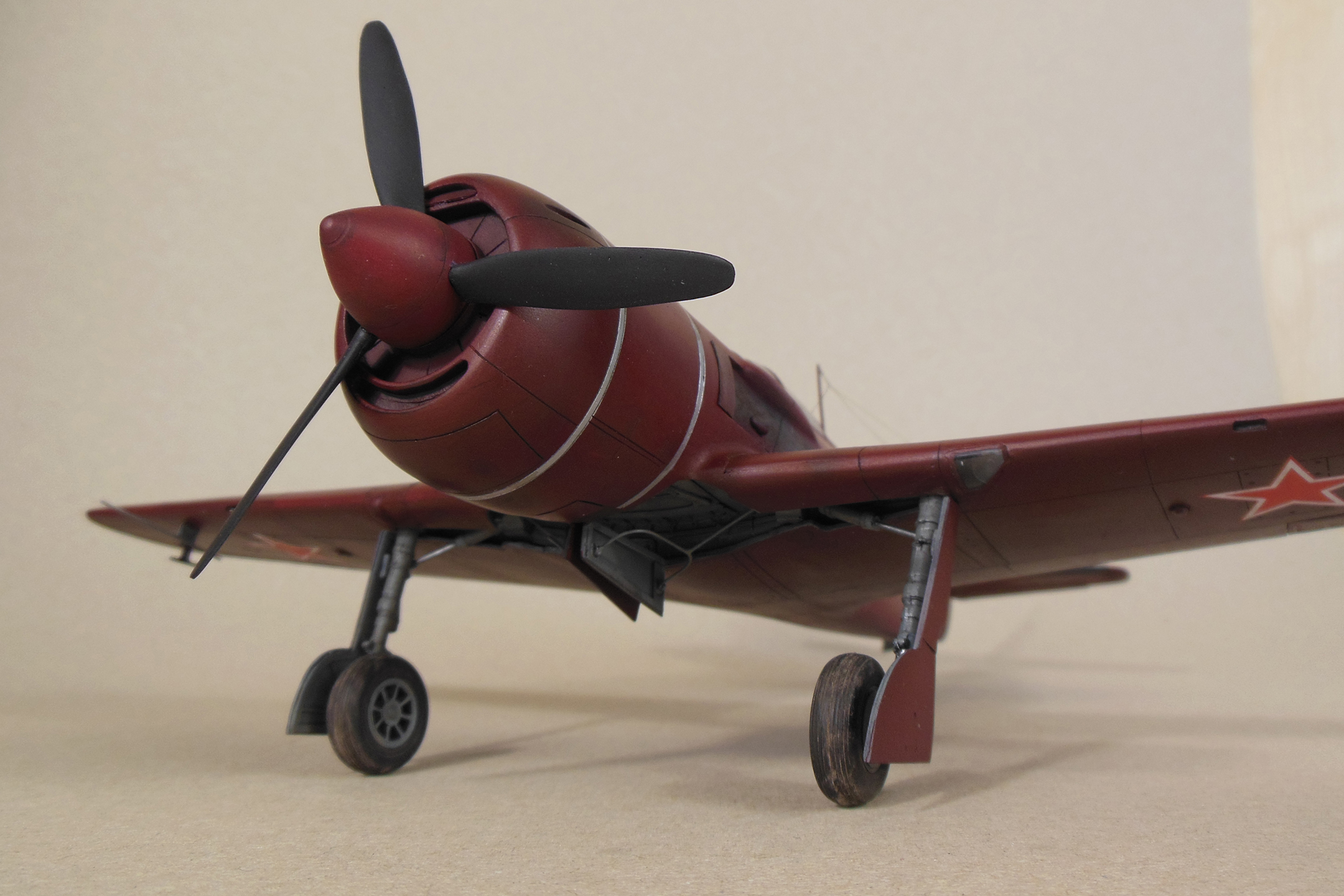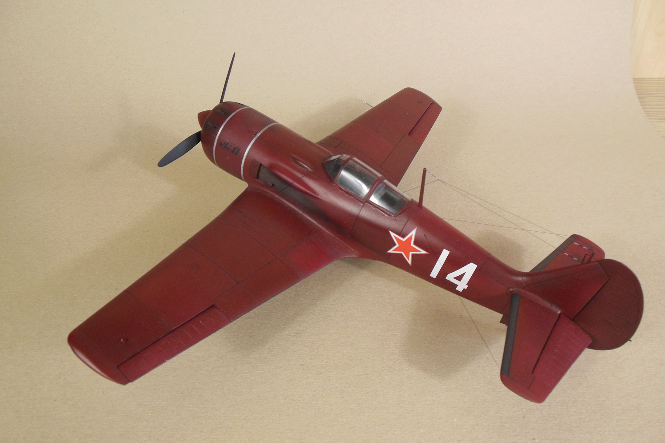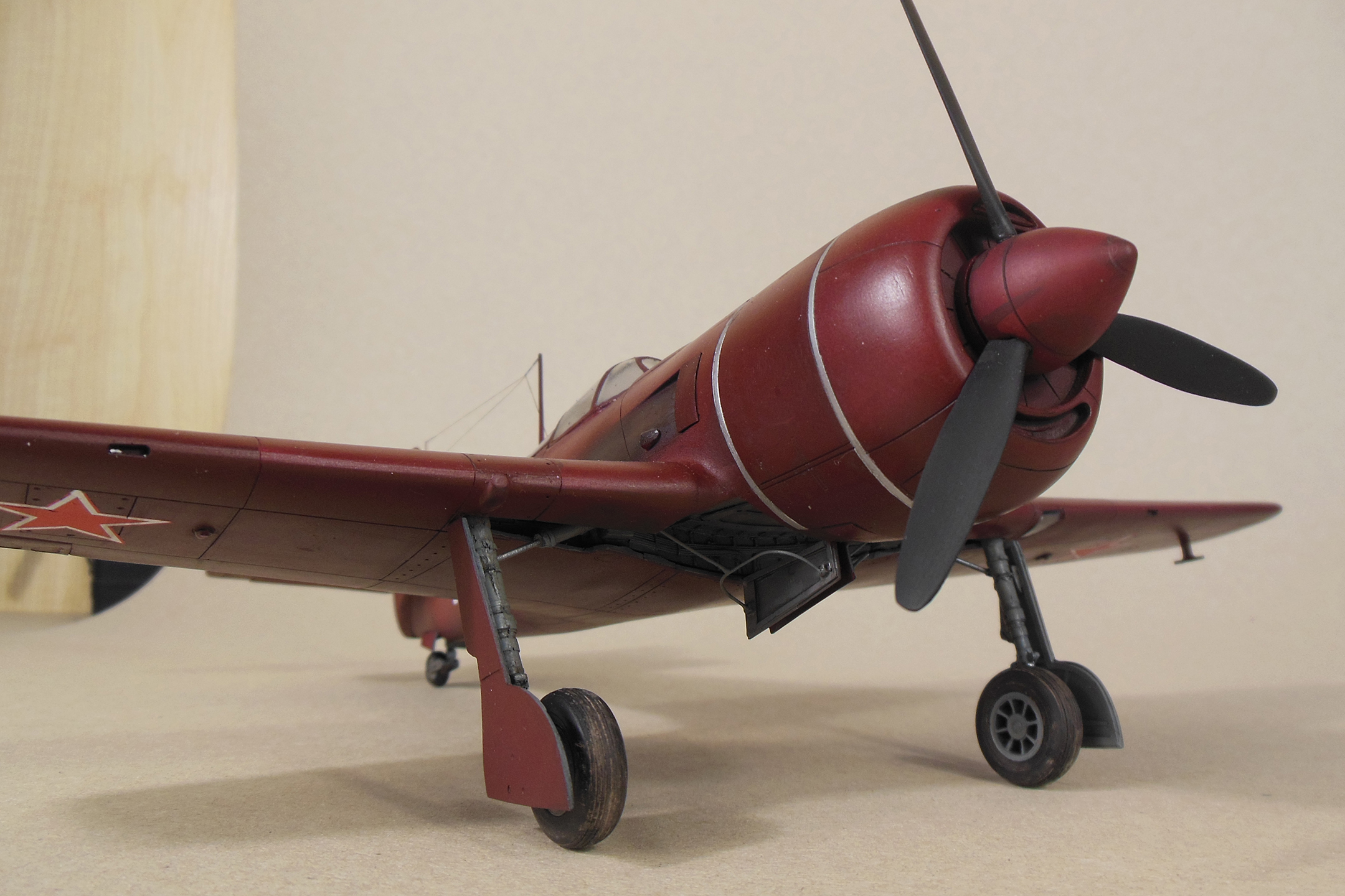 Кабина собирается моноблоком и вклеивается в фюзеляж, дается пленка с имитацией приборной доски, которую традиционно лучше сточить до приемлемой толщины, и прочее внутреннее убранство такое как кресло, прицел и т.д. Фонарь дается в двух экземплярах. Ниша также вклеивается в фюзеляж, для ее установки необходимо доработать нижнюю часть фюзеляжа. Консоли сделаны полыми для облегчения конструкции, также в них делаются вырезы для установки ниш основных стоек шасси. Трудностей в сборке не возникло, все стыкуется хорошо, кое-где использовал шпатлевку. В окраске пошел по новому, не апробированному мной пути, чтобы показать как-то игру панелей планер грунтовал белой (TAMIYA) и черной (Mr.Hobby) грунтовками, а после уже окрашивал красной, которая имея слабую укрывистость просвечивала белый грунт создавая тем самым «панельный» эффект. Мачты антенны традиционно выпилены из металла для живучести, просверлен ввод в задней части фонаря, БАНО от ЭЛЬФа, стяжные ленты на капоте окраска под алюминий, в этот раз их не стал делать как на Ла-9РД из фольги, антенна – нить с имитацией изоляторов. Декаль из набора отличного качества, тонкая и хорошо переводится без применения каких-либо вспомогательных жидкостей. Для страховки дунул ее лаком. На капоте имеется характерный знак 21 завода «ЛА-11», который идет в наборе. Фотографирование проходило в два этапа, декаль «Ла-11» запорол, пришлось переделывать, поэтому первые фотки еще без нее. Несколько фото из процесса, кабины, как и от Ла-9 РД нет, извиняйте. Приятного просмотра.