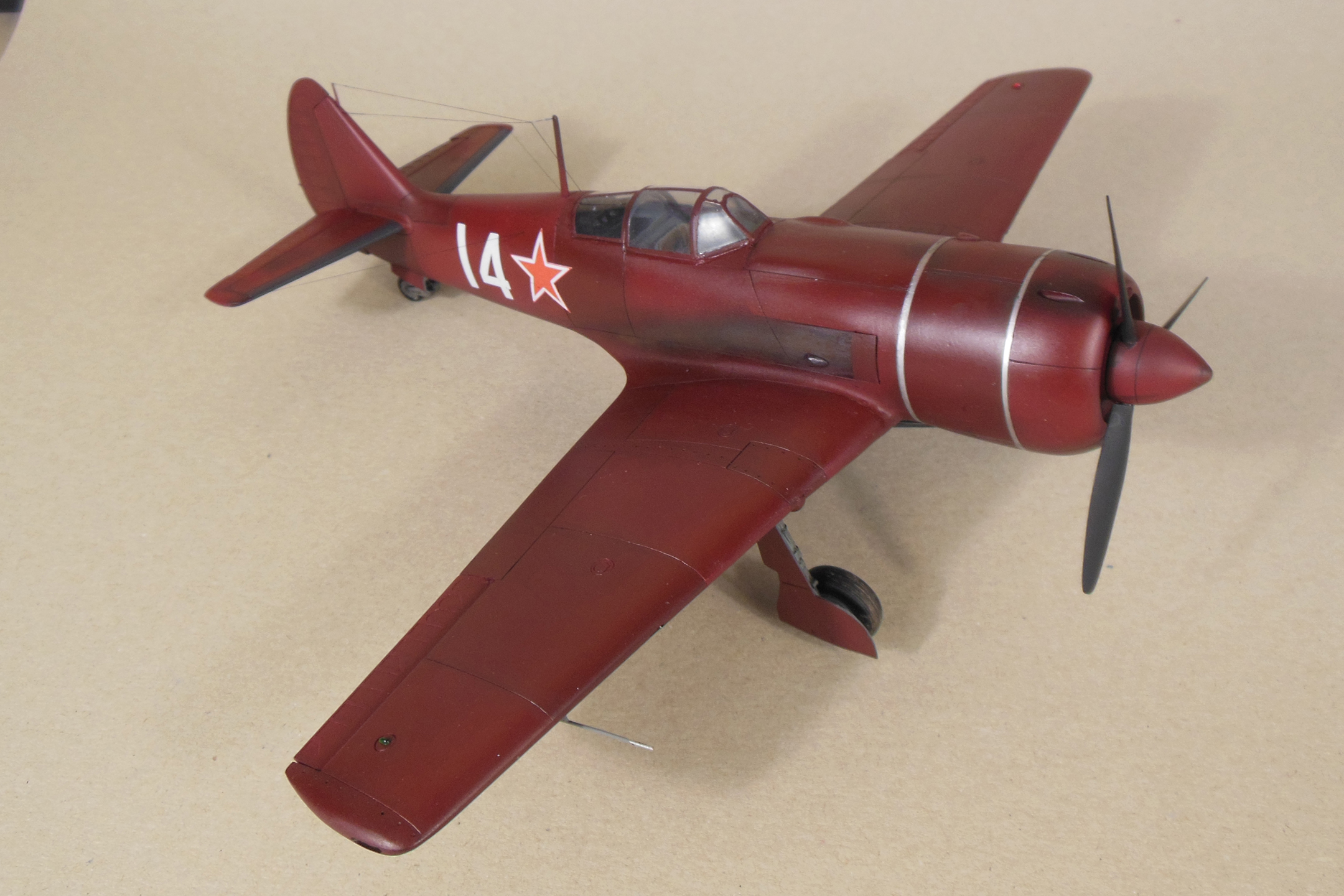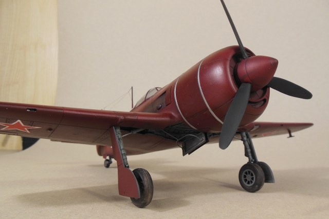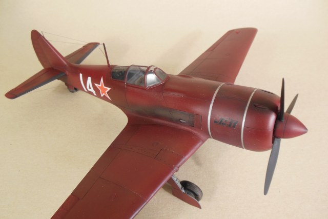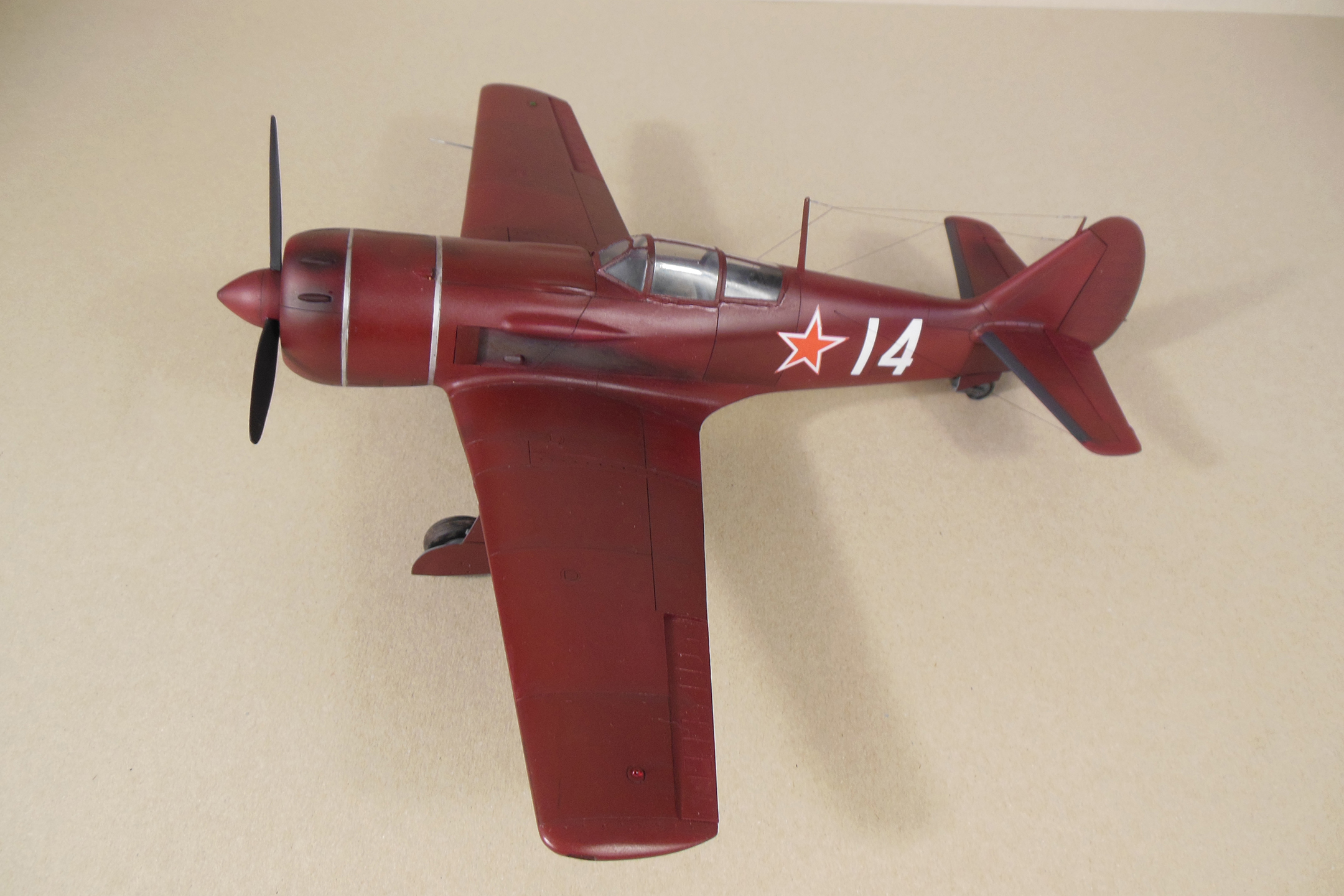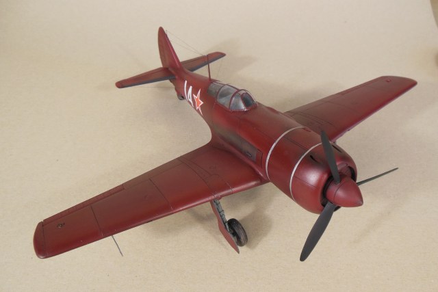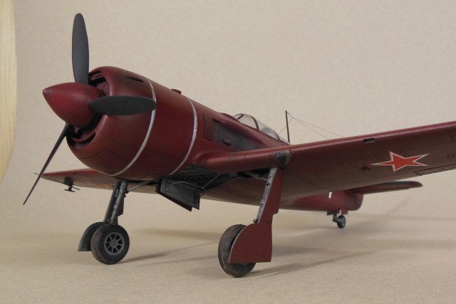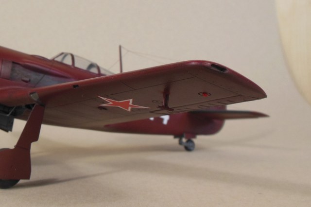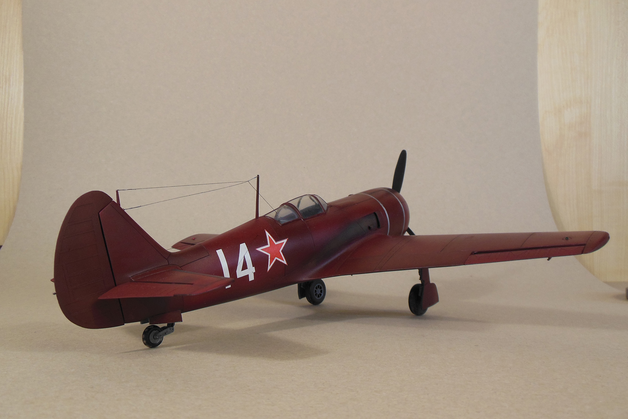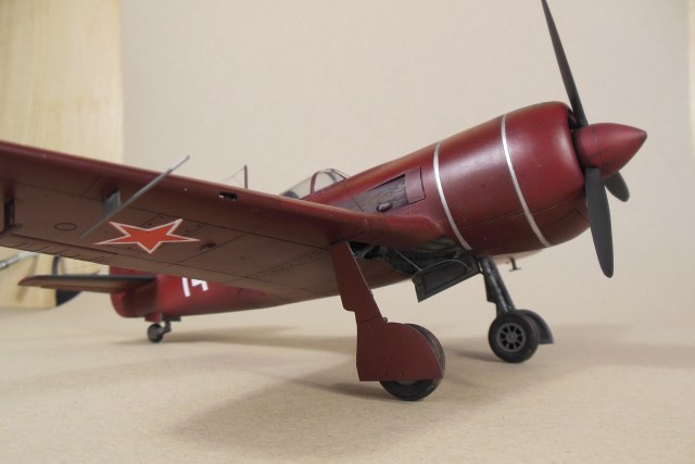 Кабина собирается моноблоком и вклеивается в фюзеляж, дается пленка с имитацией приборной доски, которую традиционно лучше сточить до приемлемой толщины, и прочее внутреннее убранство такое как кресло, прицел и т.д. Фонарь дается в двух экземплярах. Ниша также вклеивается в фюзеляж, для ее установки необходимо доработать нижнюю часть фюзеляжа. Консоли сделаны полыми для облегчения конструкции, также в них делаются вырезы для установки ниш основных стоек шасси. Трудностей в сборке не возникло, все стыкуется хорошо, кое-где использовал шпатлевку. В окраске пошел по новому, не апробированному мной пути, чтобы показать как-то игру панелей планер грунтовал белой (TAMIYA) и черной (Mr.Hobby) грунтовками, а после уже окрашивал красной, которая имея слабую укрывистость просвечивала белый грунт создавая тем самым «панельный» эффект. Мачты антенны традиционно выпилены из металла для живучести, просверлен ввод в задней части фонаря, БАНО от ЭЛЬФа, стяжные ленты на капоте окраска под алюминий, в этот раз их не стал делать как на Ла-9РД из фольги, антенна – нить с имитацией изоляторов. Декаль из набора отличного качества, тонкая и хорошо переводится без применения каких-либо вспомогательных жидкостей. Для страховки дунул ее лаком. На капоте имеется характерный знак 21 завода «ЛА-11», который идет в наборе. Фотографирование проходило в два этапа, декаль «Ла-11» запорол, пришлось переделывать, поэтому первые фотки еще без нее. Несколько фото из процесса, кабины, как и от Ла-9 РД нет, извиняйте. Приятного просмотра.