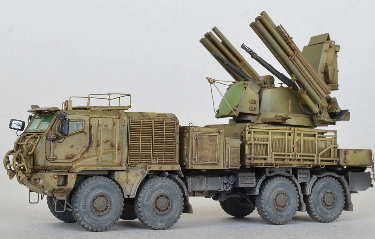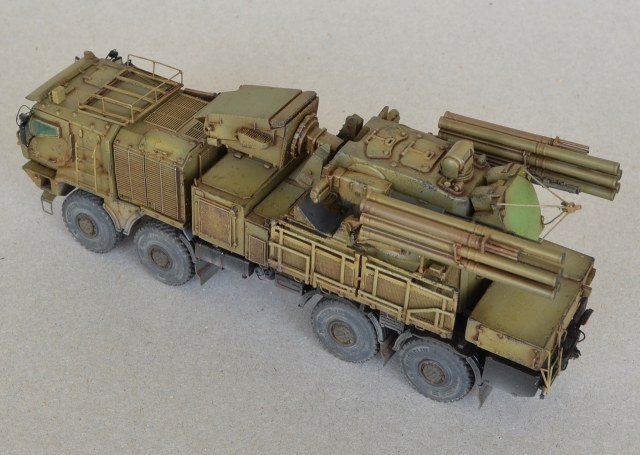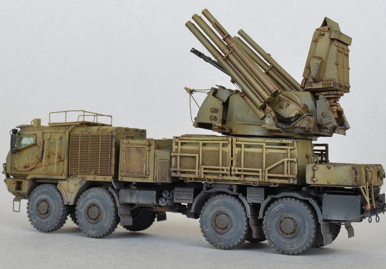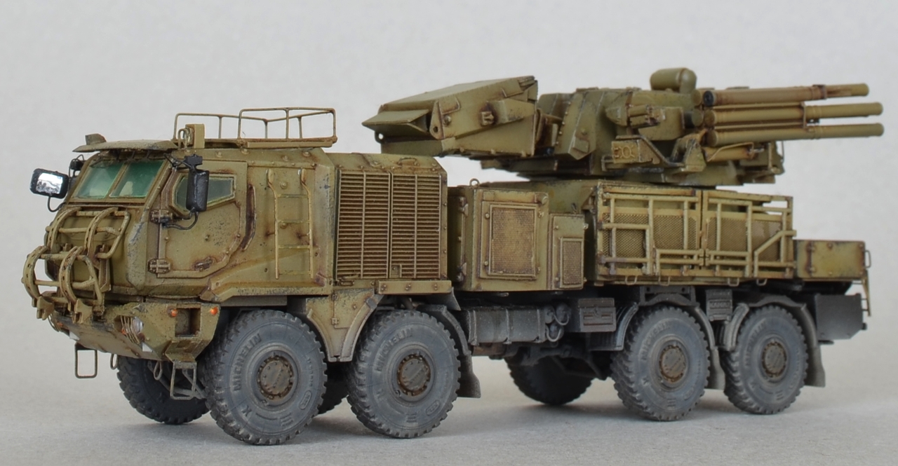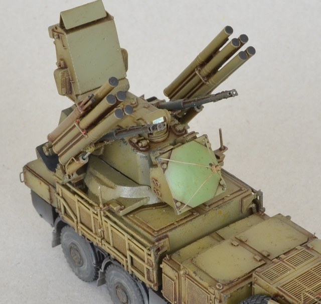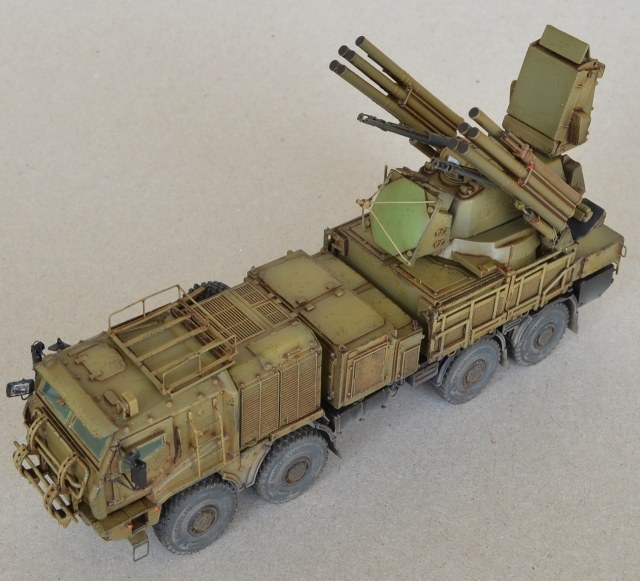 - Всем добрый день.Еще один Панцирь от W-Model .Собирается все неплохо.Из минусов набора это отсутствие остекления и упрощенная ходовая сетки могли бы быть травленые а так пришлось их заменять .Так же сделал рабочим механизм подъема ракетной установки и антены.Ручки изготовил из проволки.Стекло из зеленой пленки.