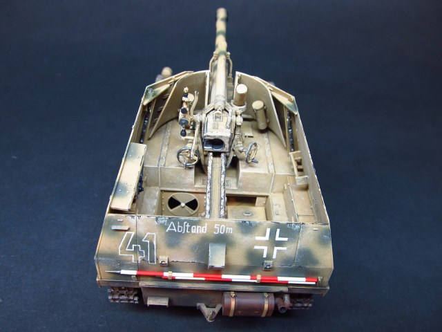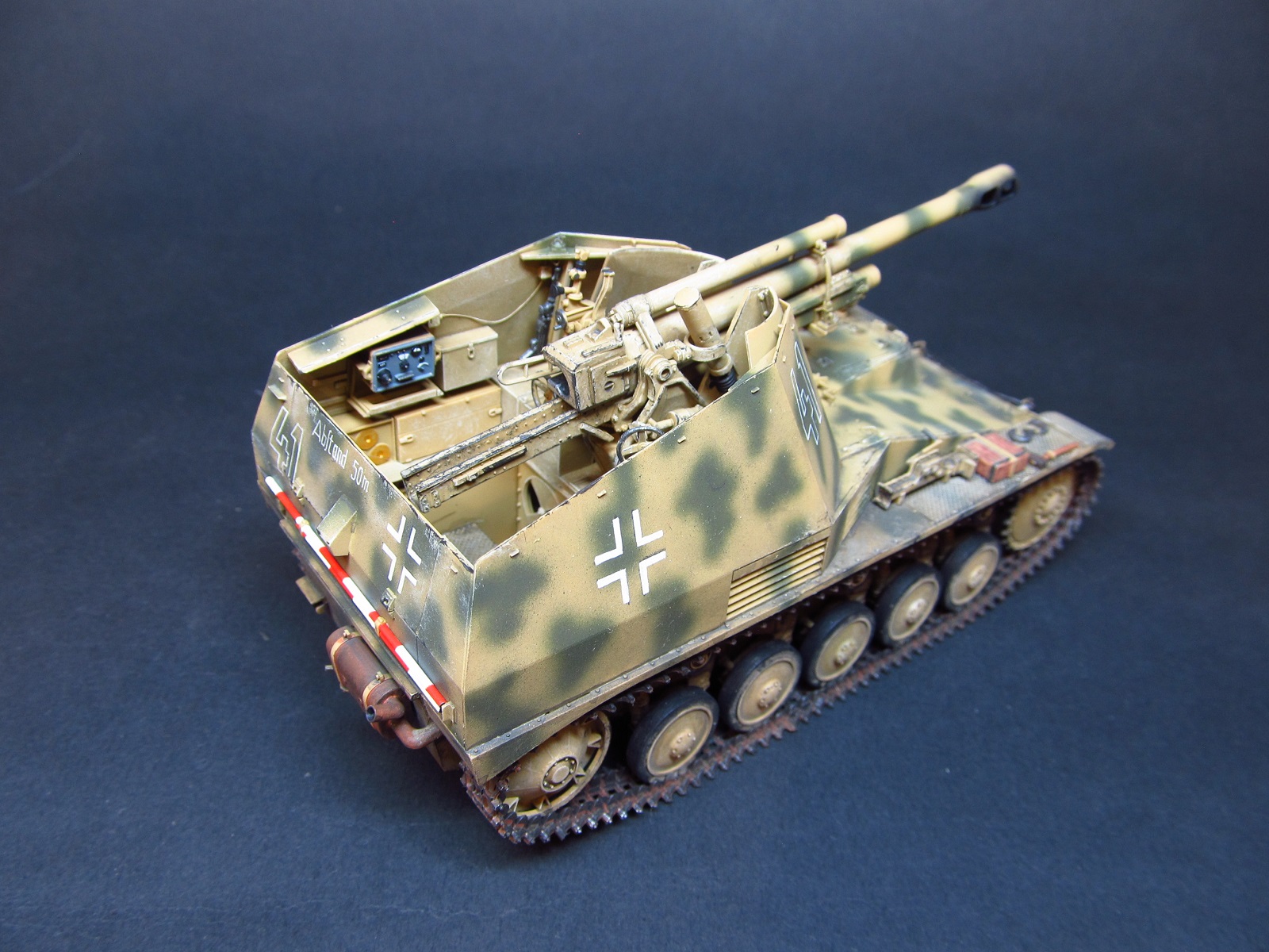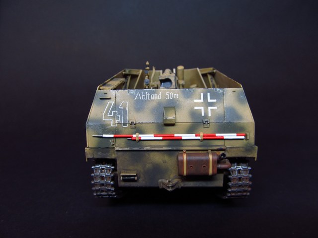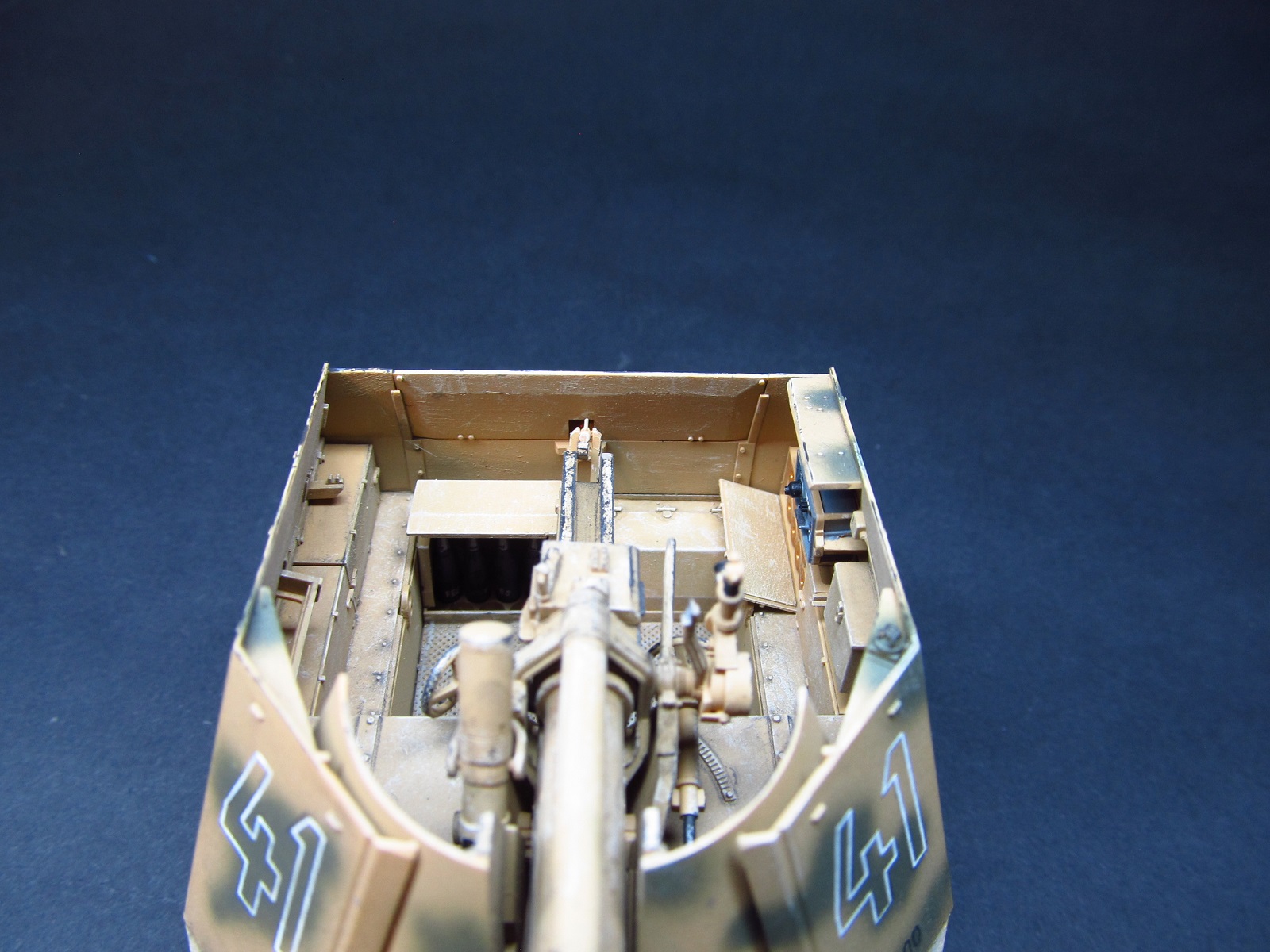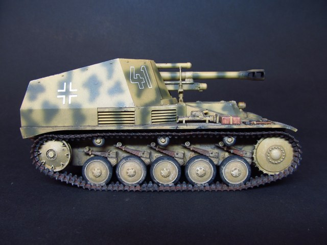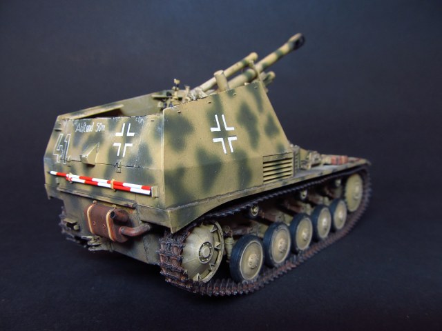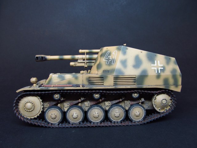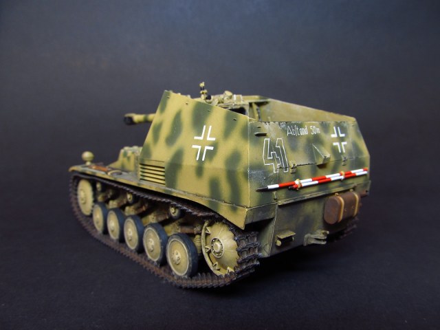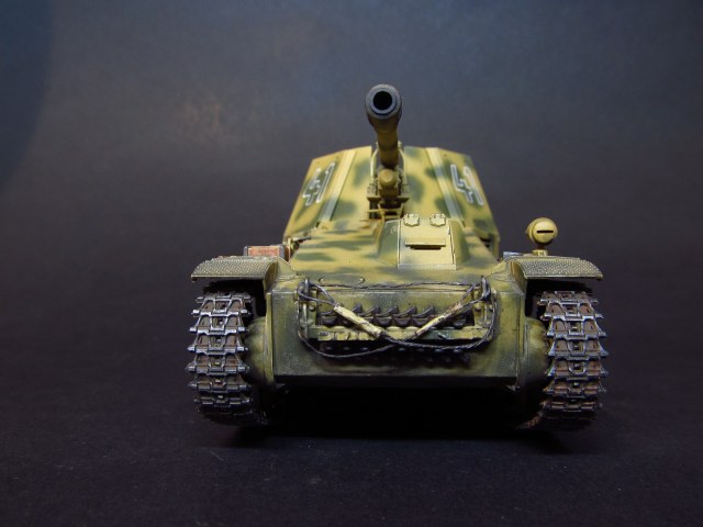 Красил модель самодельными акриловыми красками (Dunkelgelb и зеленые пятна камуфляжа) и акриловыми же красками от "Звезды". Учитывая пожелания заказчика, сильно измазывать модель имитацией грязюки не стал, ходовую чуть испачкал и припылил смесью художественных соусов. При нанесении тактических знаков и рисунка камуфляжа старался ориентироваться на фотографии реальной машины из состава дивизии "Великая Германия" на период ее участия в битве на Курской дуге в июле 1943 года. Номера-кресты- надписи наносил кистью.