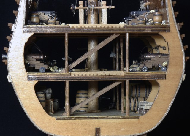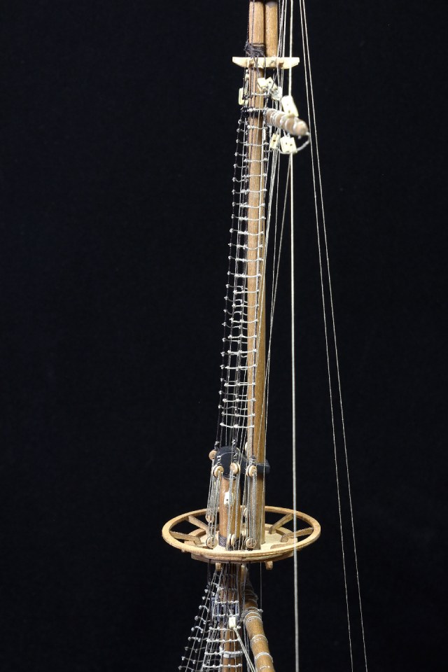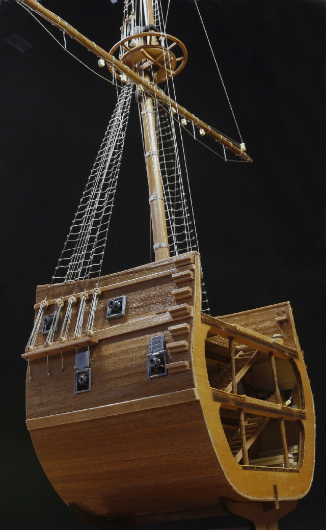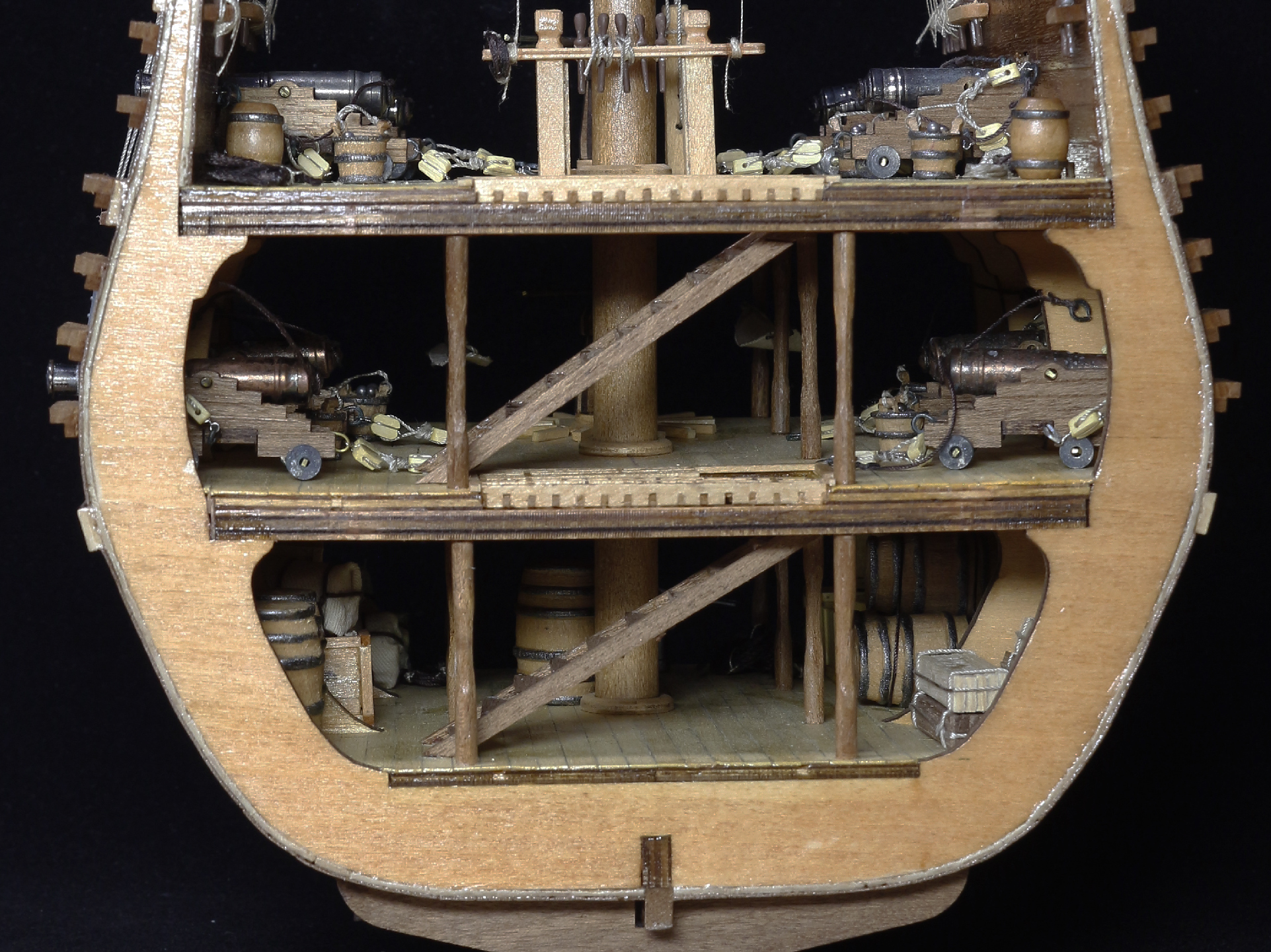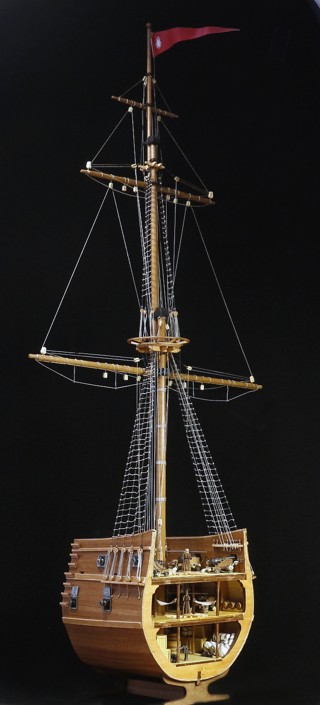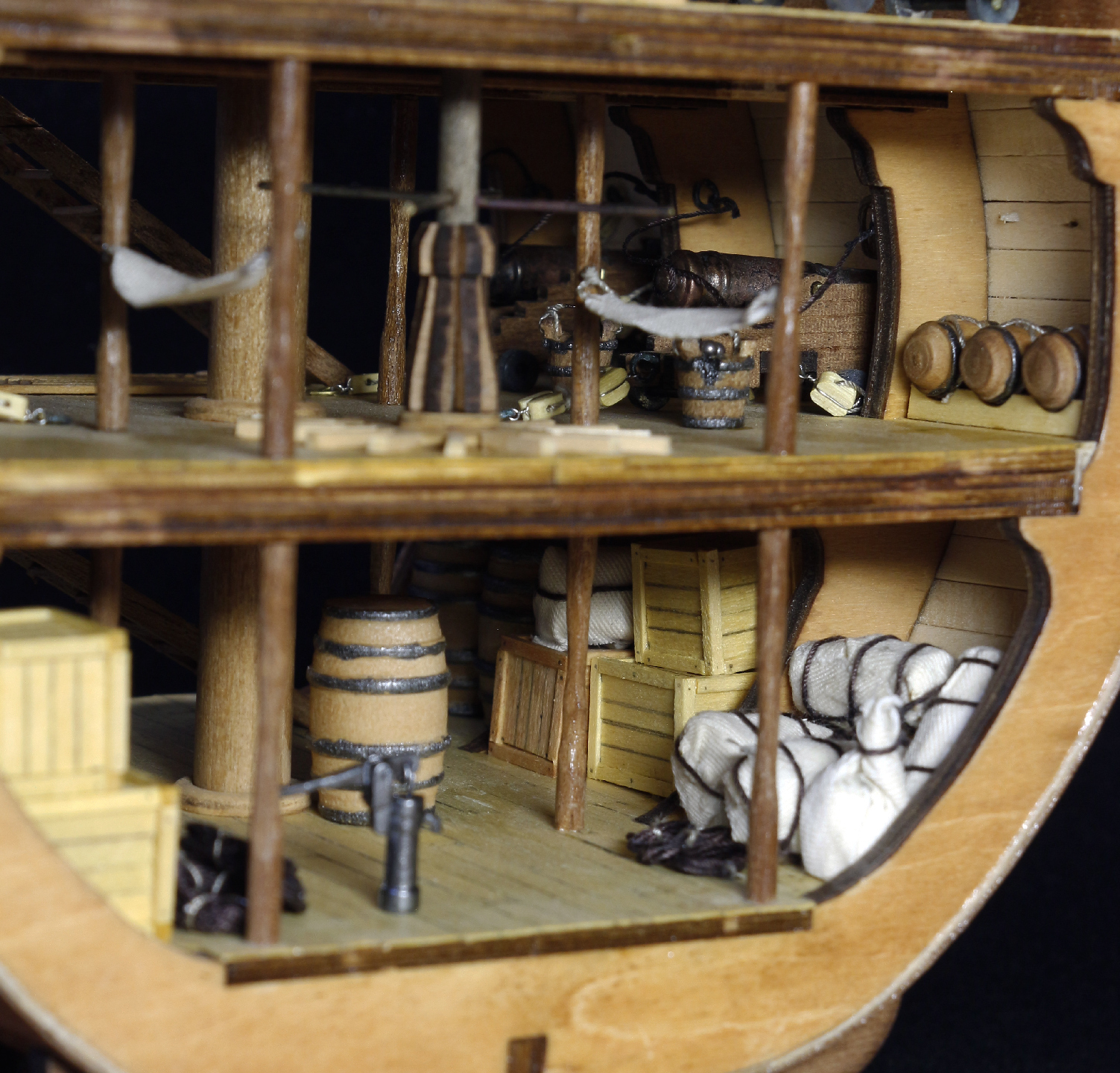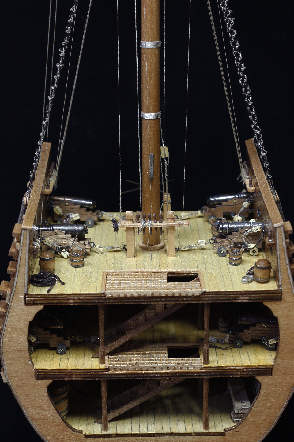Ну, я бы поостерегся со словами "музейный экспонат". Работа надо признать чистенькая, аккуратная,но....Вот здесь начинается это самое "НО". Во-первых наглая фанера шпангоутов. Можно было шпоном изобразить состав шпангоута из элементов. Масштаб позволяет.Остальное дерево нареканий не вызывает. Подогнано и прилажено вполне неплохо.А вот теперь о такелаже. Ванты тонкие.выбленки слишком белые.Юферсы стоят как попало,а отсутствие ворста позволяет верхним юферсам крутится куда хочется.И запасовка по принципу "сойдет и так".И блоки остальные / не все, что странно/ неправильно заправлены. Устал повторять."Веревка" проходит ПО ШКИВУ,а не под ним.Брюк на пушках очень тонкий. Тоньше даже чем накатные тали. А вот потенциал у автора есть. Галерея с пожеланием "расти над собой" /шутка/ ЗБЗ
