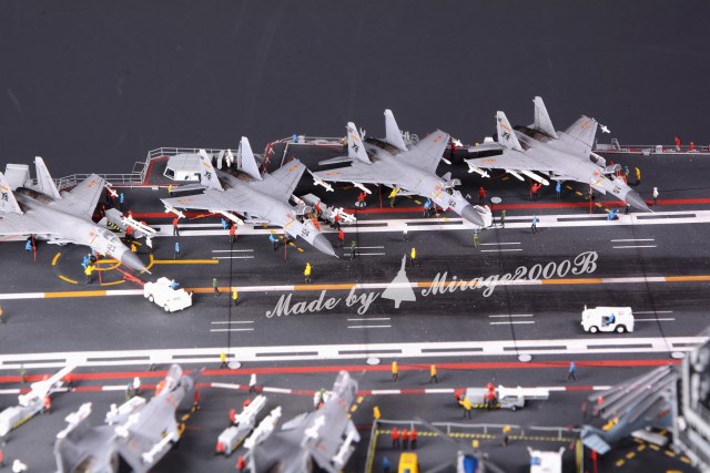 Using Trumpter's liaoning plate, the plastic plate rebuilt the hull structure and self-made the hull support, designed the matching island prints and etched parts, as well as the printing of ground crew vehicles and airborne missiles for individual ground crews, etc. pieceAt the same time, the entire internal structure of the hangar with LED lights was completely self-made. The carrier-based aircraft cut the entire canopy on the basis of trumpter's 1/350 SU27K, finely separated the engine heat shield, and made the aircraft cockpit and power outage. aerodynamic surface