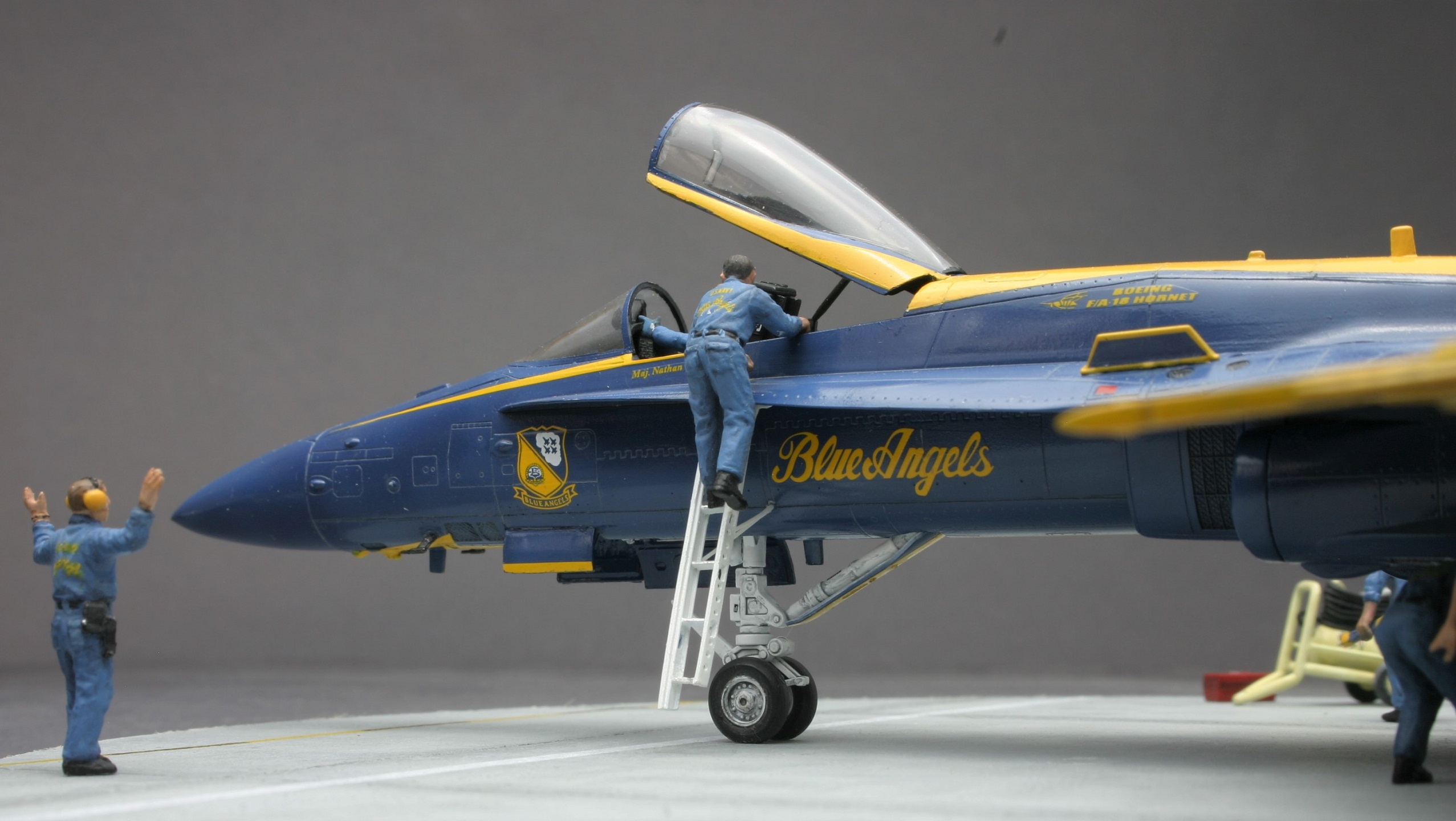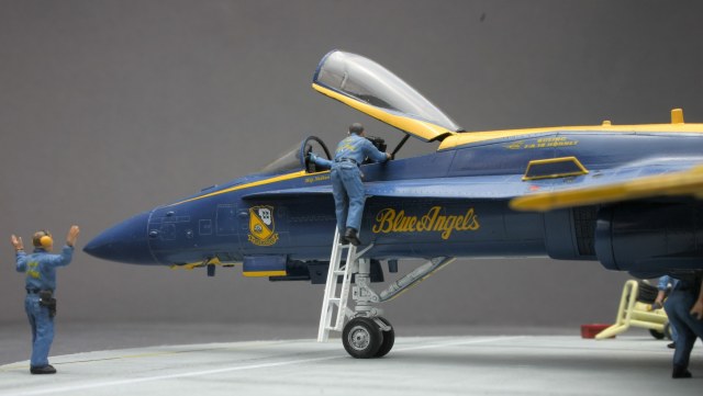 Предлагаю Вашему вниманию всем известную модель всем известной пилотажной группы. Набор из закромов который приобрел аж в 12м году...)) Выпускался он в специальной серии и предлагает в декали варианты пилотов 2009-2010 годов. Все из коробки. Немного дополнил фонарь и сделал стремянку по фото. Модель собрал прошлом году ну а в этом решил дополнить диорамой. Пилота техников огнетушитель тех.ящик использовал из набора Hasegava Х72-7 35007. За неимением декалей на весь тех.персонал эмблемы и надписи пришлось красить самому...) Краски и лак Mr. Hobby, смывки Tamiya. Базовый цвет использовал Blue 328 (FS15050 US NAVY BLUE ANGELS). На фото под освещением смотрится светлее чем при дневном свете. Набор оставил самые приятные впечатления. Минимум шпаклевки. Комбинировал декали и подкраску. Декаль "Голубые Ангелы" сбоку на фюзеляже ушла чуть выше при позиционировании относительно эмблемы и намертво приварилась...)) Да простят меня Ангелы)).
