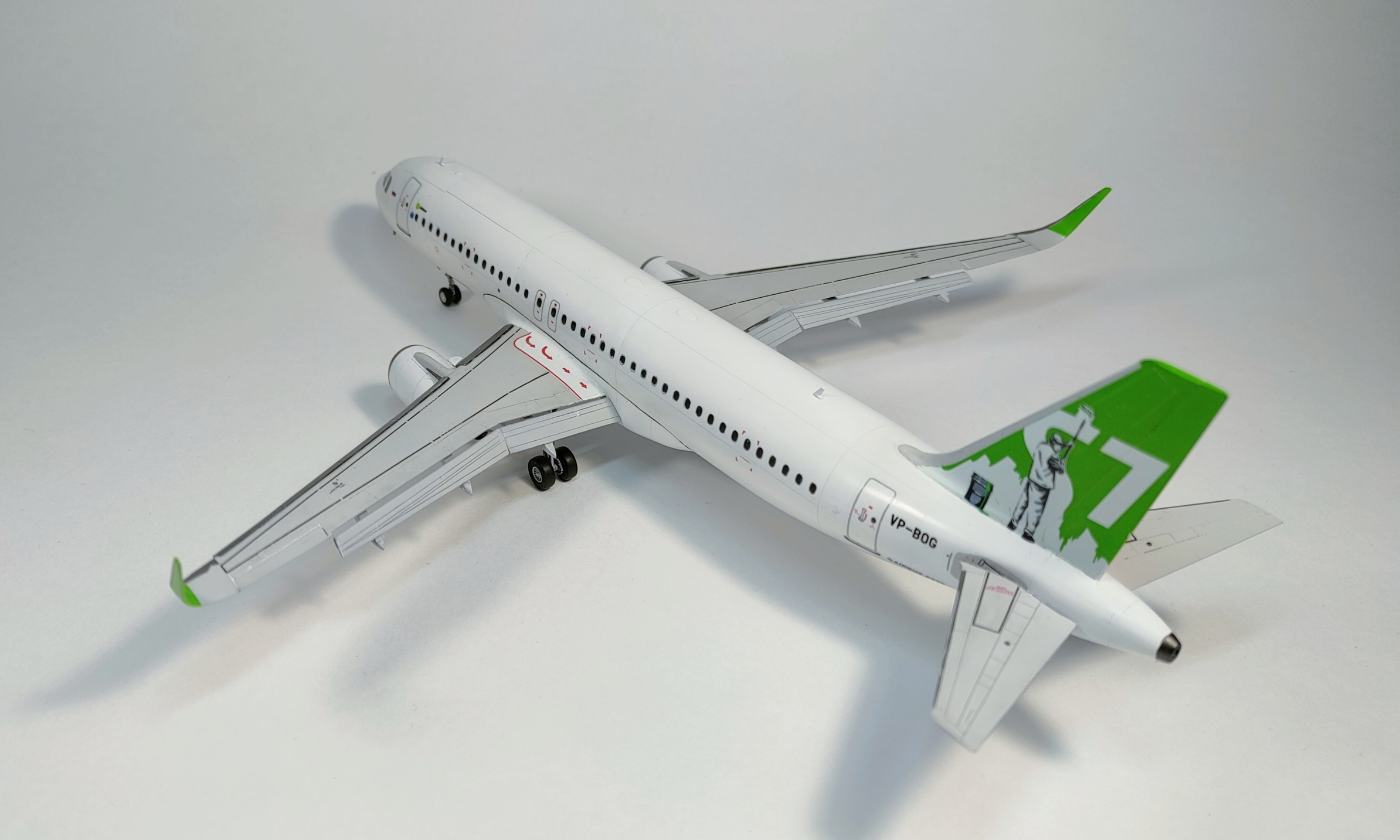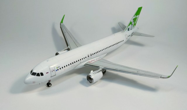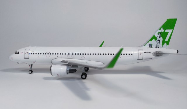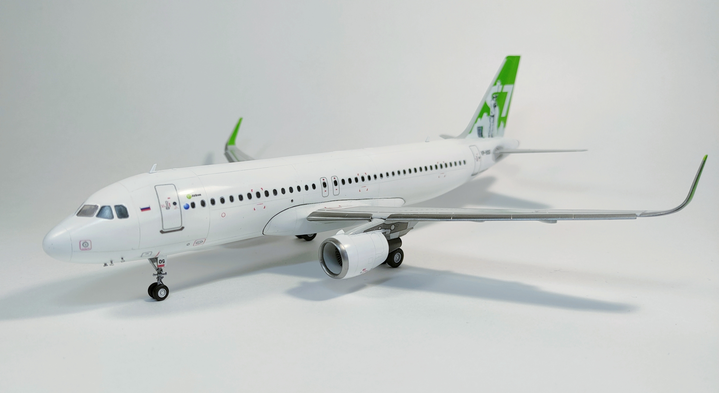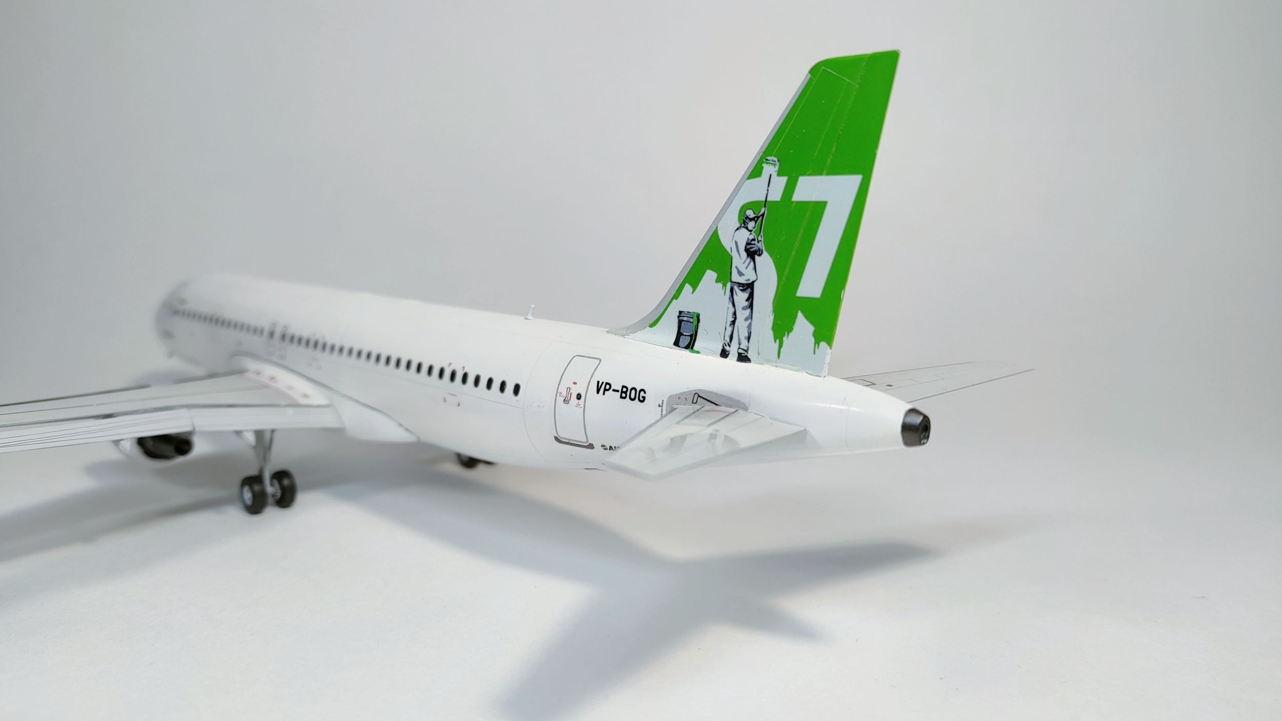 Здравствуйте коллеги. Закончил сборку модели в необычной ливрее S7 airlines. Сборка особых проблем не вызвала, самым сложным местом стал стык фонаря кабины. При сборке использовал некоторые элементы травления. Окраска нитрой от Gunze, зелёный на киле и винглетах - H16. Маски от Arma Models. Декали Ascensio. После финишного лака прошёлся тамиевской полиролью. Сборку освещал на форуме. Готов ловить помидоры))