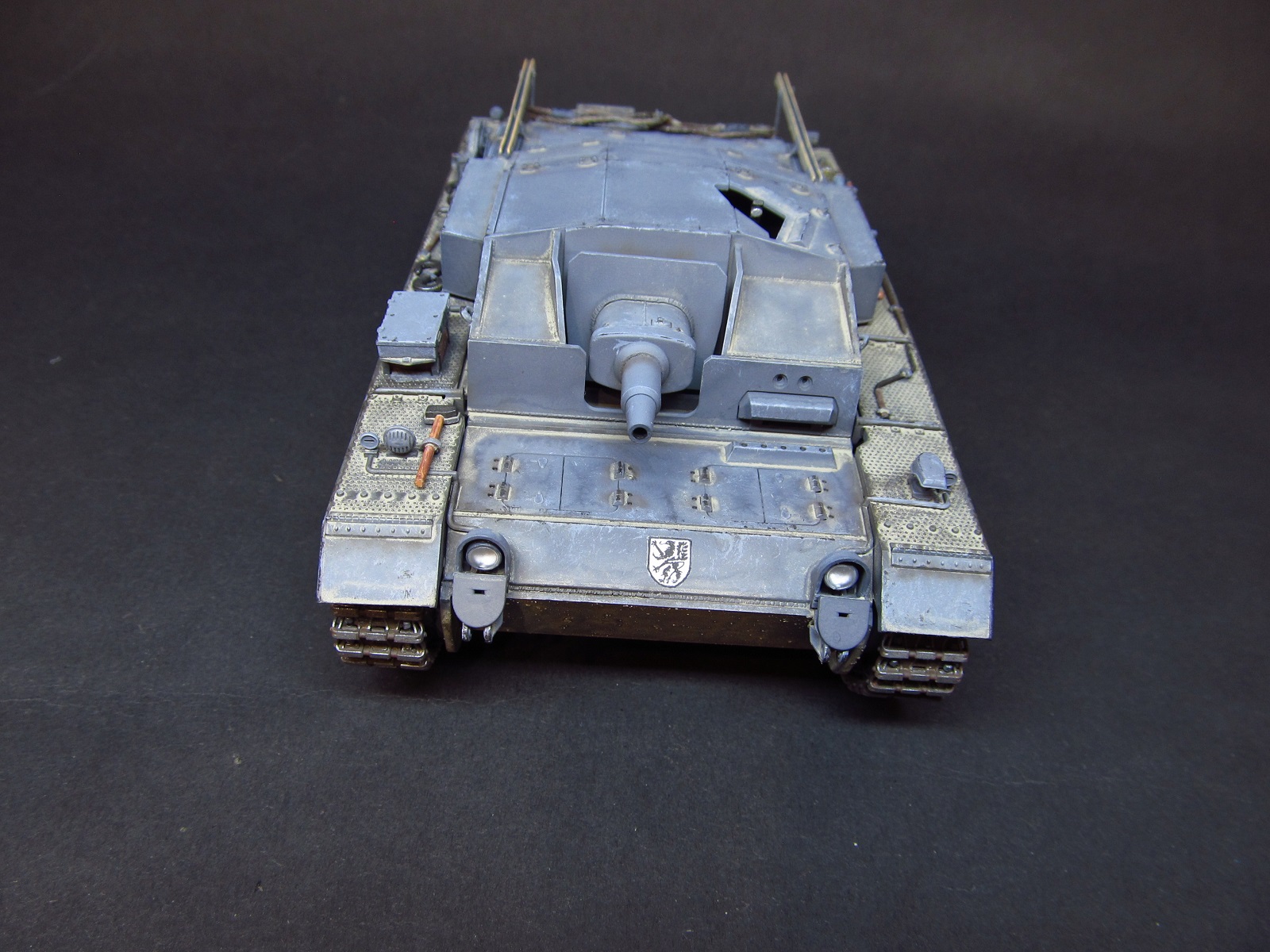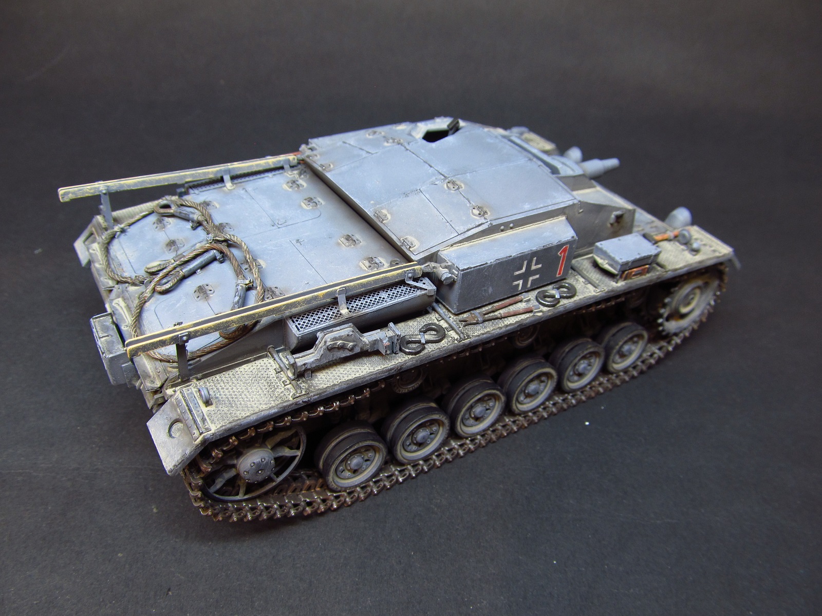 Хороший Штуг.Потертости на ложементах антенн добавляют реалистичности.Вот только кроме защиты фар толщина задних брызговиков,в местах отверстий для фонарей тоже бросается в глаза.И трос явно толстоват.А изготовить заслонки защиты фар и сейчас не поздно.Остатки плат травления или консервная жесть в помощь.С уважением.