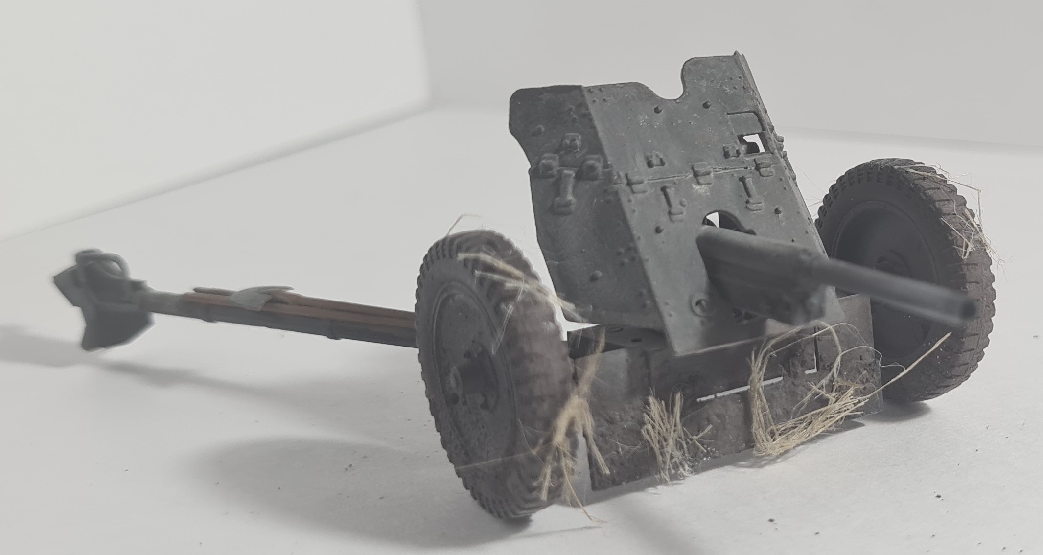 По сборке видны не убранные следы от толкателей и не обработанные стыки половинок деталей. Колеса "в развалку". Нет ремней, удерживающих шанец на станине. Распорки от качающейся части к щиту не посажены на свои места. На рукоятках станин не сточены приливы, удерживающие детали на литнике. Более того, они (рукоятки станин), похоже, приклеены не на свои места.