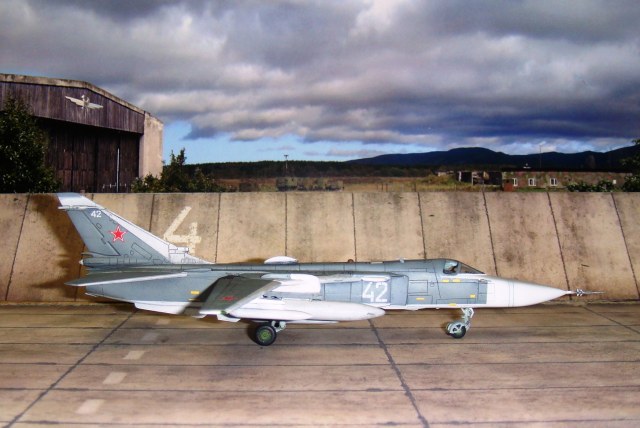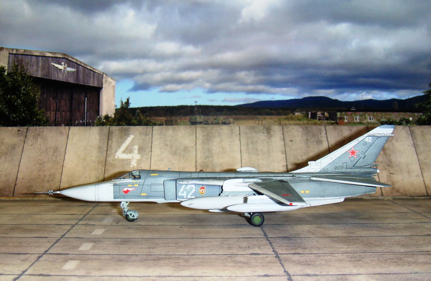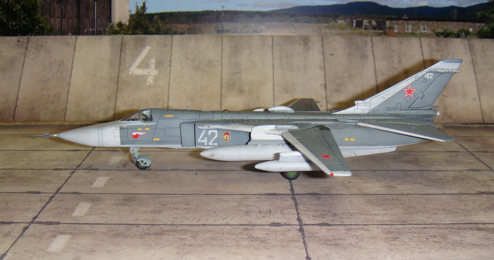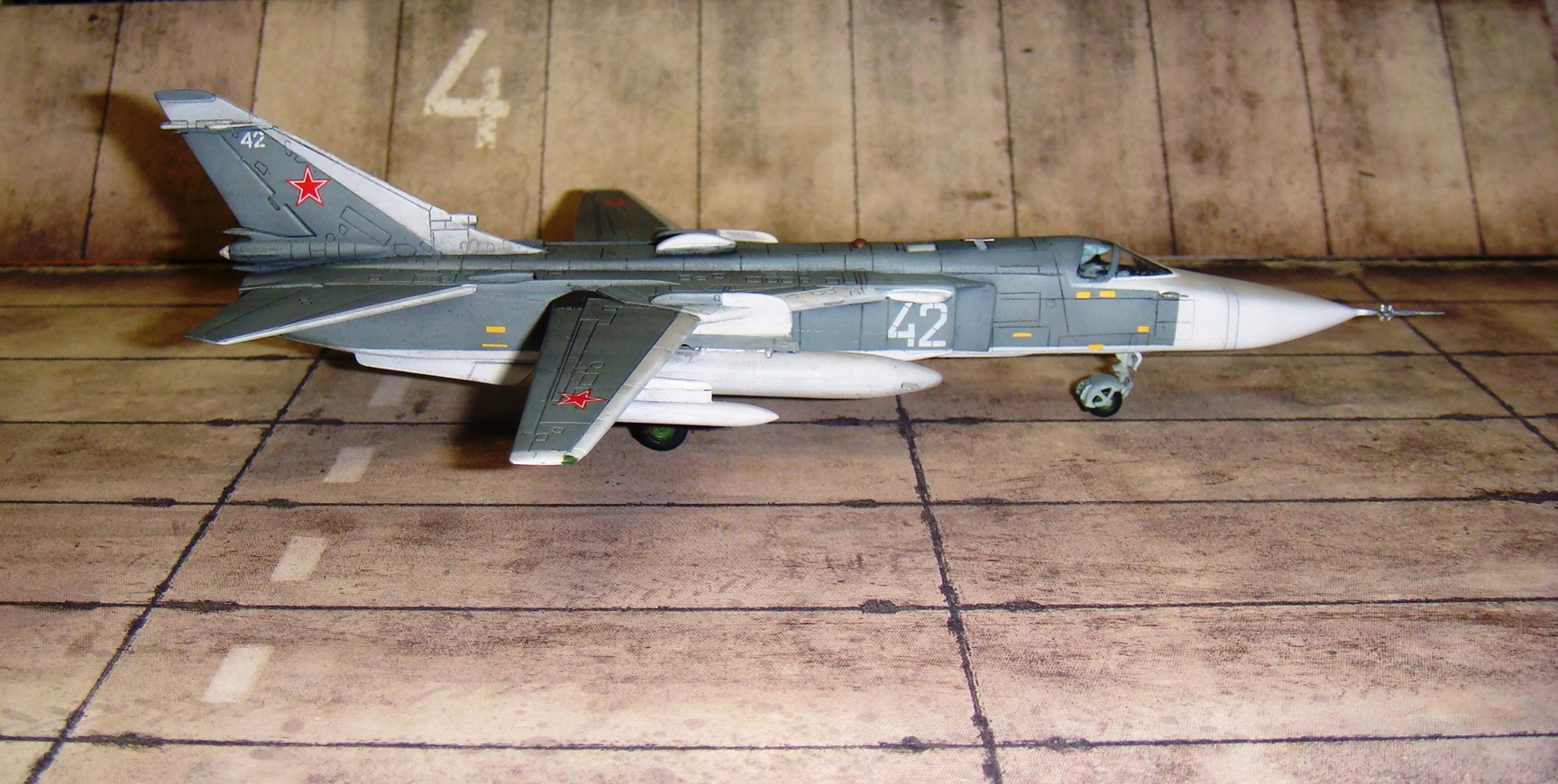 Доброго времени суток. Завершил работу над моделью Су-24 от Armory в 1/144. Собирал на заказ, полная изкоропка, без особого "фанатизма", задачи такой не стояло. Заказчик попросил просто собрать и установить его 42-ой номер на котором он сам летал. Сразу скажу, что я не спрашивал у заказчика где летал данный тип с этим номером. По самой модели, набор данного производителя мне не понравился, от слова совсем. При своем маленьком размере, расшивка очень большая и глубокая, задняя часть фюзеляжа отлита из смолы, фюзеляж разделен на много частей, что очень не удобно, для данного малого размера самой модели. В таком масштабе можно было бы сделать фюзеляж одной деталью. Это лично мое мнение на согласие со мной не претендую. Множественные щели и утяжины. Отливки деталей безобразные и не аккуратные. В общем отвратительный набор, когда собирался его делать думал, что он хороший, ошибся..... Больше его делать не возьмусь. Из дополнений сделал только ПВД, Антенну, за кабиной на верху фю