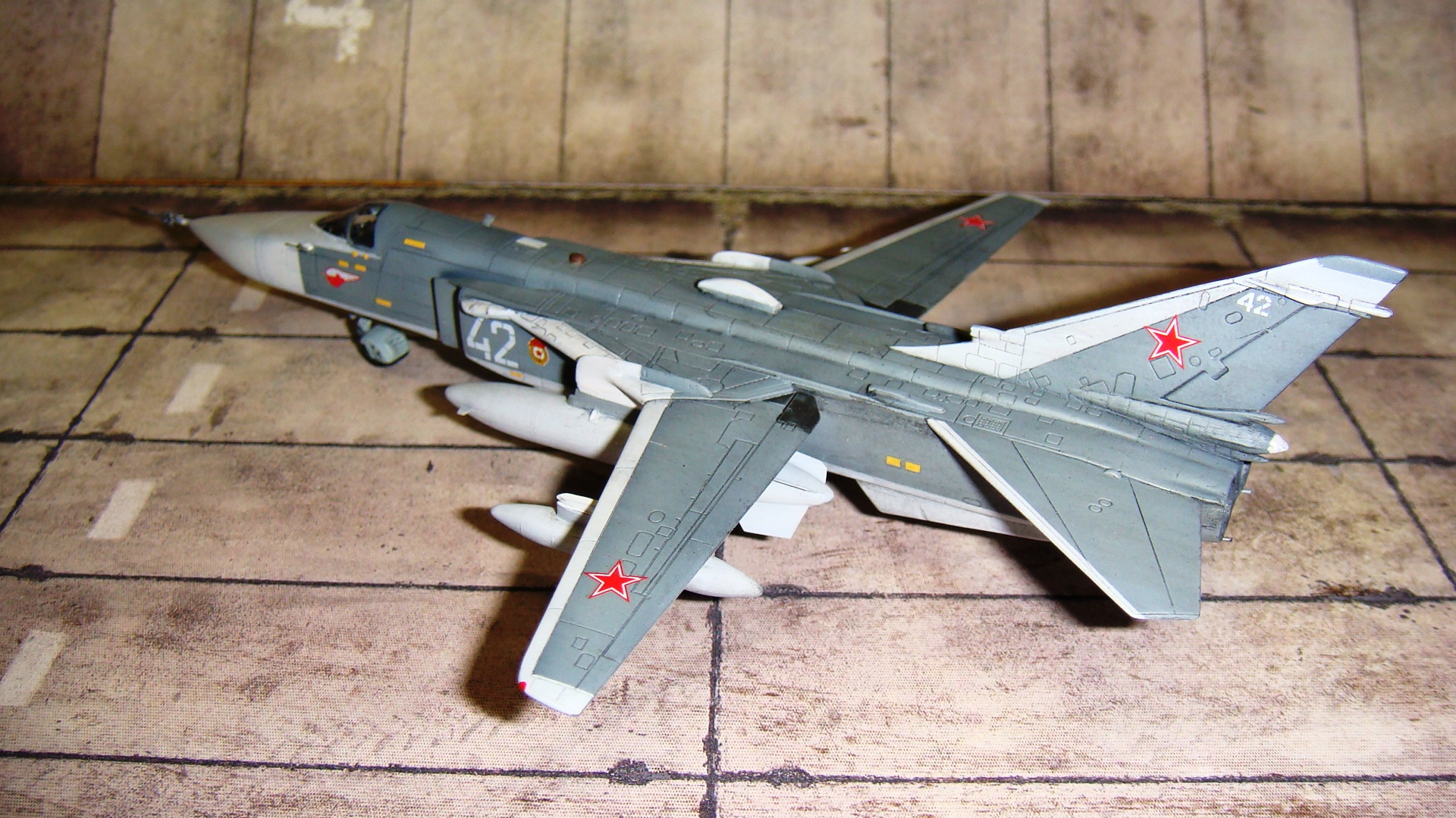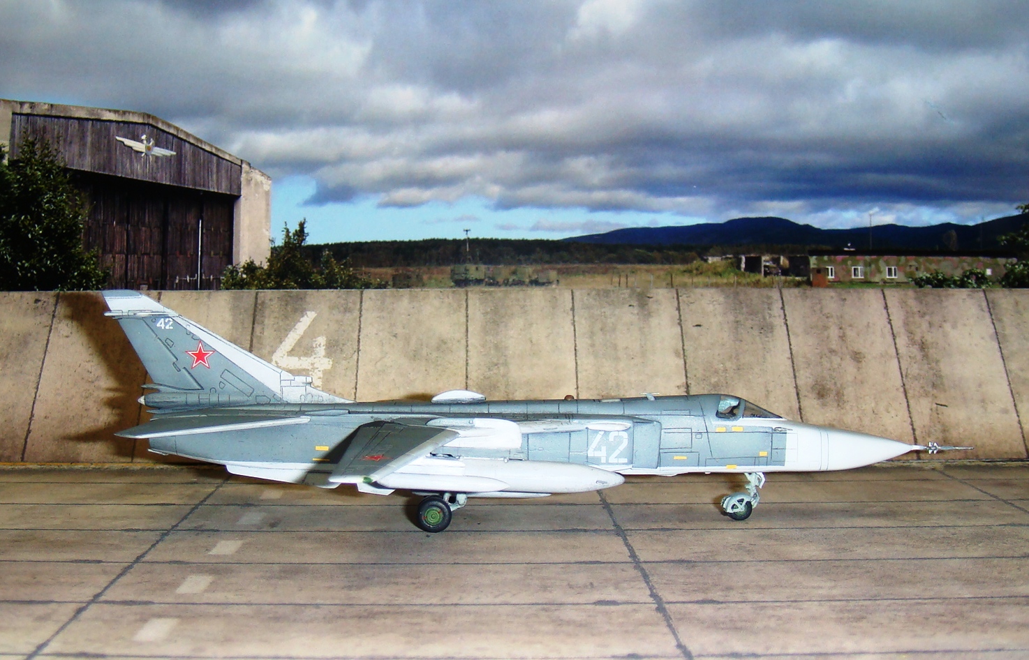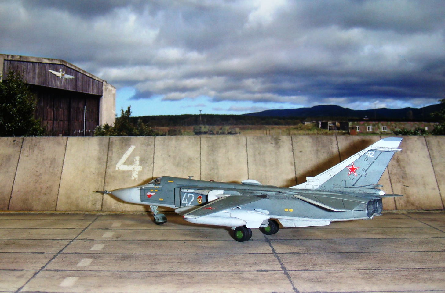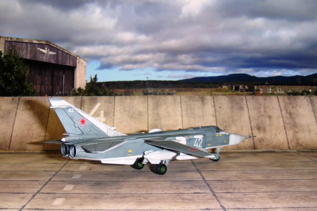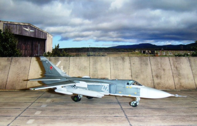 Доброго времени суток. Завершил работу над моделью Су-24 от Armory в 1/144. Собирал на заказ, полная изкоропка, без особого "фанатизма", задачи такой не стояло. Заказчик попросил просто собрать и установить его 42-ой номер на котором он сам летал. Сразу скажу, что я не спрашивал у заказчика где летал данный тип с этим номером. По самой модели, набор данного производителя мне не понравился, от слова совсем. При своем маленьком размере, расшивка очень большая и глубокая, задняя часть фюзеляжа отлита из смолы, фюзеляж разделен на много частей, что очень не удобно, для данного малого размера самой модели. В таком масштабе можно было бы сделать фюзеляж одной деталью. Это лично мое мнение на согласие со мной не претендую. Множественные щели и утяжины. Отливки деталей безобразные и не аккуратные. В общем отвратительный набор, когда собирался его делать думал, что он хороший, ошибся..... Больше его делать не возьмусь. Из дополнений сделал только ПВД, Антенну, за кабиной на верху фю