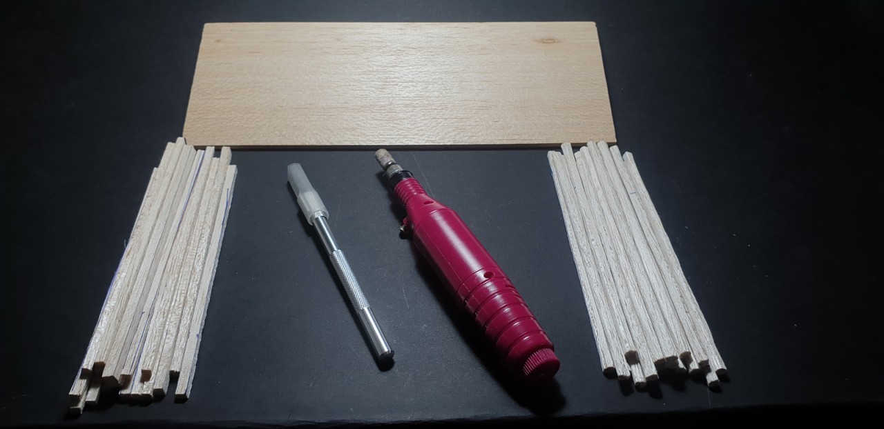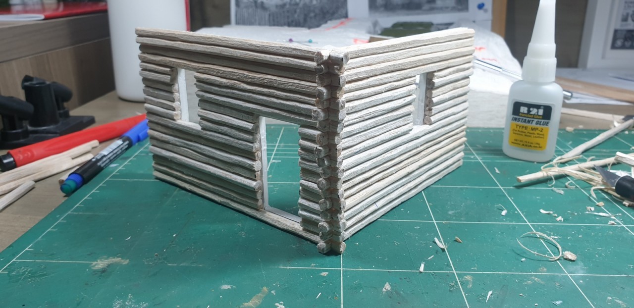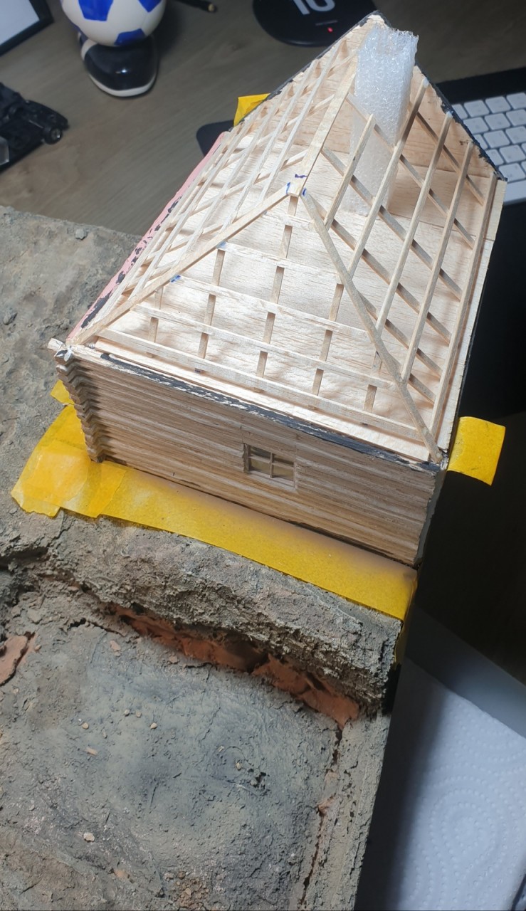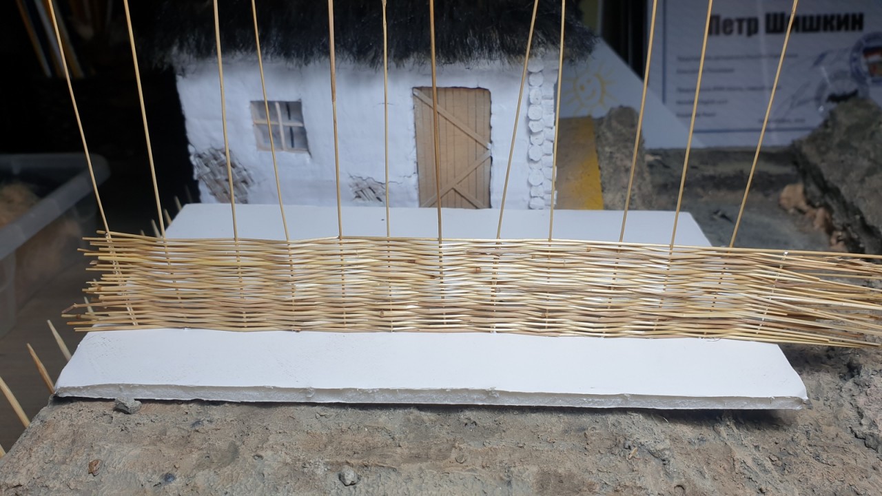 Хата изготовлена из бальзы и глины для лепки. Кровля из сантехнического льна.
