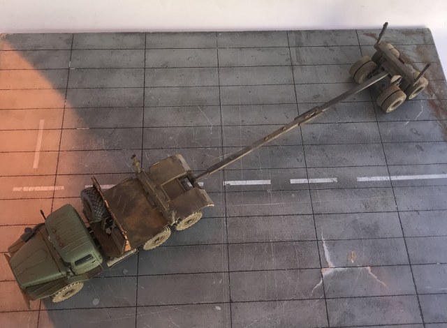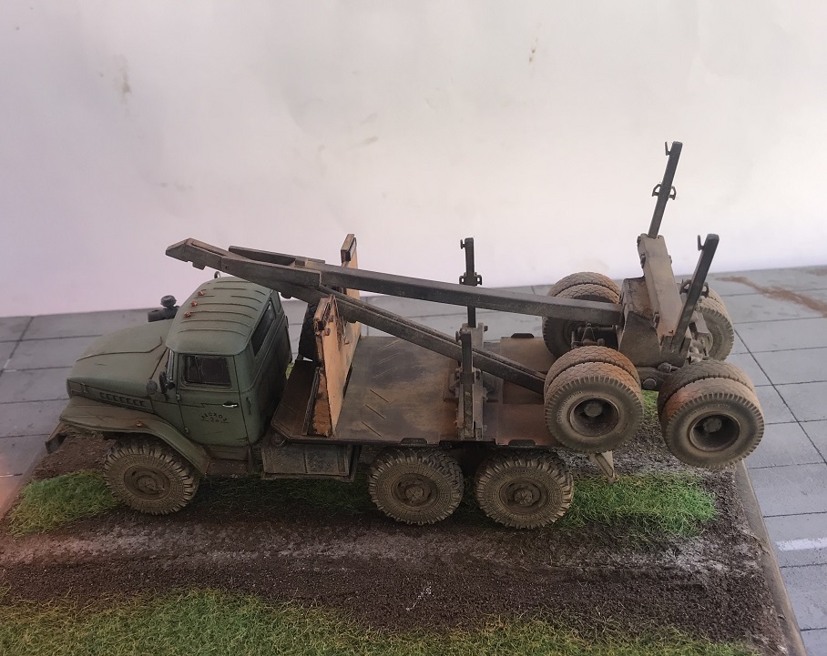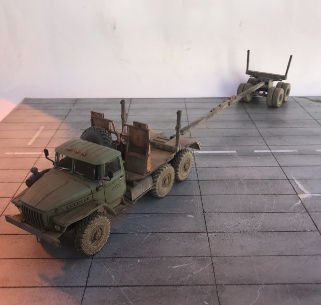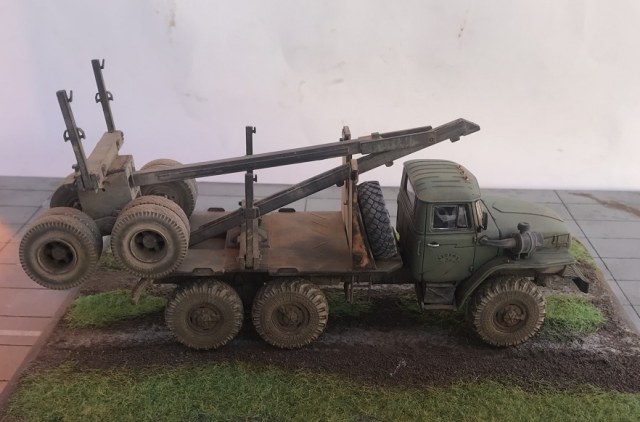 добрый день. модель классная. Не хватает только цепей и торосов на кониках. И когда прицеп на машине задняя ось, по-моему не должна висеть.